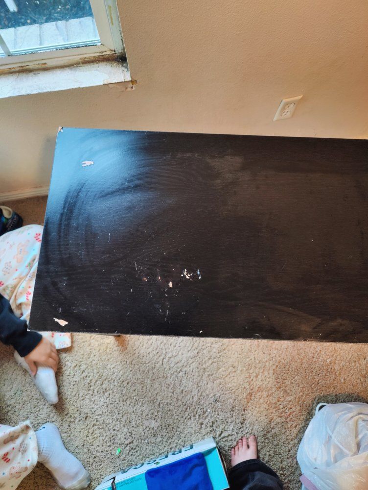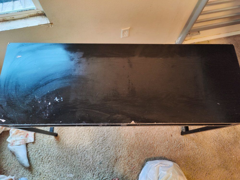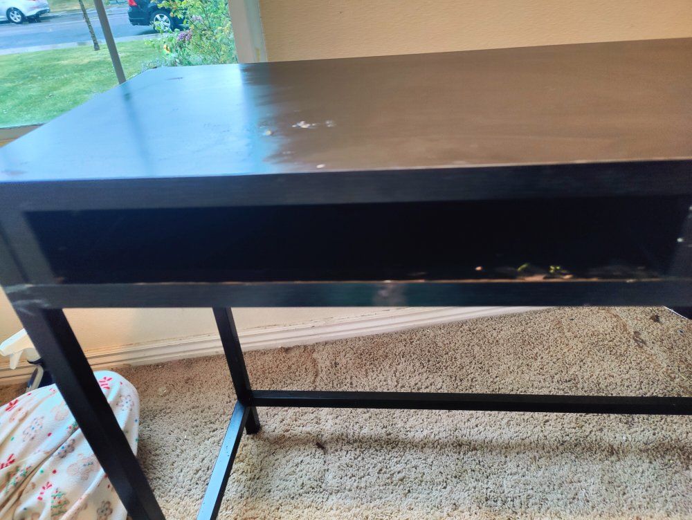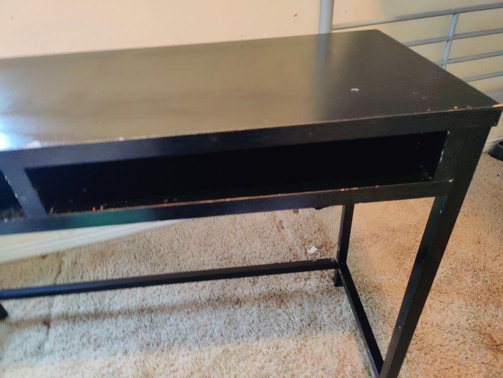 ZelleSmall black wood desk. My daughter used it as her computer desk and no longer needs it. It could use a fresh coat of paint but otherwise good little desk.