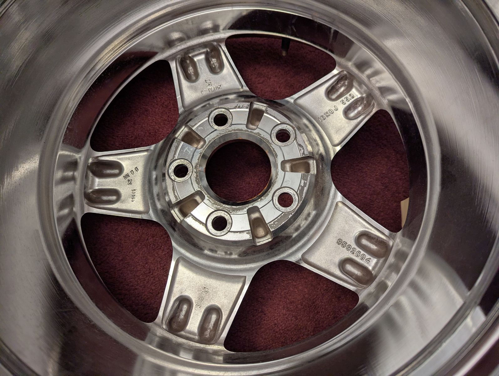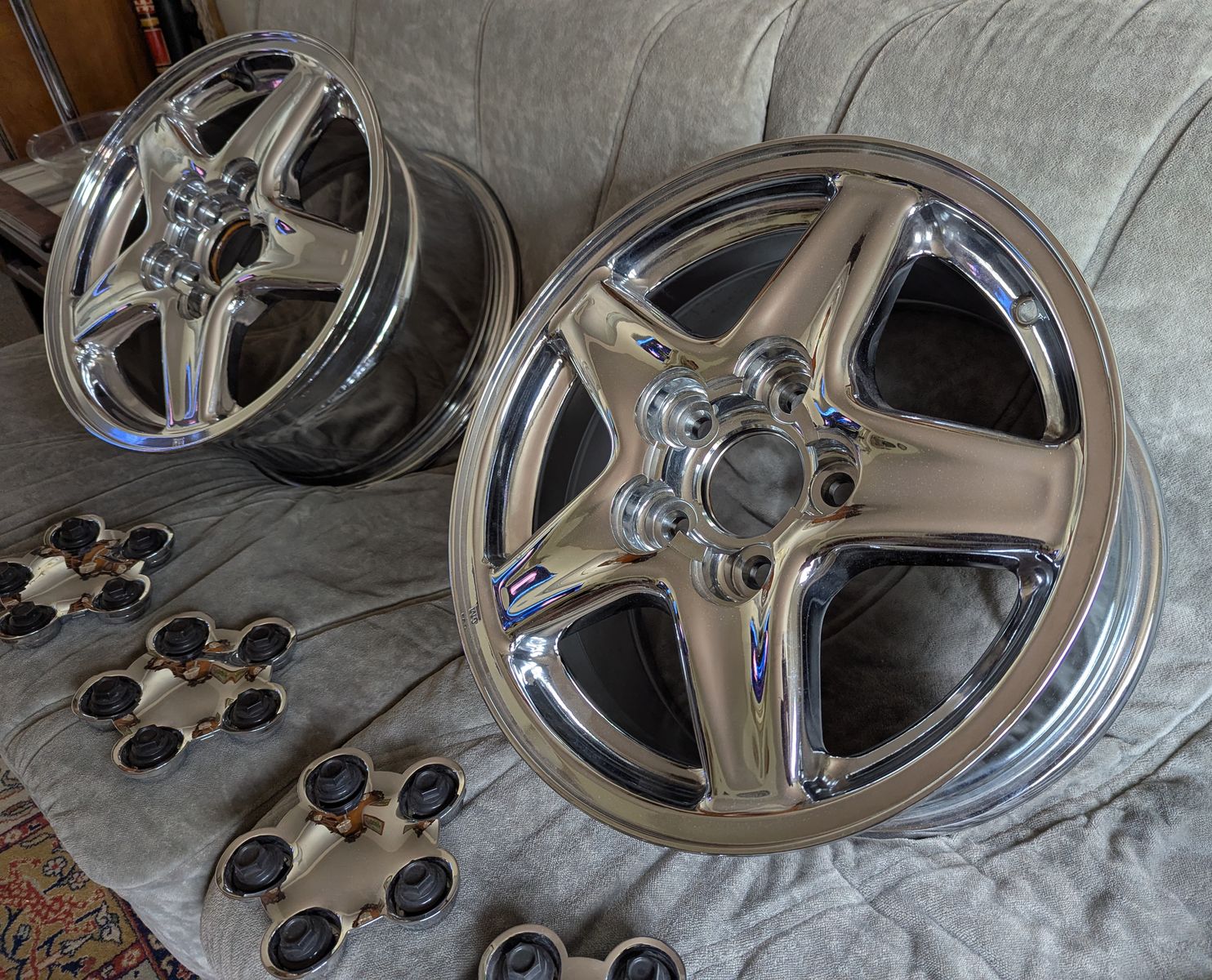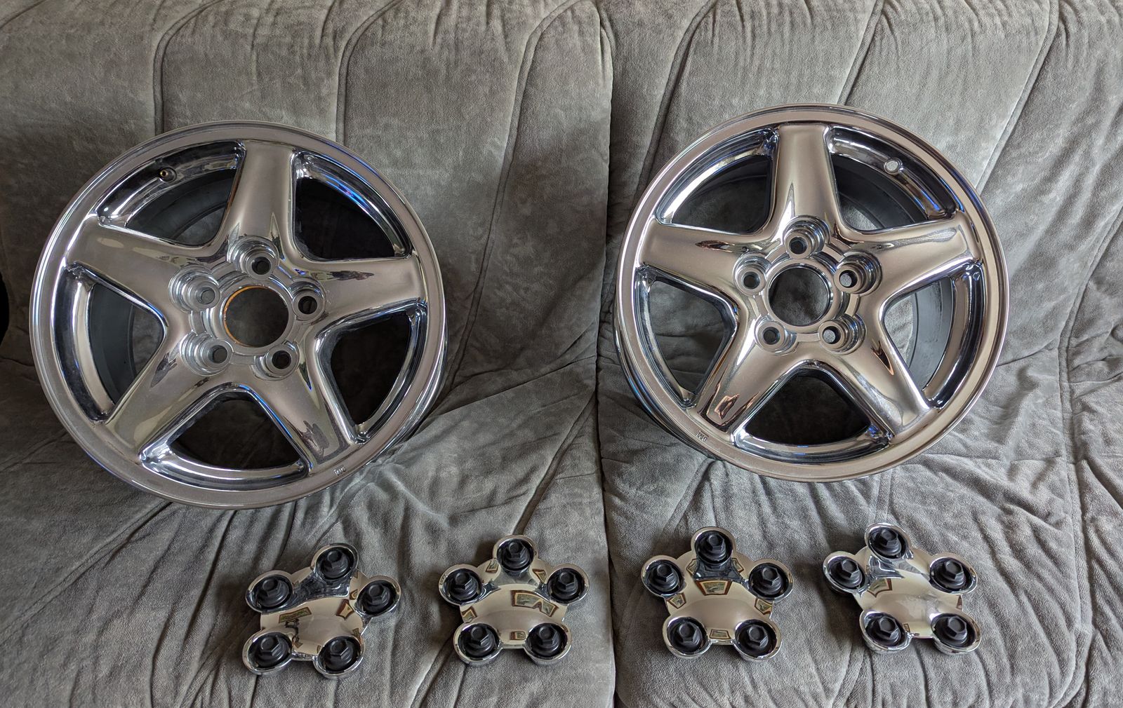 Venmoold stock = open box. two original GM oem chrome wheels 16x8 J 55.0 includes (4) flawless center caps. no curb rash / no dings.
