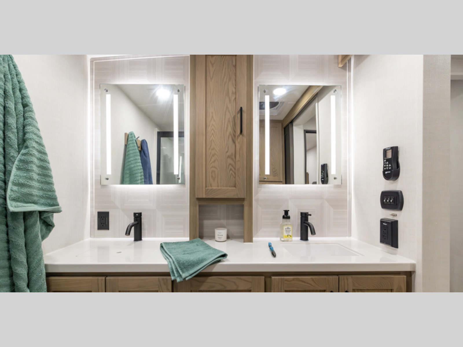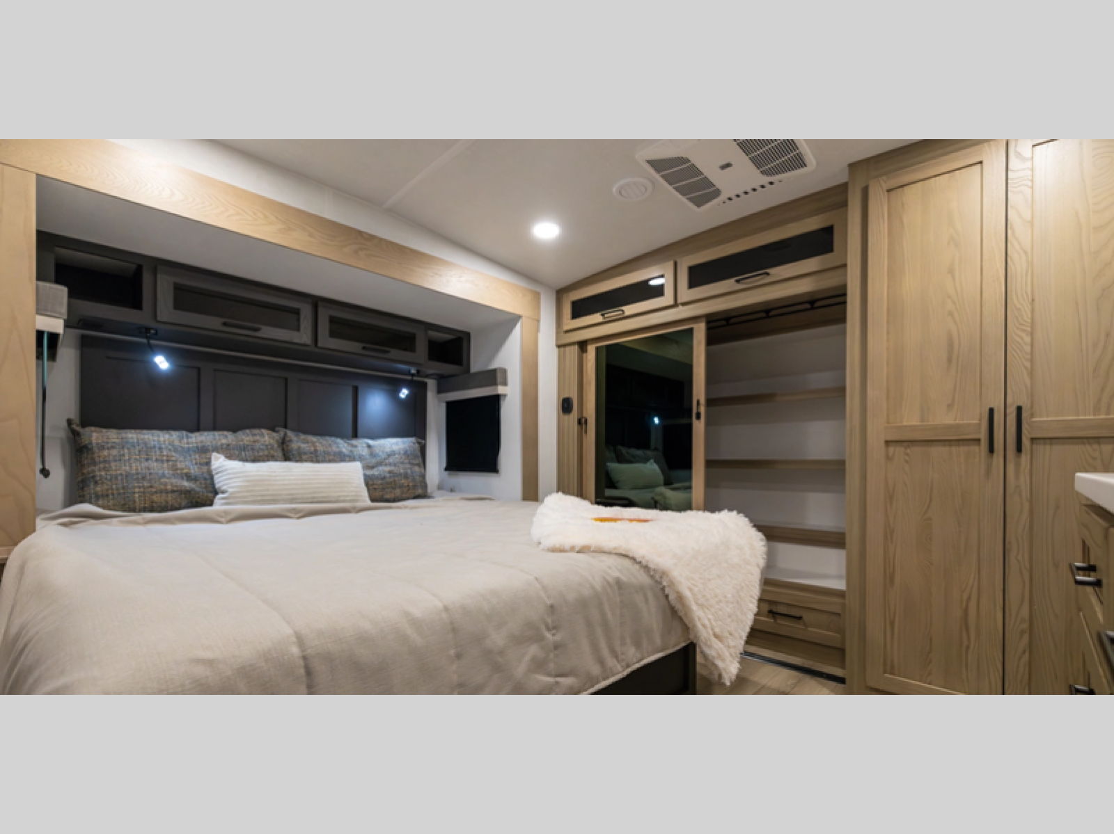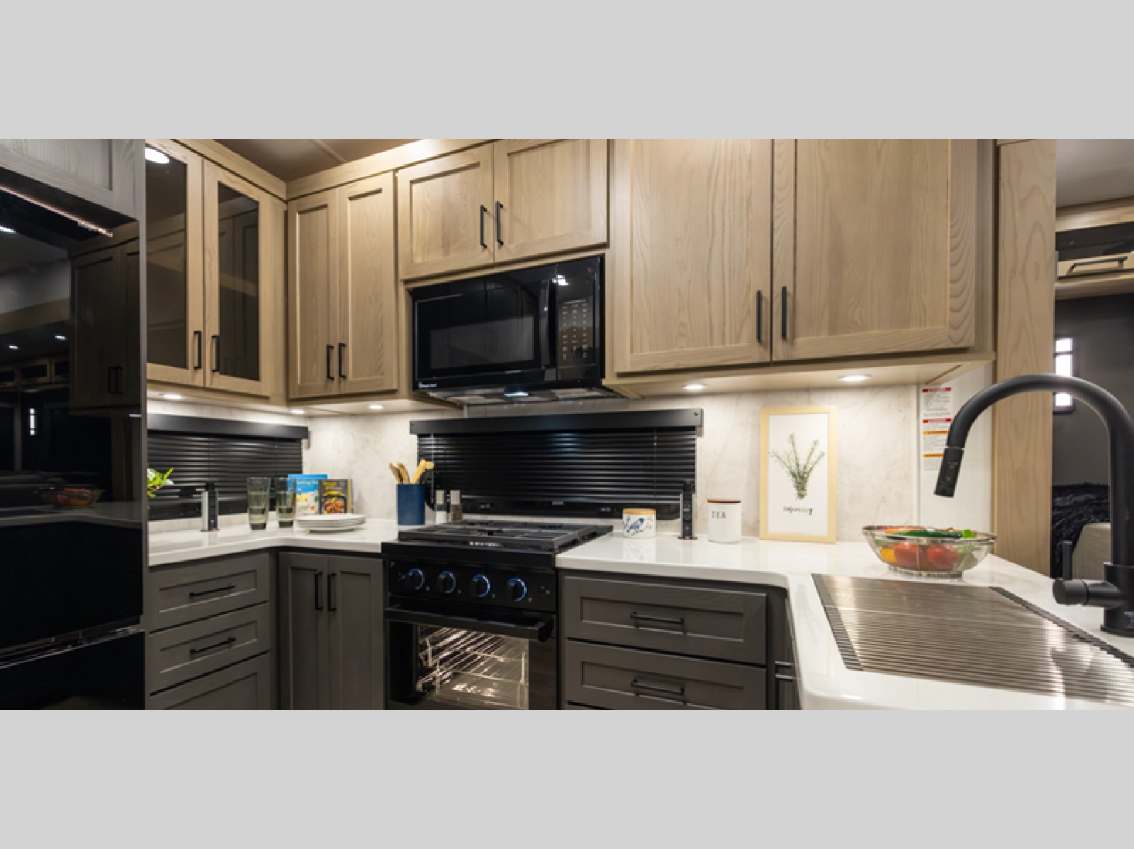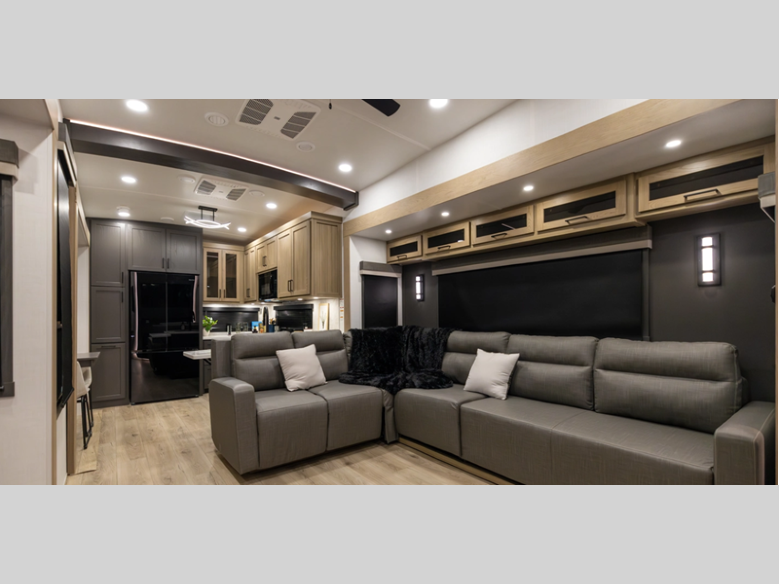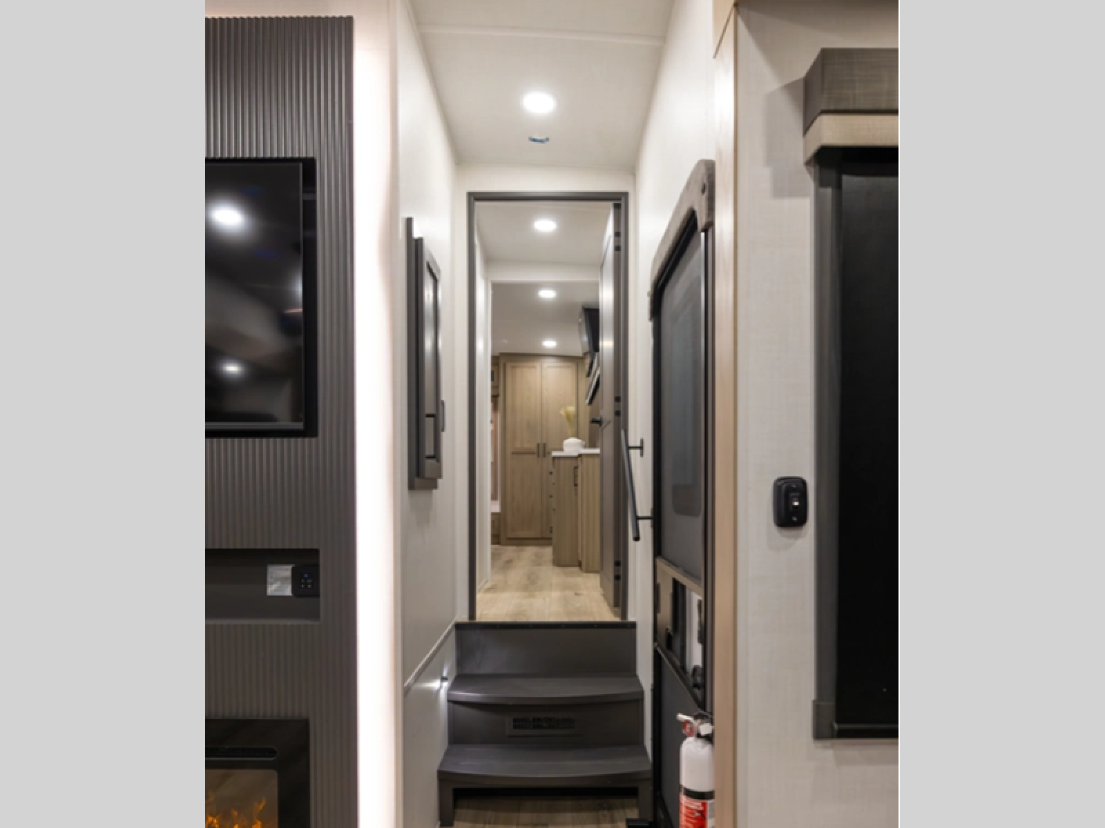 This thoughtfully designed layout begins at the front with a spacious full bedroom featuring a 72" x 80" king bed in a slide-out, giving you extra walking room without sacrificing a great night's sleep. A wardrobe to the side and a dresser across the bed provide ample storage for clothing and everyday essentials. Down the hall, the full bathroom offers added convenience with a linen closet for towels and toiletries, along with double sinks so two people can get ready comfortably at the same time. The center living area is perfect for relaxing or entertaining, showcasing a large L-shaped sofa made up of a 52" theater seat, a 66" fixed corner sofa, and a 54" hide-a-bed, all positioned across from the TV and fireplace. A desk in an opposite slide-out creates a dedicated space to work from home if needed. At the rear, the kitchen delivers generous counterspace and overhead cabinetry, equipped with a residential gas range, microwave, and 12V refrigerator, plus a nearby pantry for dry goods. Across from the kitchen, a slide-out with a table and chairs provides the ideal spot for meals or gathering together for games and conversation.