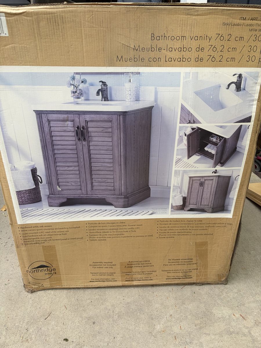 VenmoBRAND NEW IN BOX- purchased at Costco & kept in storage for a remodel. COLOR is modern wood color, very “Hearth & Home” vibes. Never opened! Includes 30” Vanity w/ Carrera Countertop & Sink w/ Backsplash (faucet NOT included) All specs are on the box and photos listed. Details: -Oak Hardwoods w/ Veneer Finishes -WHITE Carrera QUARTZ Countertop (including backsplash) -White Ceramic Under mount Sink -Solid Hardwood- cabinet pulls included -One adjustable shelf We are cleaning out our garage/storage. Located in Holladay -easy access for pickup, and if you are located LOCALLY & willing to pay, I am sure we could deliver:) This is a GREAT value! If you need assistance with a small remodel or installation of this vanity that is an option we can provide options for as well:) Asking $500 OBO Serious inquiries ONLY please. Text Carrie- 801-558-6226