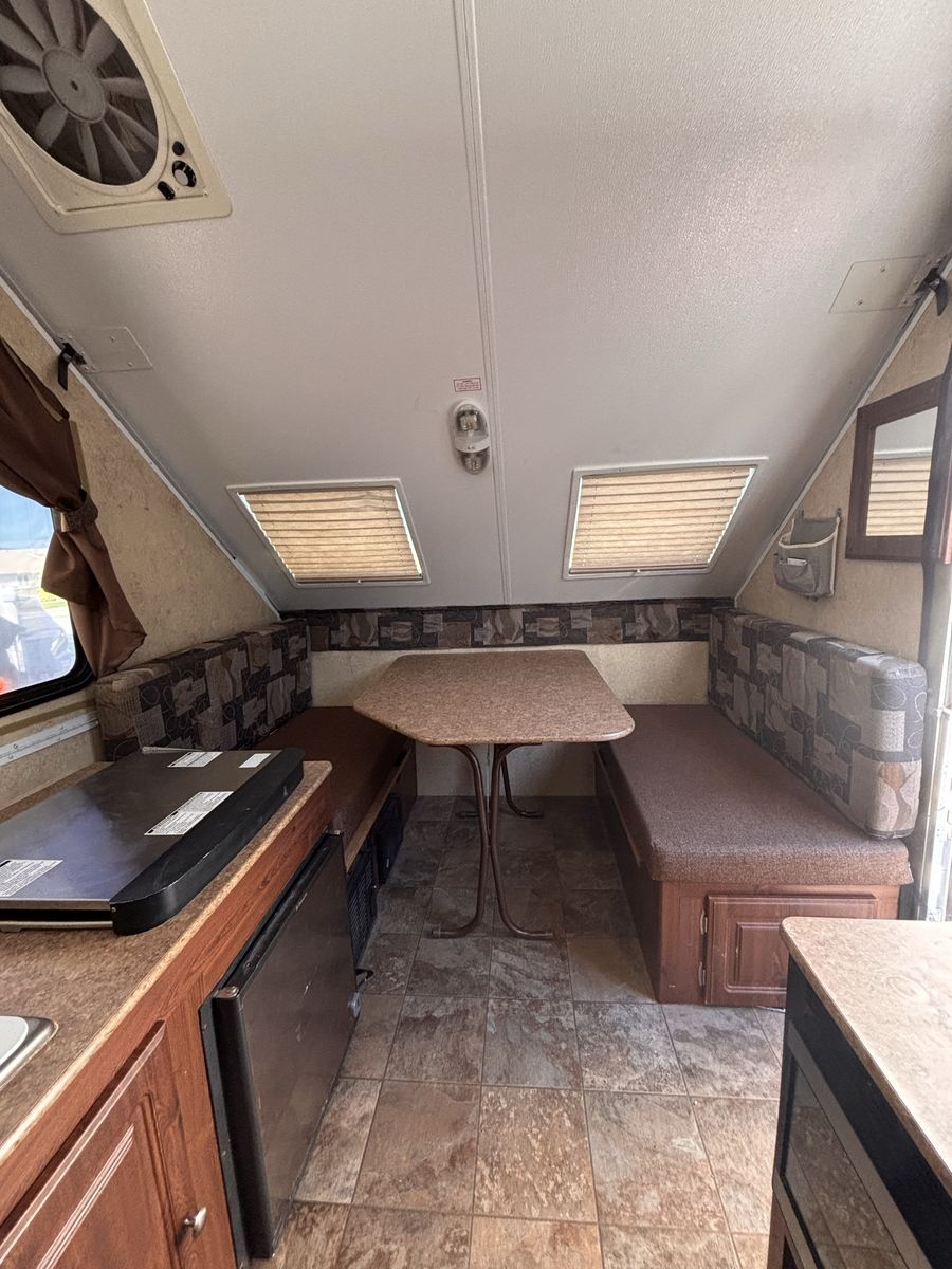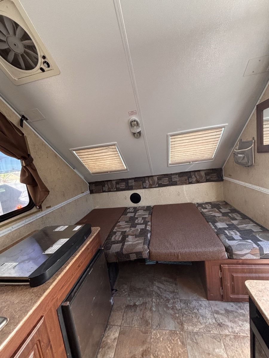 Forest river T12SDTH This trailer has been great as a single mom of 3 kids. I can put it up and down by myself, tow it with my suv and take my kids four wheeler and motorcycle. Has everything but a bathroom, which was nice to not have to dump.