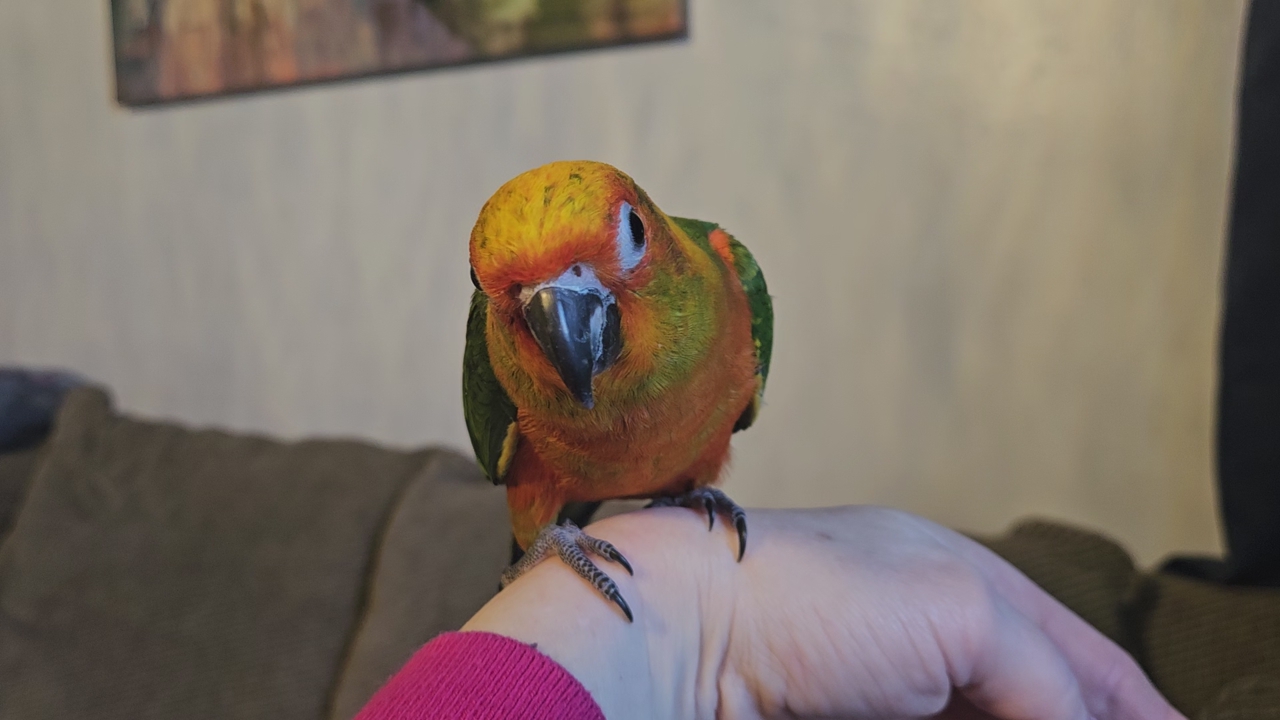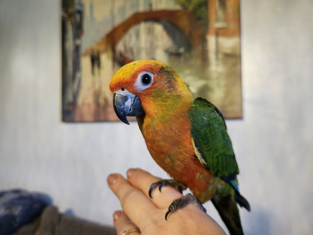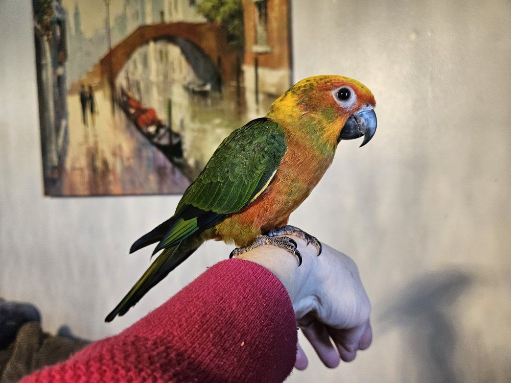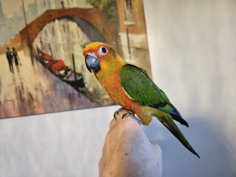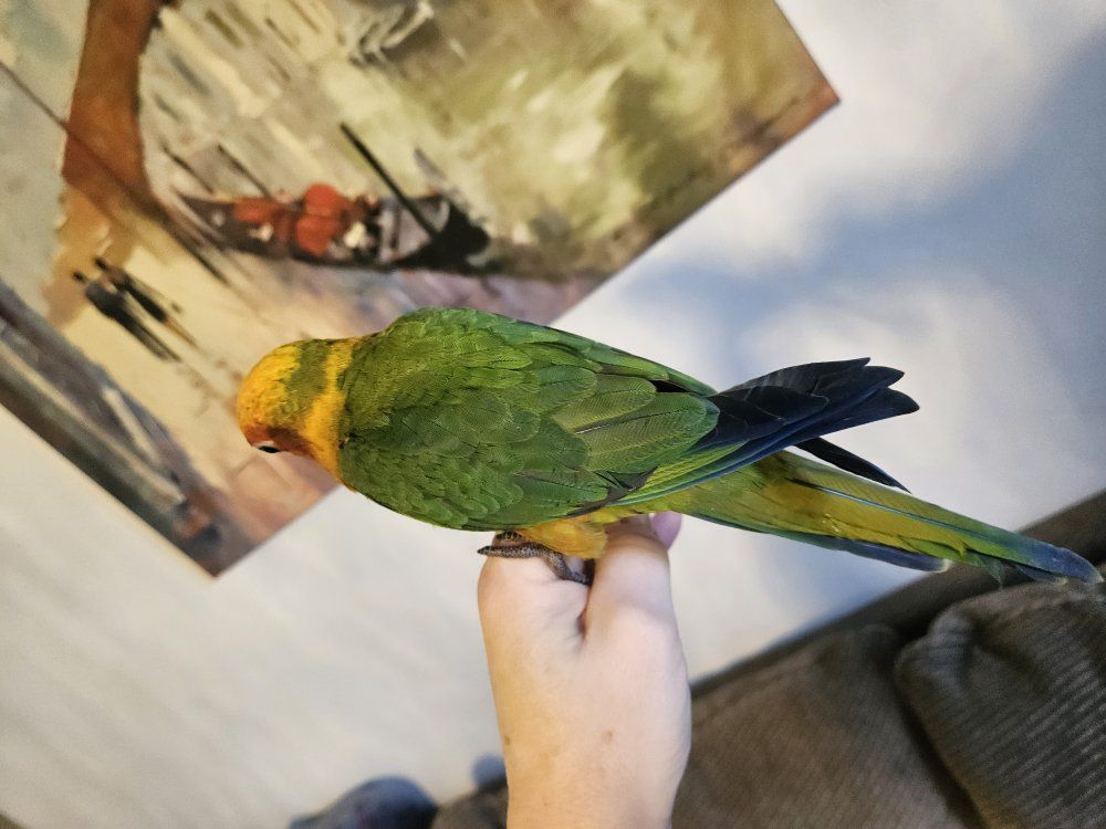 This is my last available baby Hybrid Sun-Jenday Conure. It is 3 months old, was hand fed and is very tame. Is ready to go to a good home. I am unsure of the gender. I also have a cage available for $50.