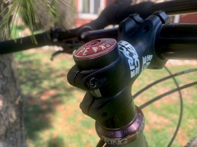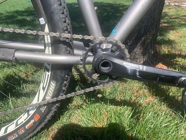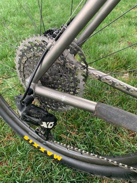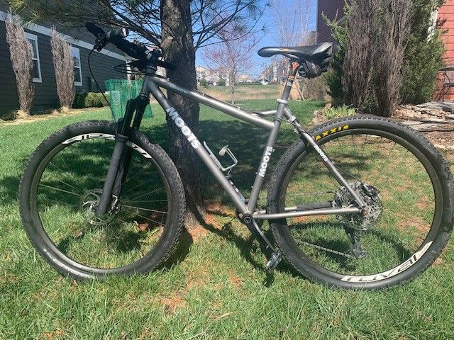 VenmoMoots Mooto-X 18" frame (2007). RockShox Reba fork, Roval tubeless carbon wheels, Roval hubs, King headset, Shimano XT brakes, Sram XO drivetrain, Race Face Stem, Shimano XT pedals, Easton carbon seatpost.