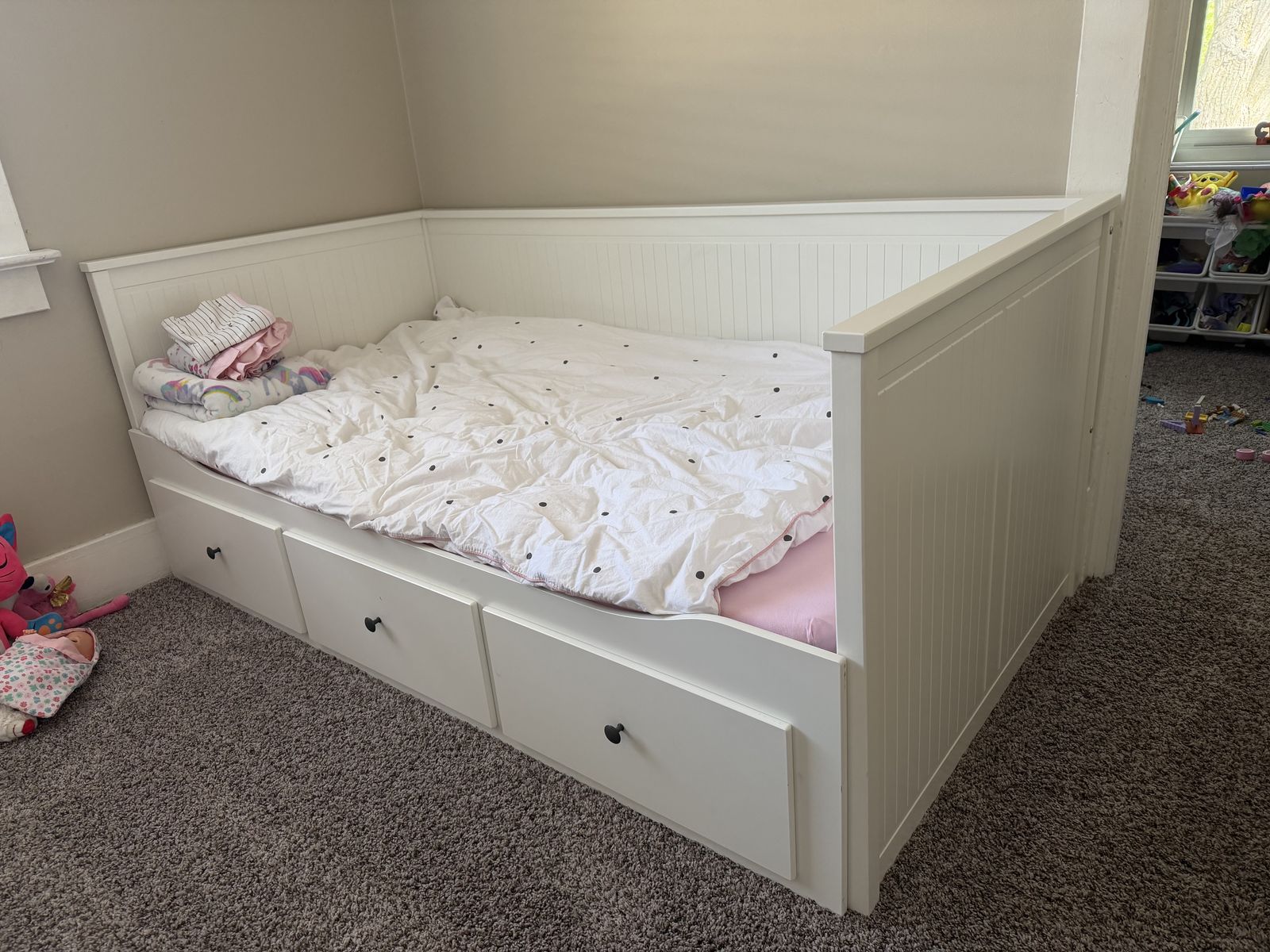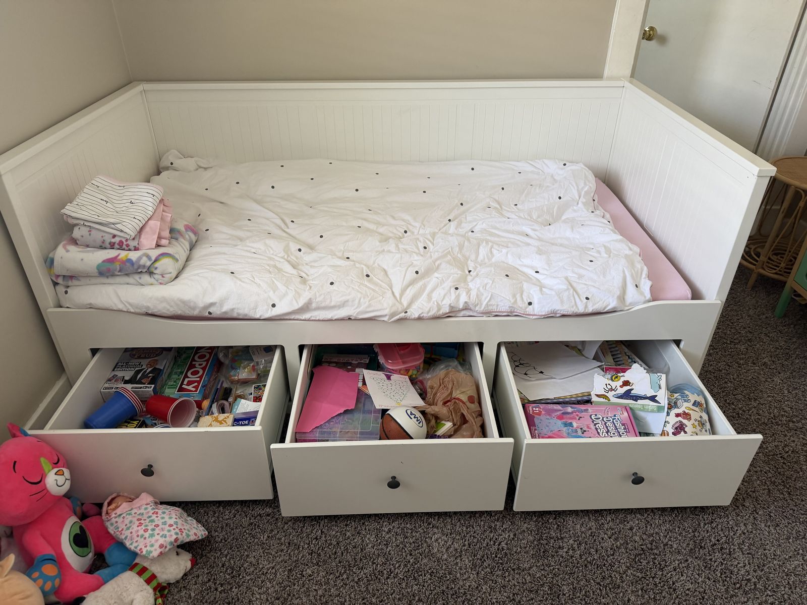 VenmoKids IKEA bed frame with 3 functional drawers at the bottom along with mattress, fitted pink sheet, duvet with pink polka dot cover. This is in excellent condition as it was only bought about a year and a half ago. My daughter sleeps with me though and so this bed has only been used 2-3 times except for the drawers. It is in perfect condition.