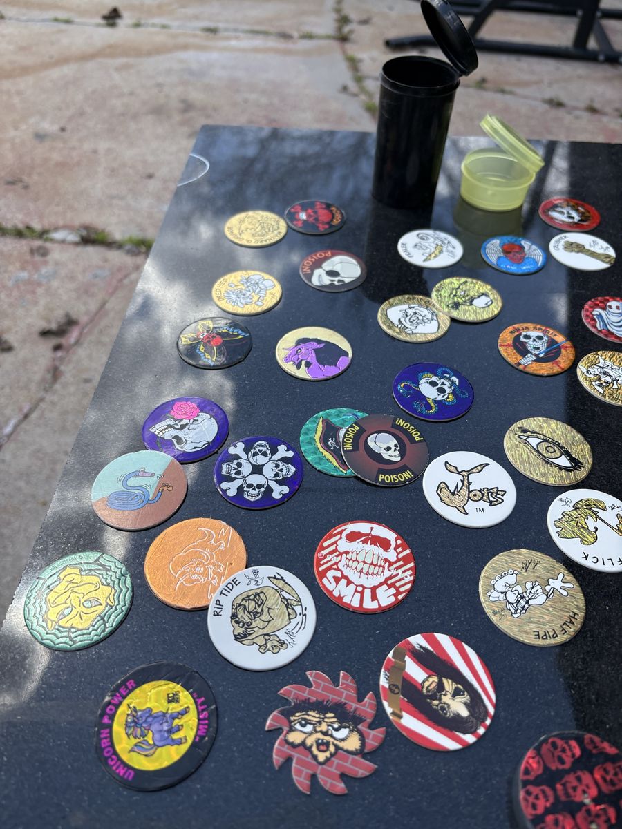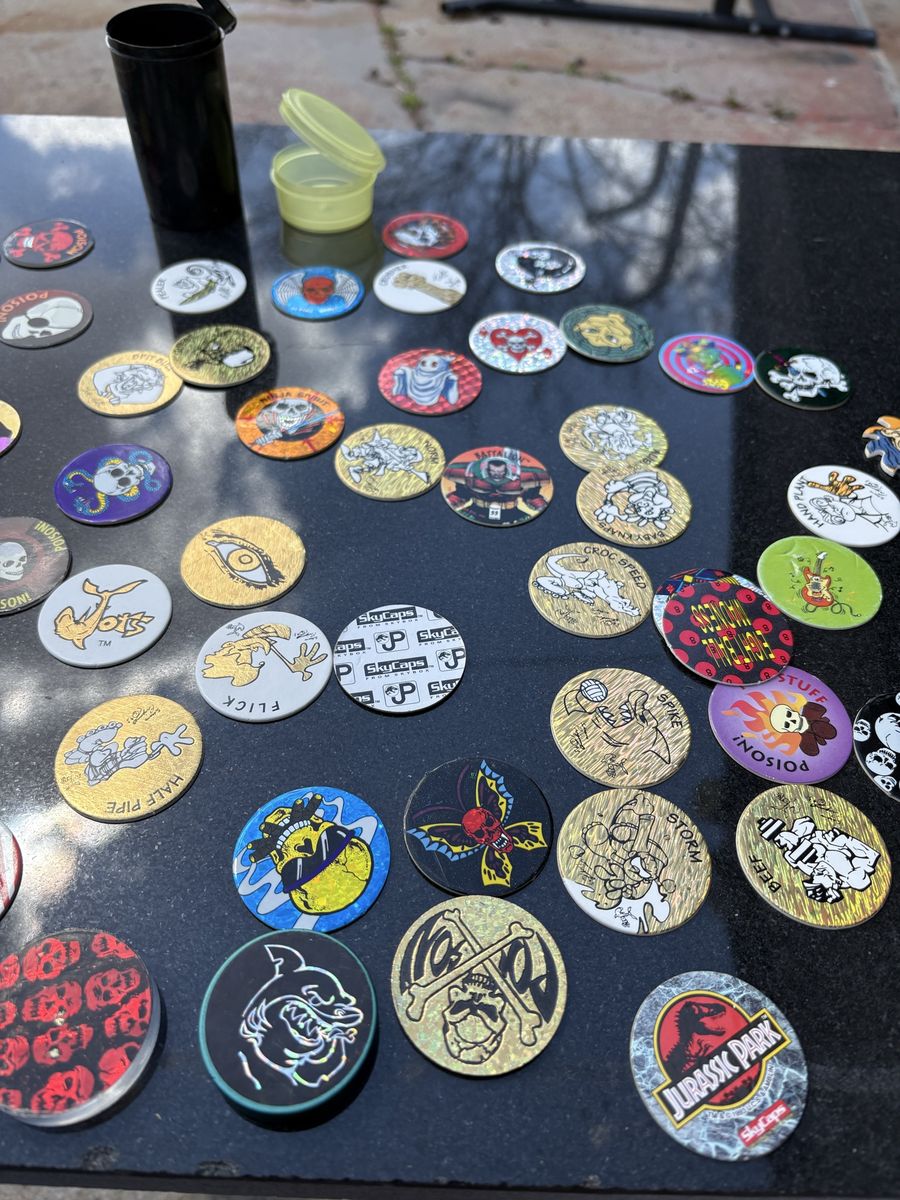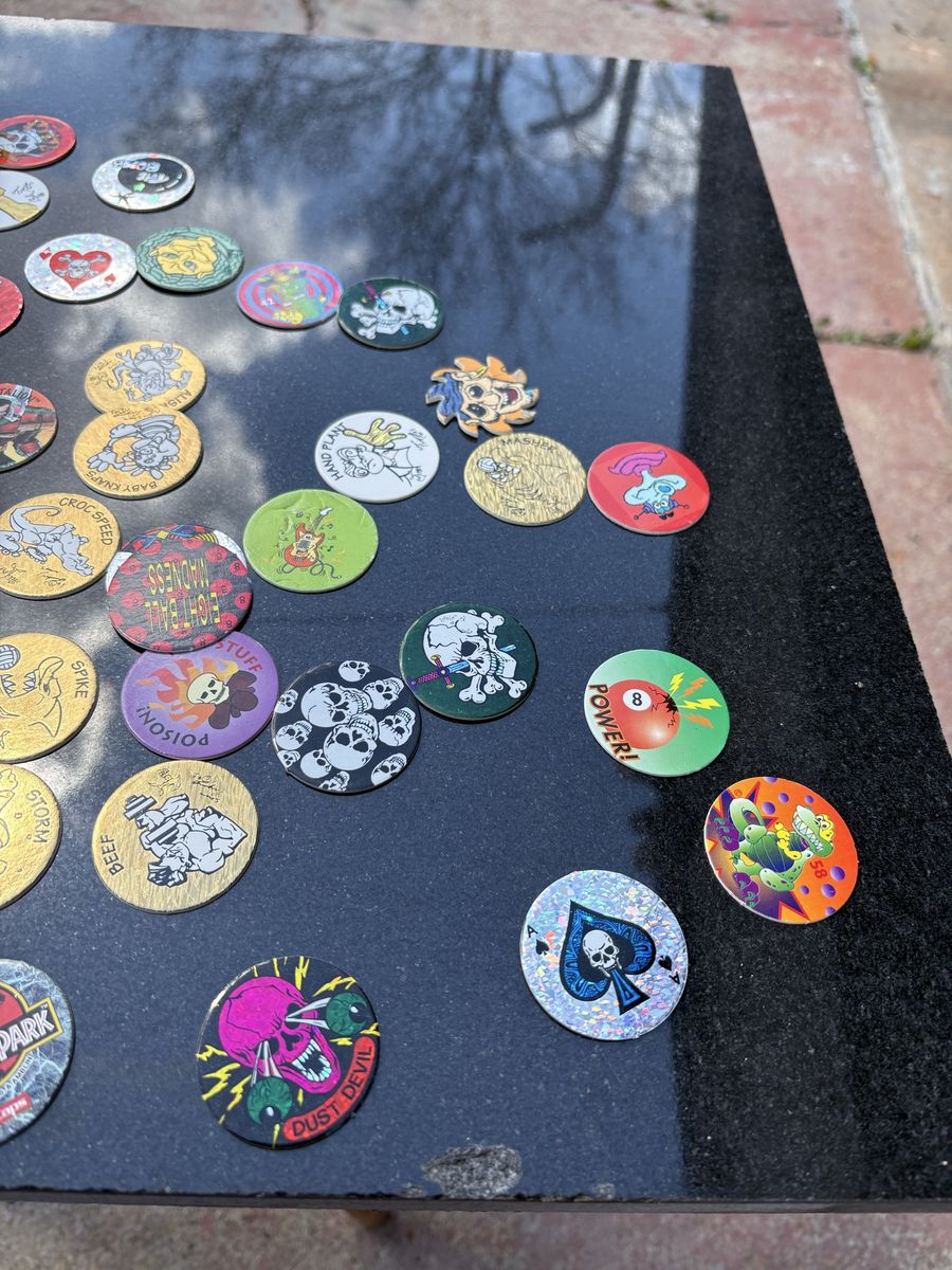 Vintage collection of 90s Pogs and slammers has various designs including Jurassic Park, skulls, and holographic patterns.
