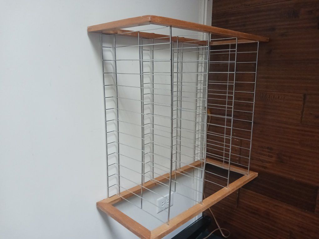 Venmometal and wood shoe rack used in in closet or at door. 28 inches tall 26 inches long and 12 inches wide.