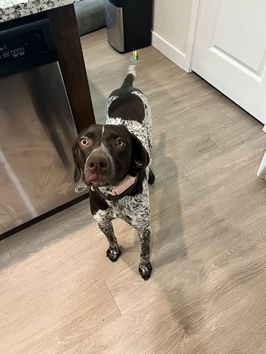 ZelleThis is Maisey, she is a German shorthaired pointer and she will be 1 on July 25th. Looking to rehome her due to her high energy and since we live in apartments, she is cooped up a lot. She is great with other dogs, cats, and children.