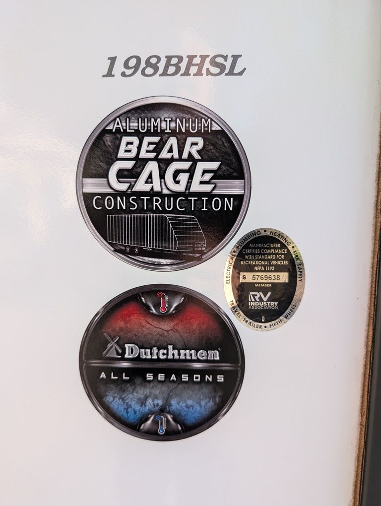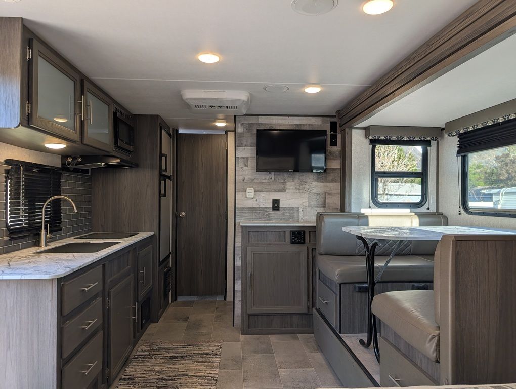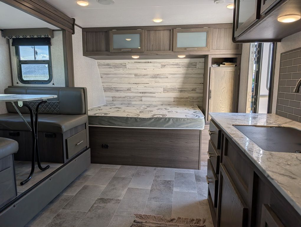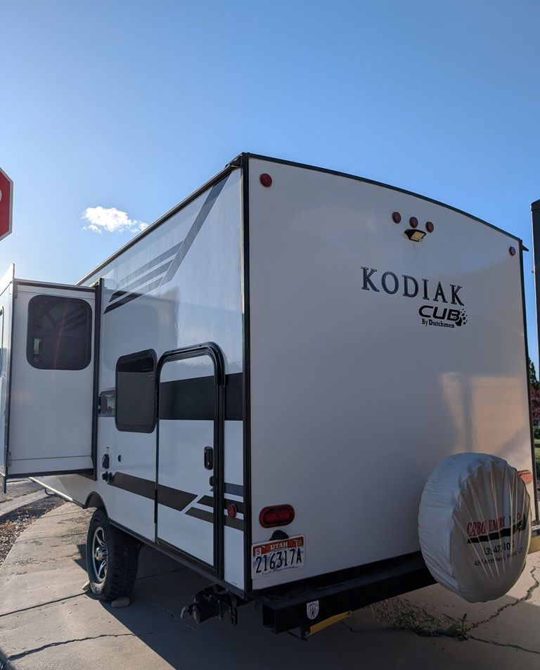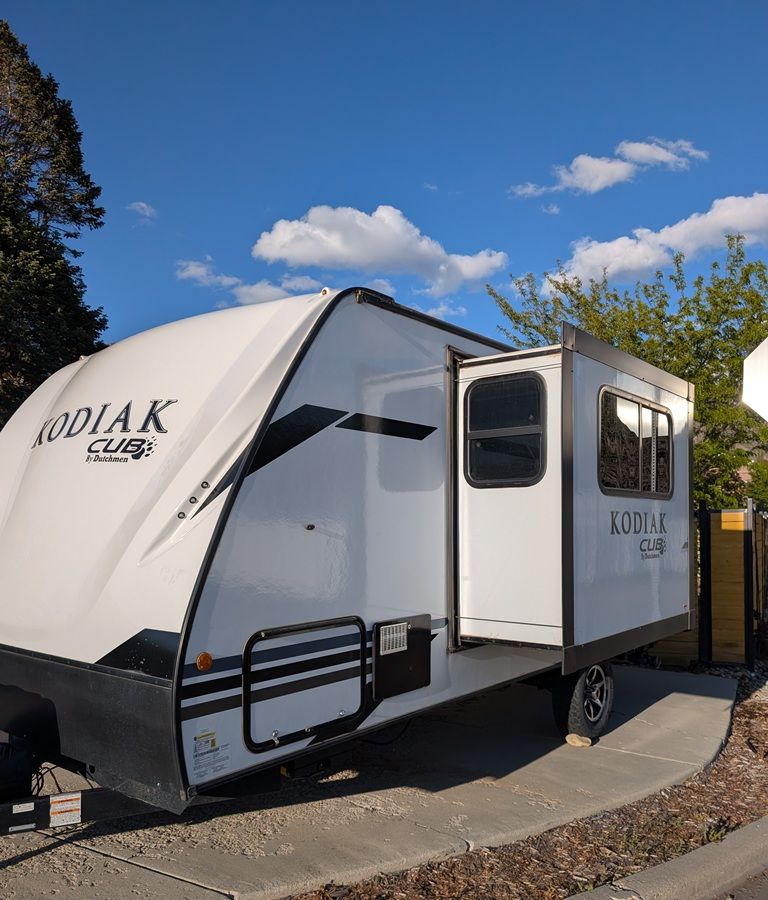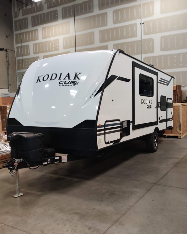 Lightly used, parked in a climate controlled warehouse when not in use. The Kodiak Cub 198BHSL is a lightweight travel trailer designed for families, sleeping 5–6 people with a rear bunkhouse, a front queen bed, and a single slide-out dinette. Key features include a rear bath, a 11-cu. ft. 12-volt refrigerator, and a "Pac-n-Play" exterior door for easy cargo access and large pass-through front storage. 52 gallon fresh, 39 gray and 28 black. It is designed for extended-season camping, featuring a fully enclosed and heated underbelly and torsion axle. It also has electric stabilizer jacks.