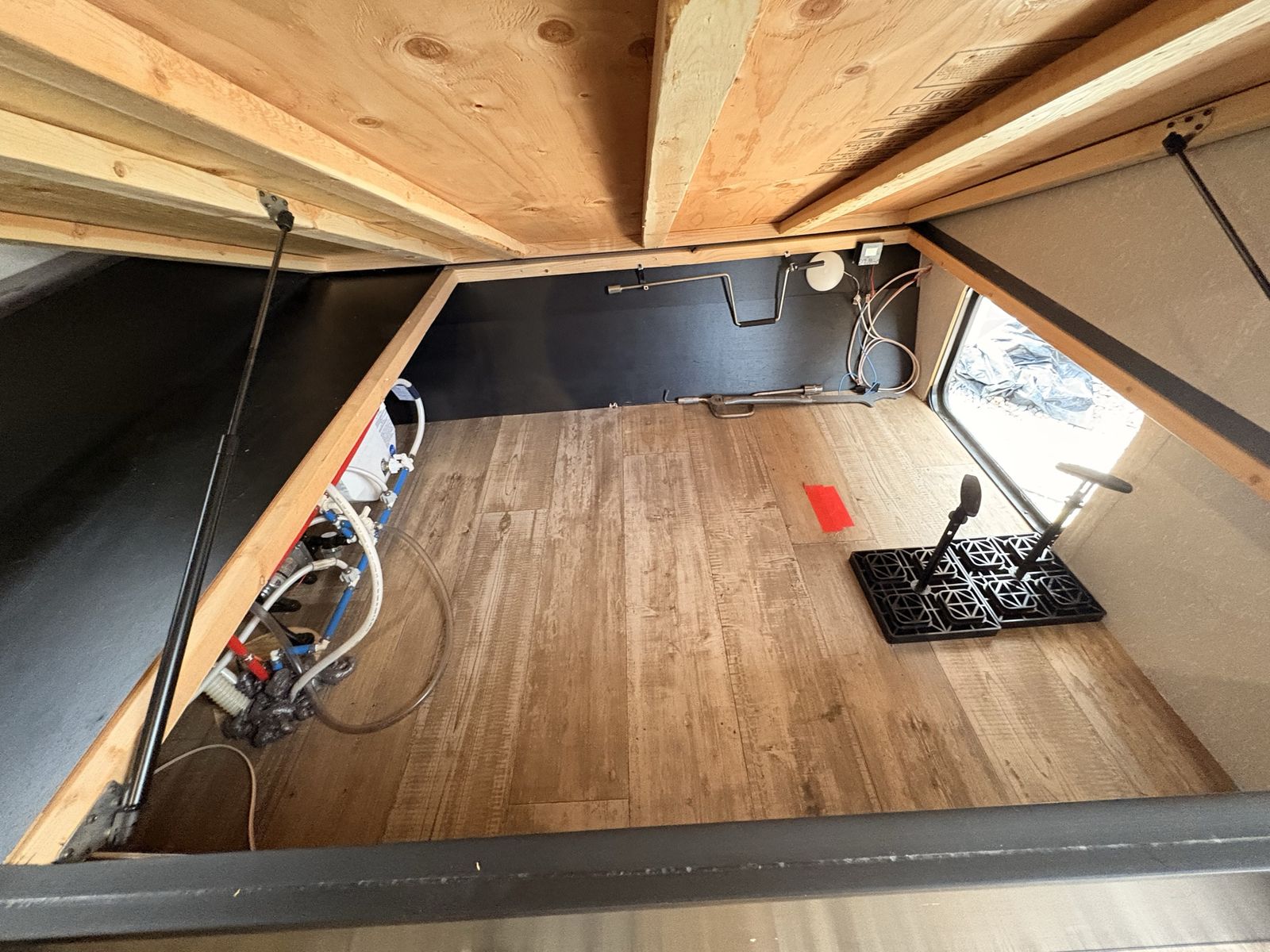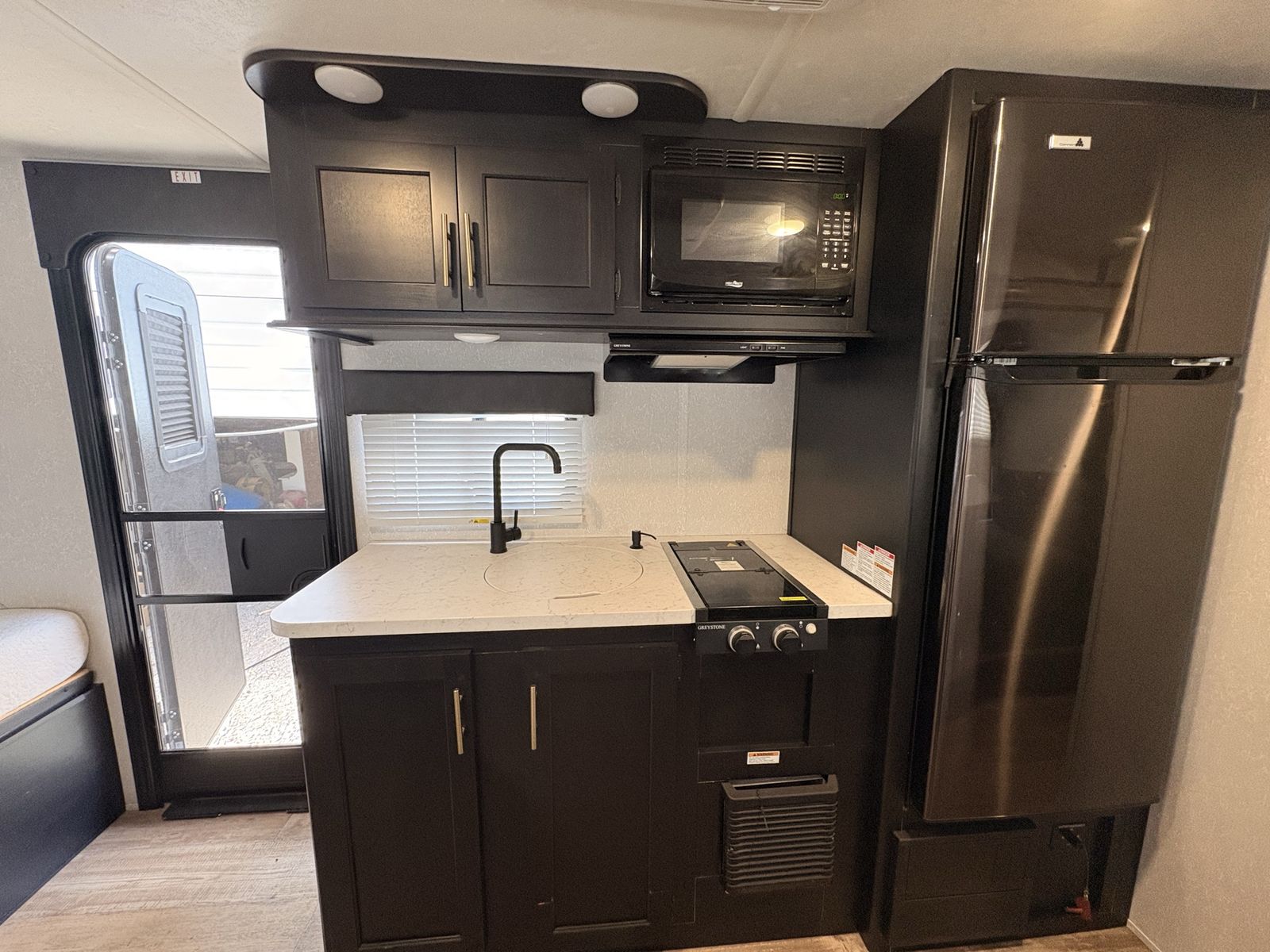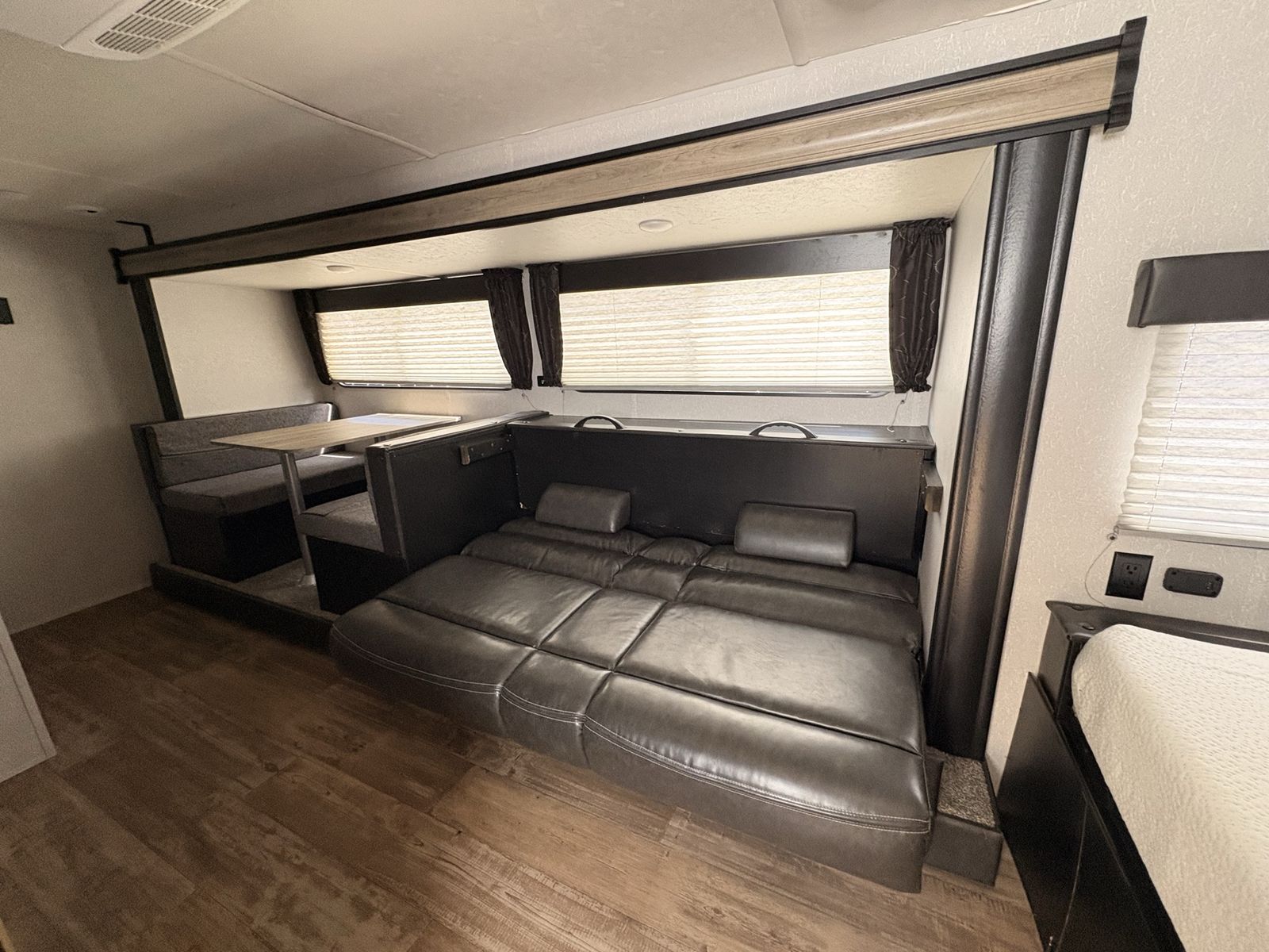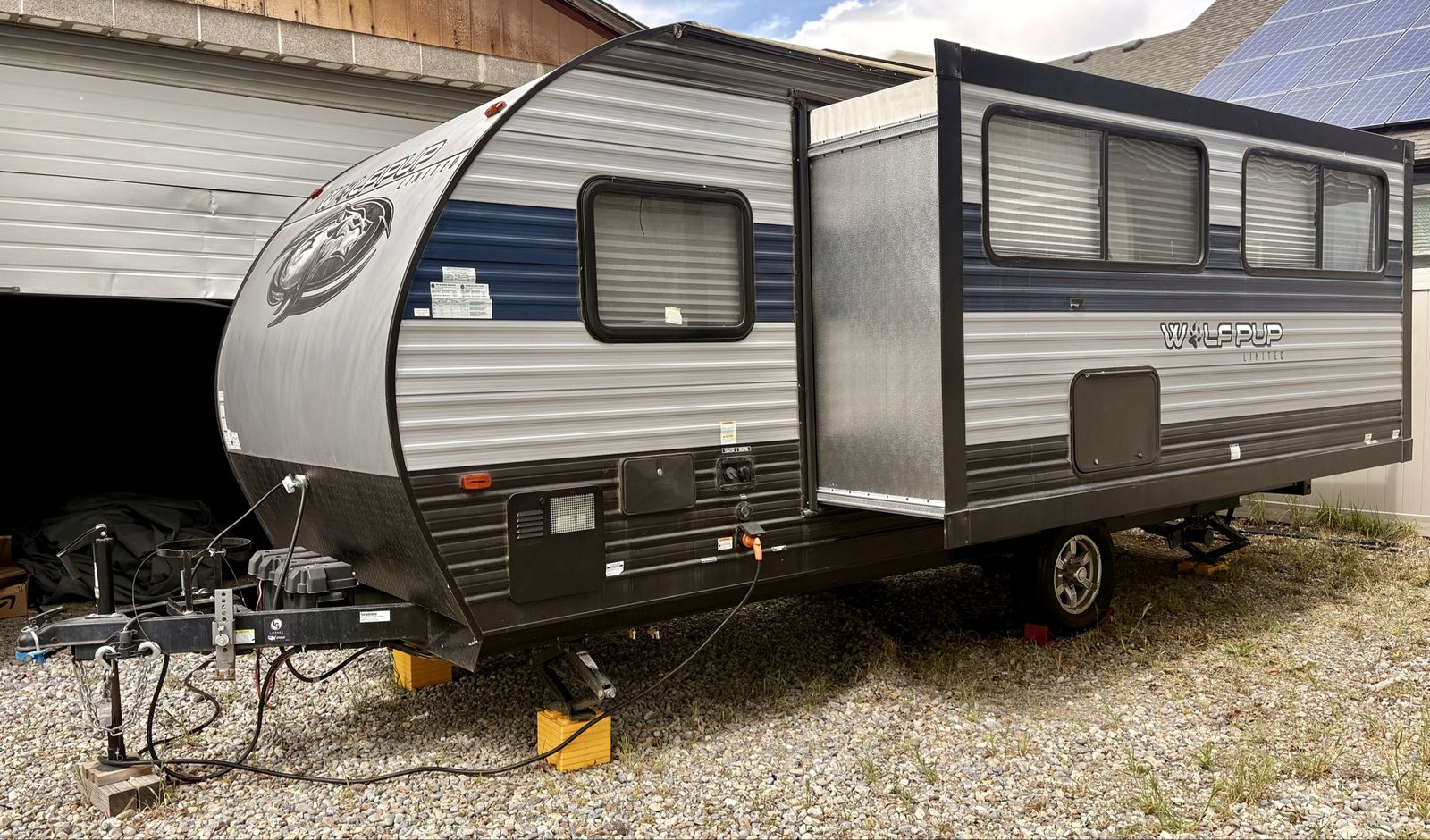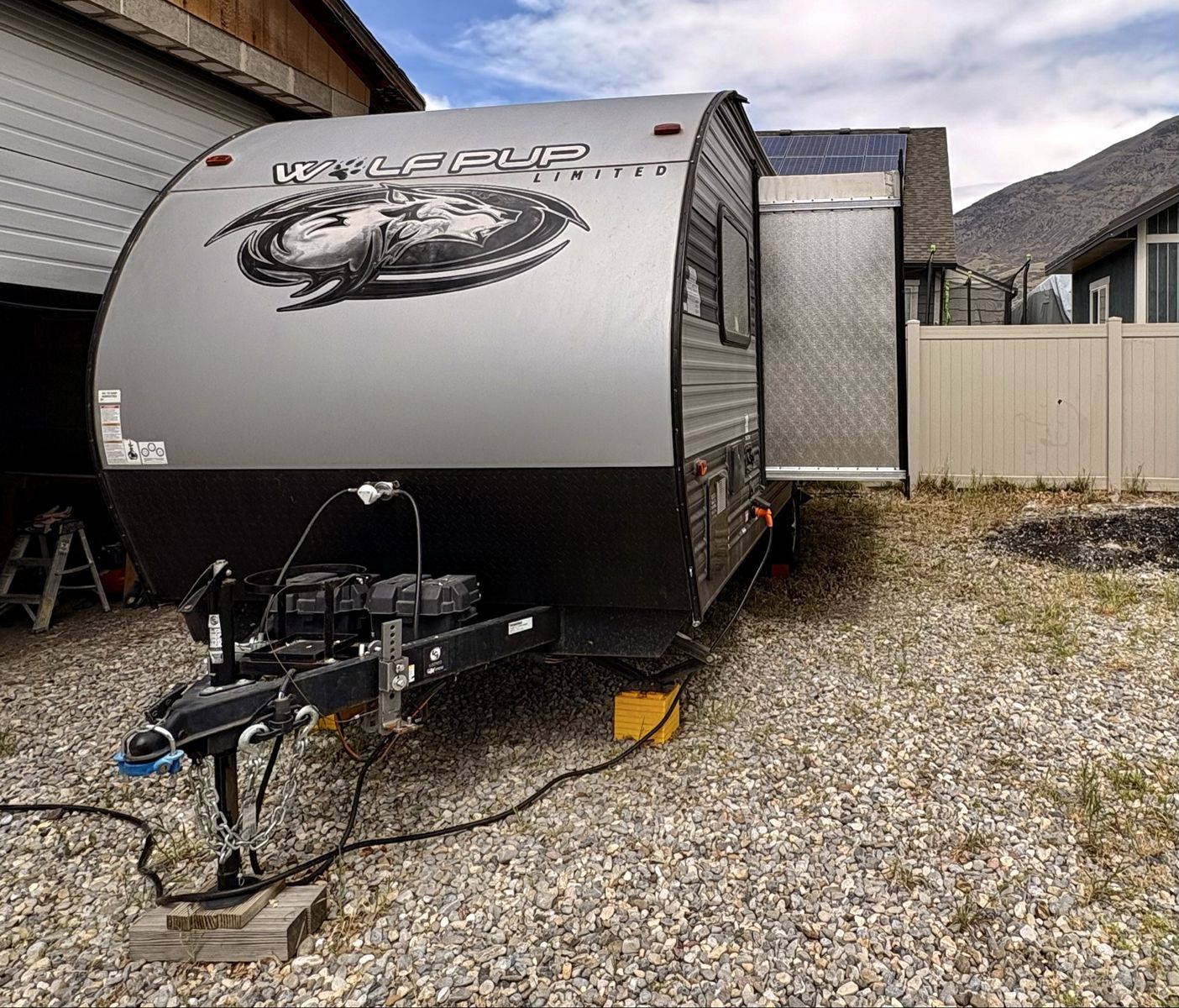 —Trailer features— • Power awning • Full under bed storage • 14in premium wheels with newer tires • Large freezer/fridge • Outdoor mini fridge • Queen bed with upgraded mattress • Outside shower • 2 new 12V batteries • Solar panel • LED awning lights • Indoor/outdoor stereo system • Large slide-out that includes dinette and sofa, which is rare for this size trailer • Weight distribution hitch installed