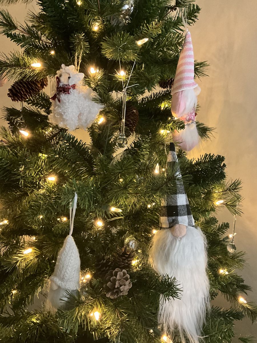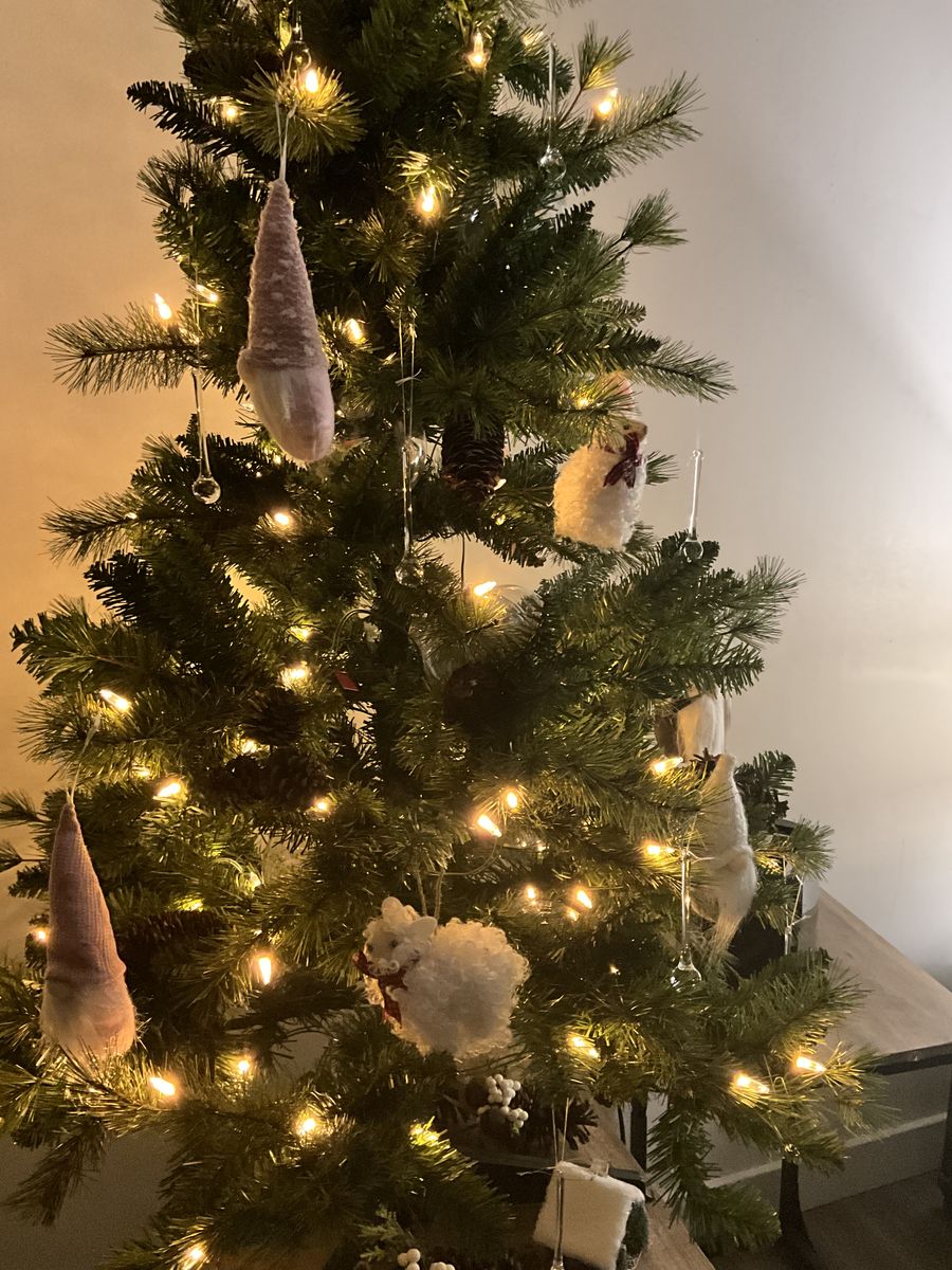 4ft lighted, green artificial Christmas tree with pinecones. Includes all decorations… the sweetest gnomes, wooly sheep, hanging crystals, clear globes. Ready to go. Excellent condition.