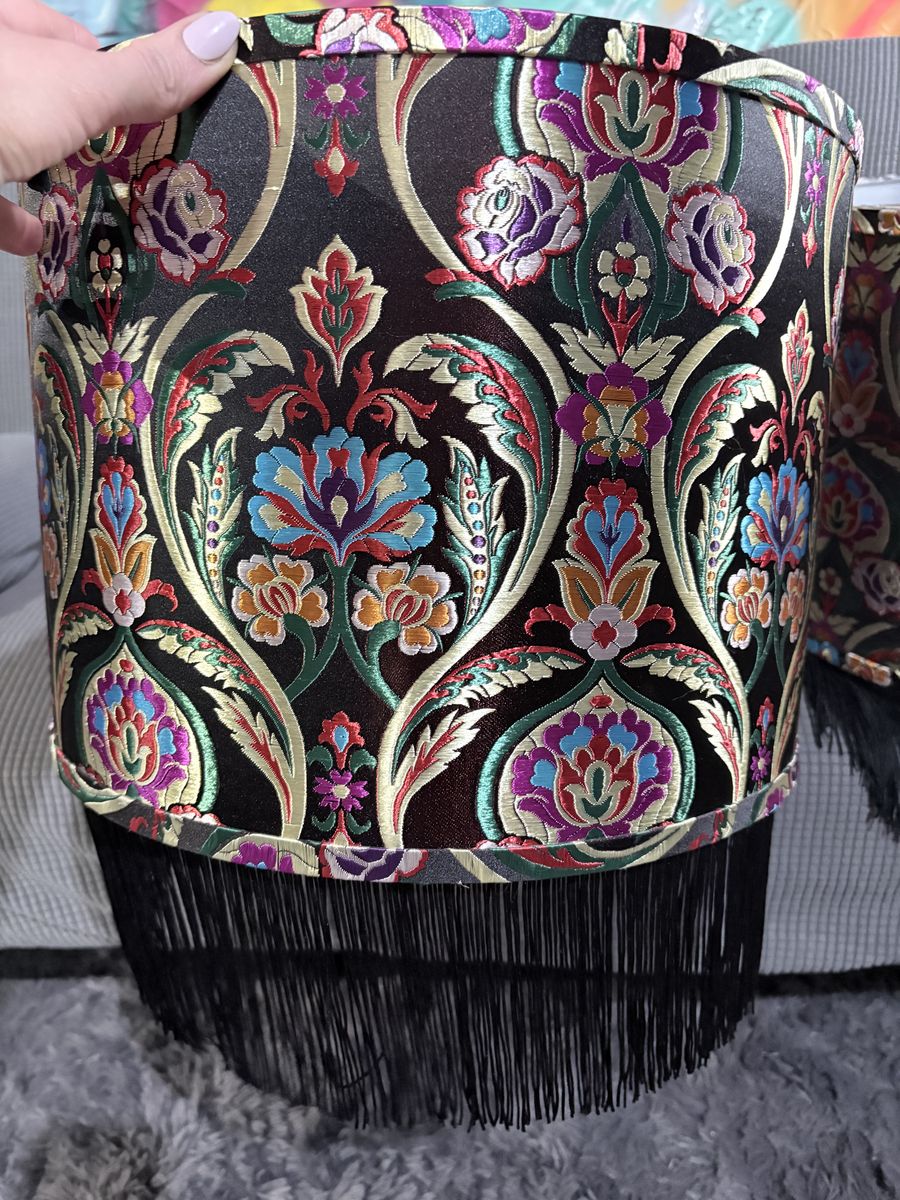 VenmoThis is for a set of 2 gorgeous, decorative, embroidered lampshades with black fringe along the bottom. These are 11" tall x 15.25" in diameter.