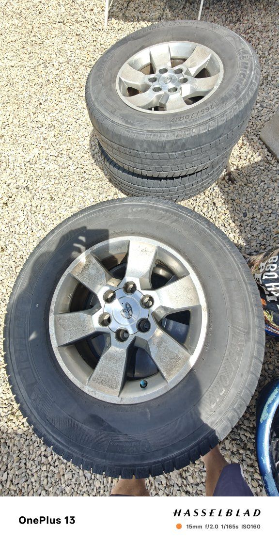 VenmoToyota Tundra 6 lug rims with Michelin defender LTX 265 70 r17 tires. Two of the four tires have quarter life left. Other two are done. Wheels are good but could use a little acid cleaning. Entertaining offers.