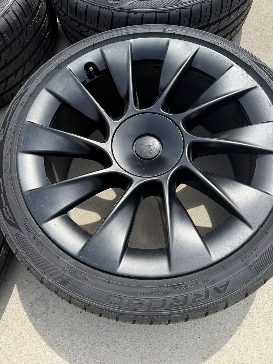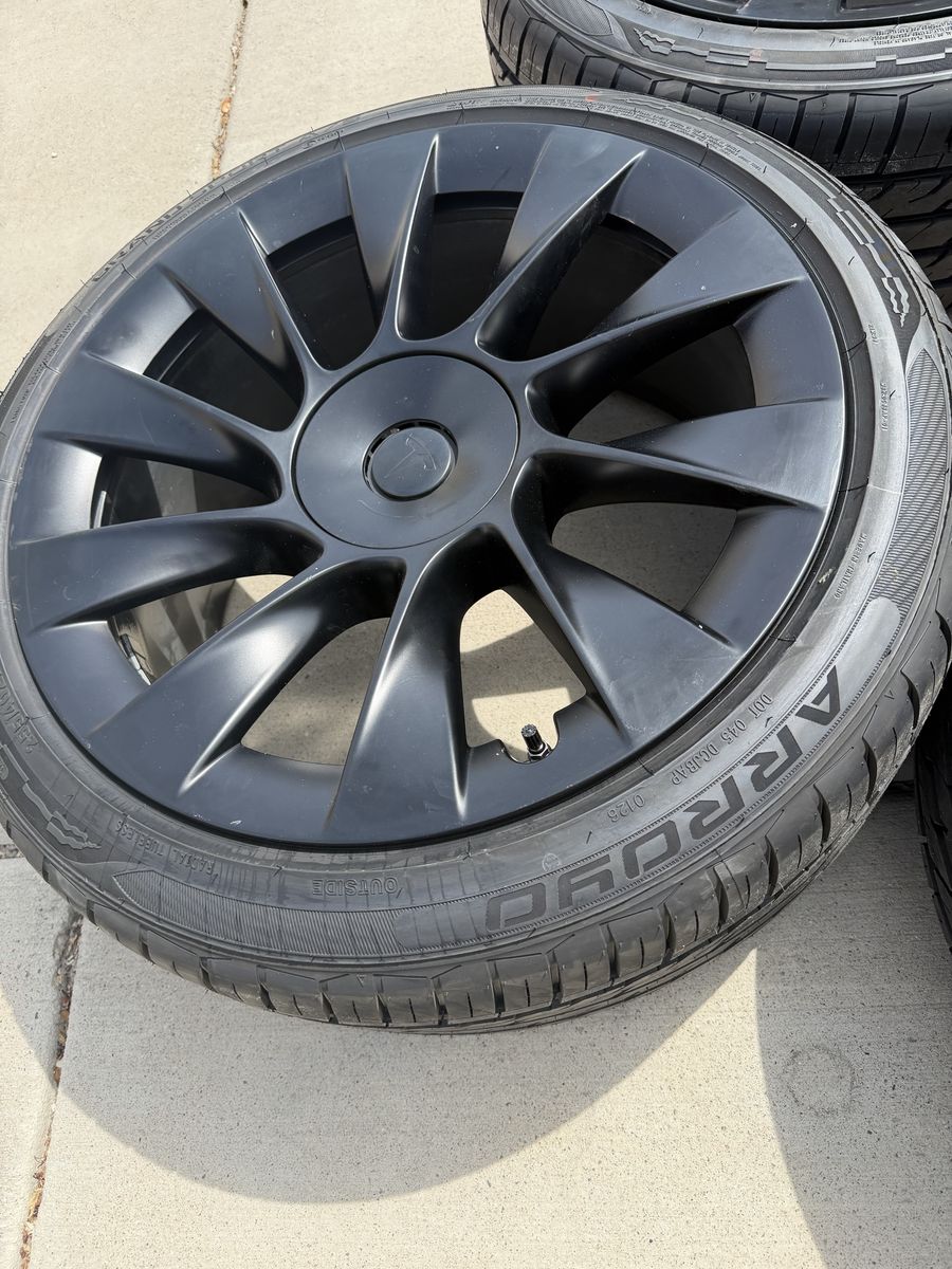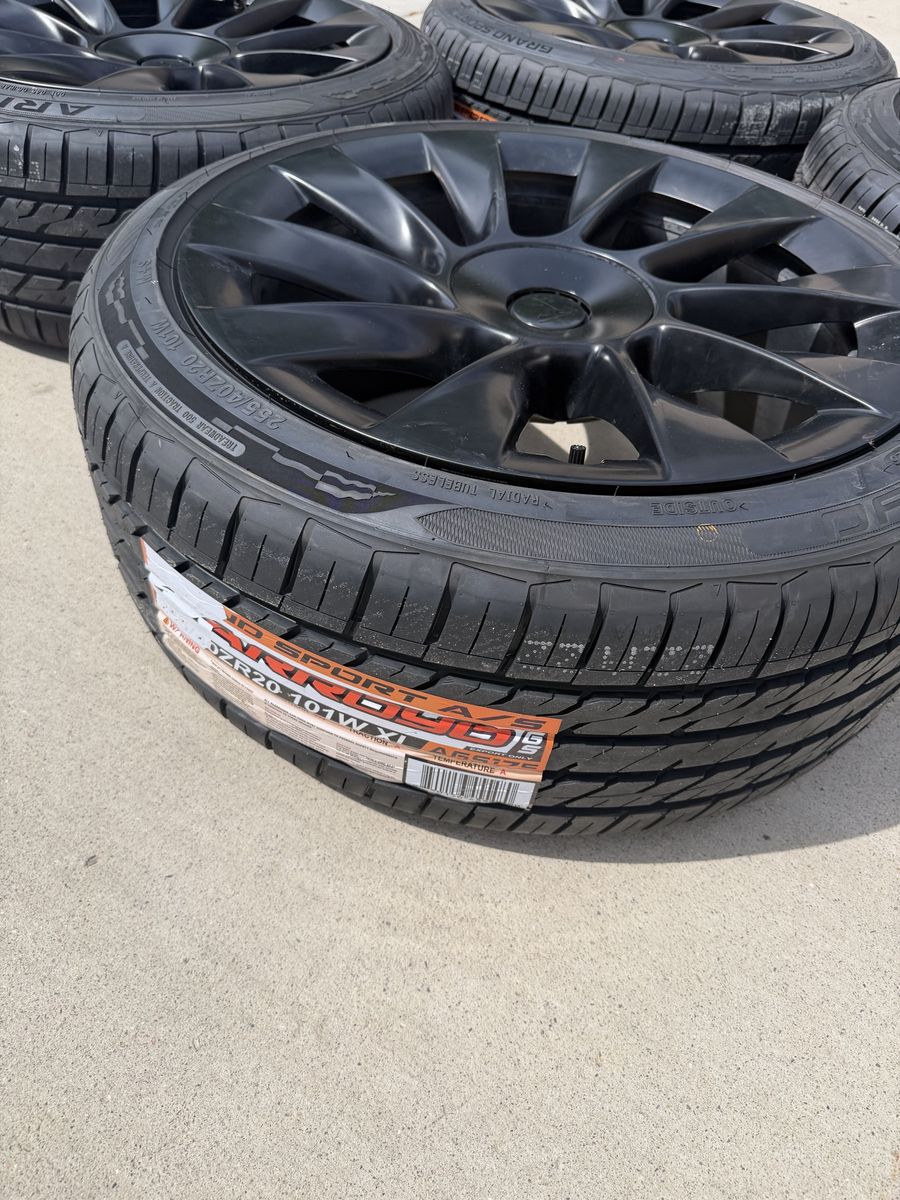 VenmoFor sale is a set of four wheels and tires for a Tesla model Y. These are the 20 inch black induction wheels. Rims are in good shape. The tires are new size 255/40r20 (OEM) size, Arroyo Grand Sport All-season, with 500 tread wear rating. Bluetooth TPMS senors are installed. These have been balanced and they're ready to bolt onto your car. Will fit all years and trims of the model Y. For my asking price I'll deliver them to you if you're along the wasatch front. Text is best. Thanks