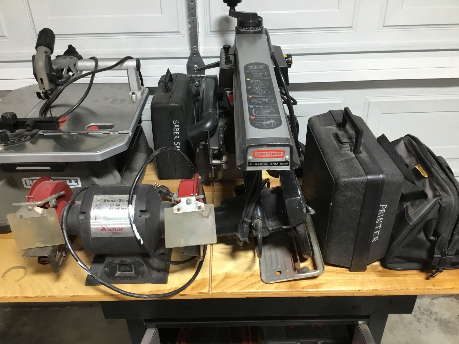 10" radial arm saw w/rollaway cabinet, 10" miter saw w/stand, Rockwell Bladerunner saber saw, 6" bench vise, 71/4" circular saw, electric saber saw, spray painter, Bosch rotozip tool w case, vertical shop light. All tools in good condition, price negotiable. Contact Ray.