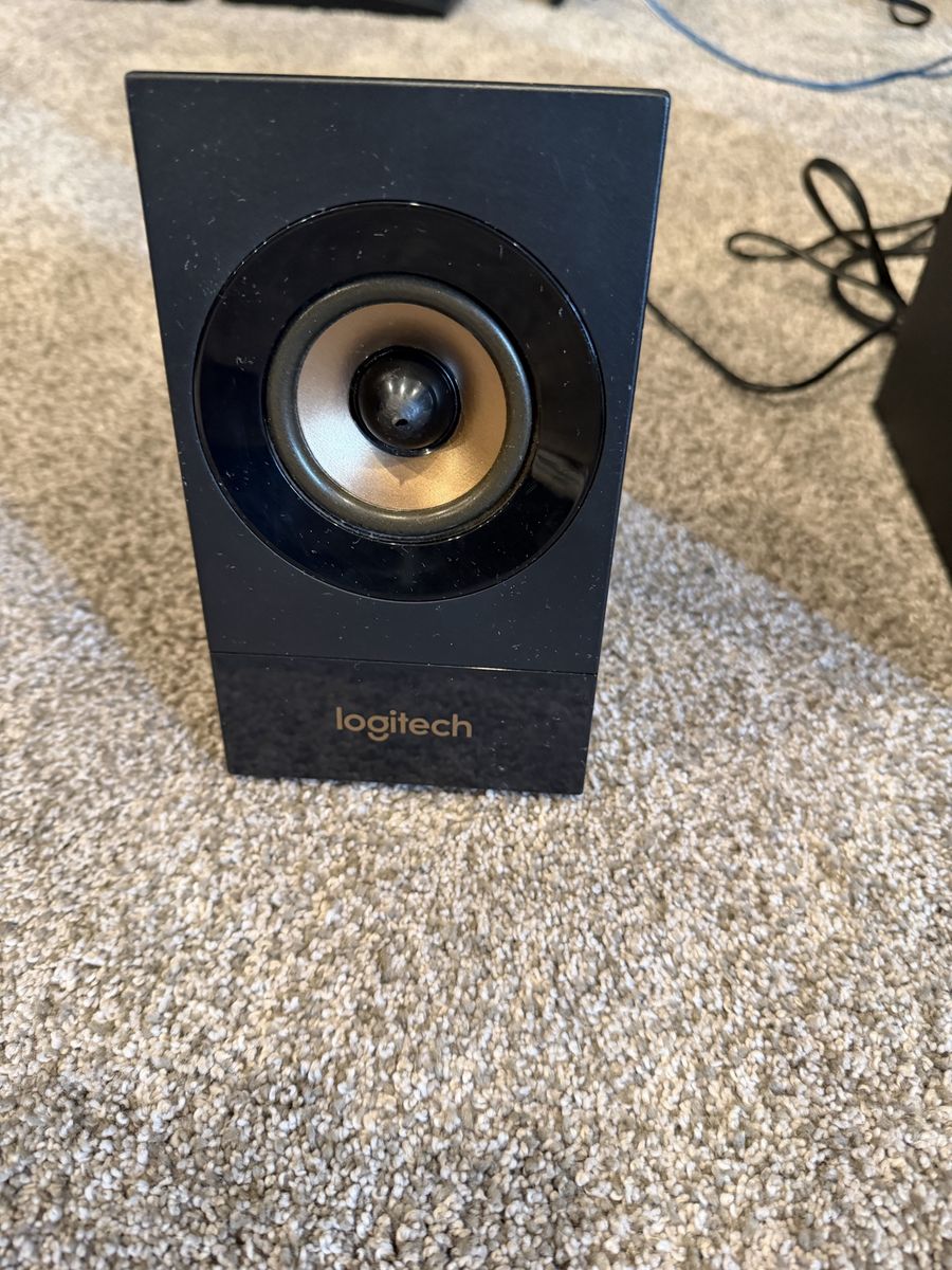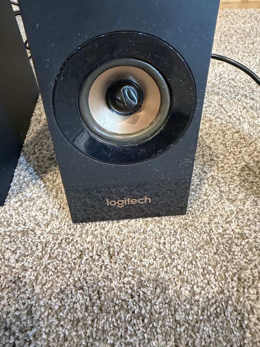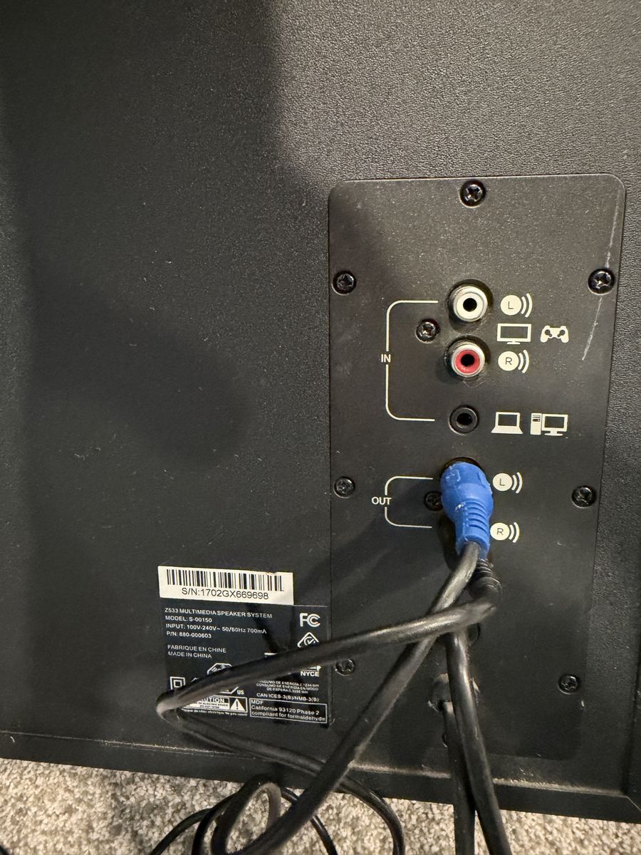 VenmoLogitech Z533 2.1 Multimedia Speaker System. Has RCA and 3.5 inputs, so can use in a lot a different ways. See Amazon link below for details. Used but still works great. Please see pictures for speaker cones. Doesn’t affect the sound quality.