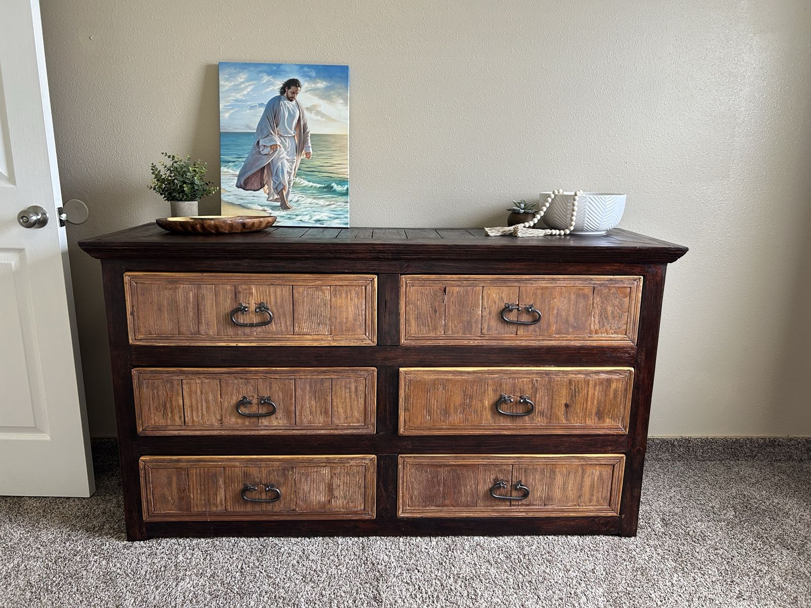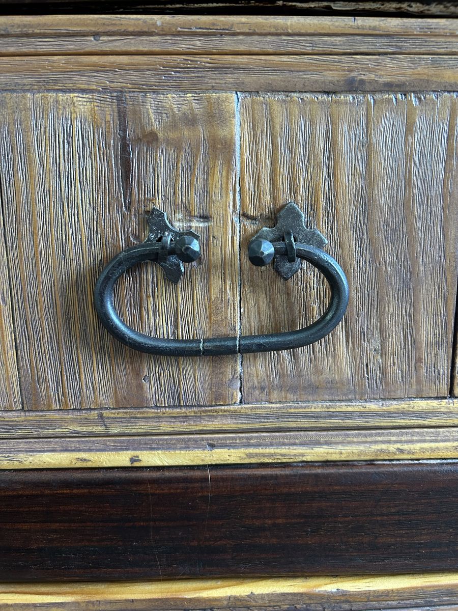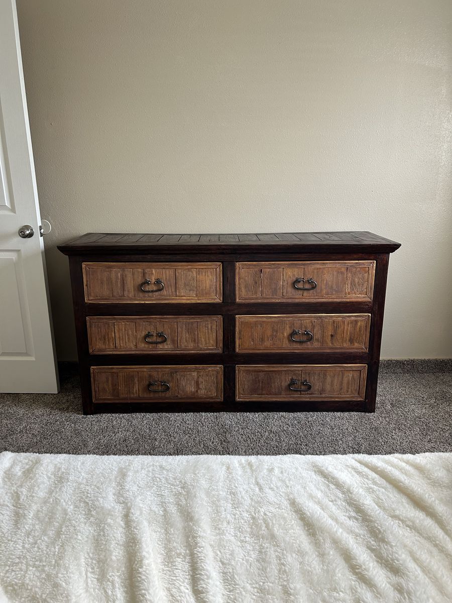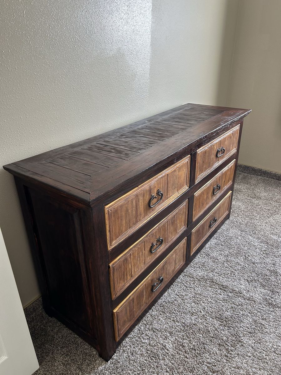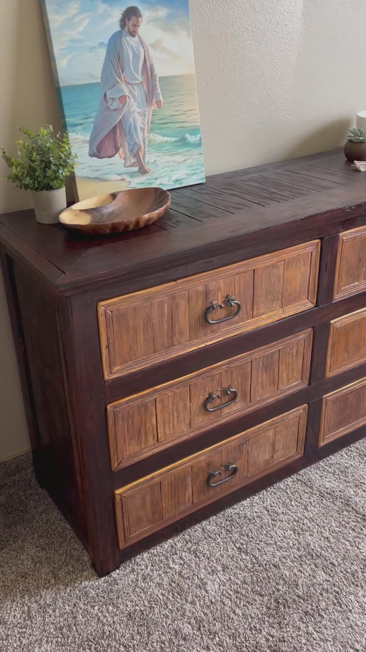 Features: • 6 spacious drawers • Solid wood construction • Hand-forged hardware • Freshly sanded, stained, and sealed exterior • Clean, painted drawer interiors • Perfect statement piece for a rustic, farmhouse, or western vibe • Different wood tones allow it to match a variety of furniture
