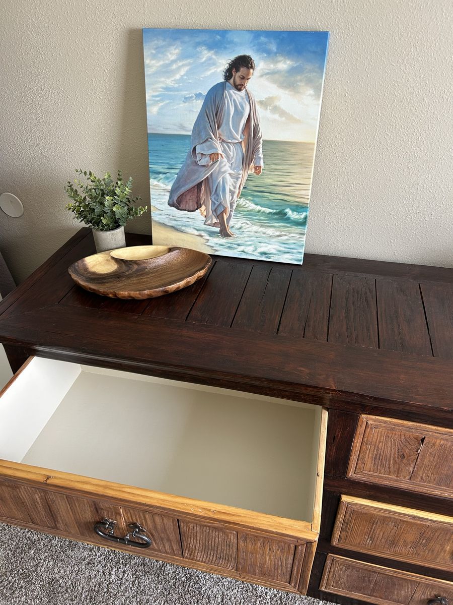 It has been a good solid dresser for us. It’s a one-of-a-kind and a really good find. Don’t miss it! The reason we are getting rid of it is because we’re redoing our room and want a different style for our room. Our loss is your gain!