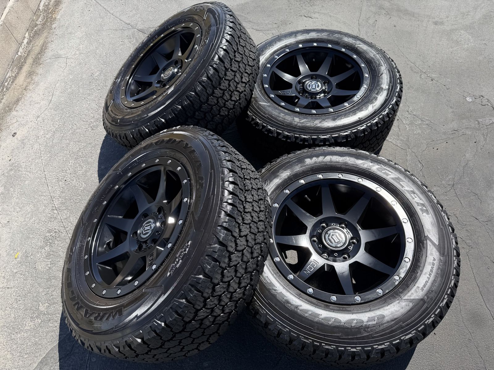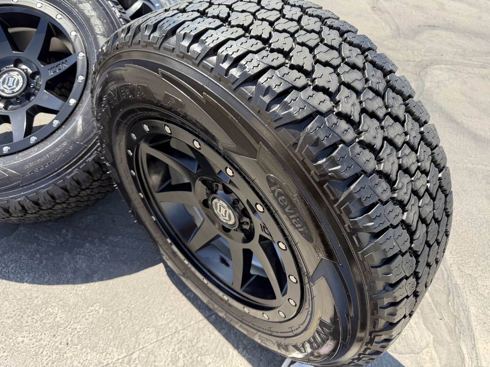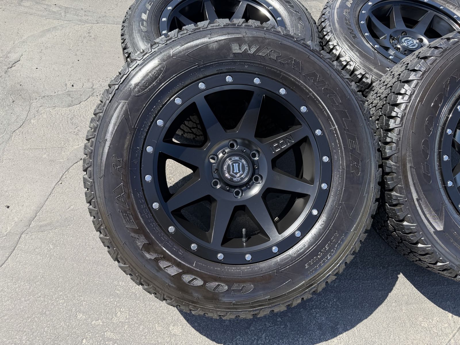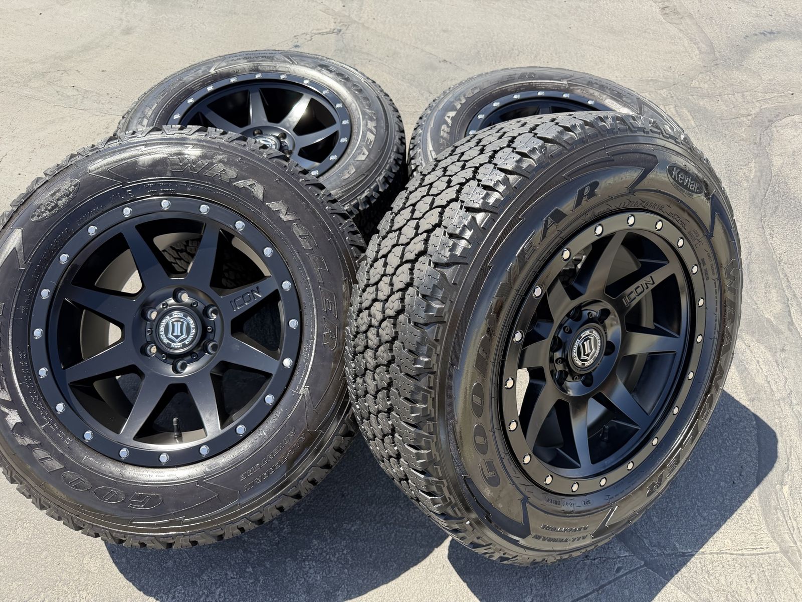 ApplePayLocated in SLC Brand new 18x9 +25et offset ICON Rebound wheels. Wrapped in LT275/65r18 Goodyears AT Kevlar tires. Like new treads 99%. 6x5.5 bolt pattern (6x139.7). These fit Chevrolet Silverado 1500 GMC Sierra yukon tahoe Nissan Titan and Toyota Tacoma. HUGE Savings Call or txt 801-876-0324