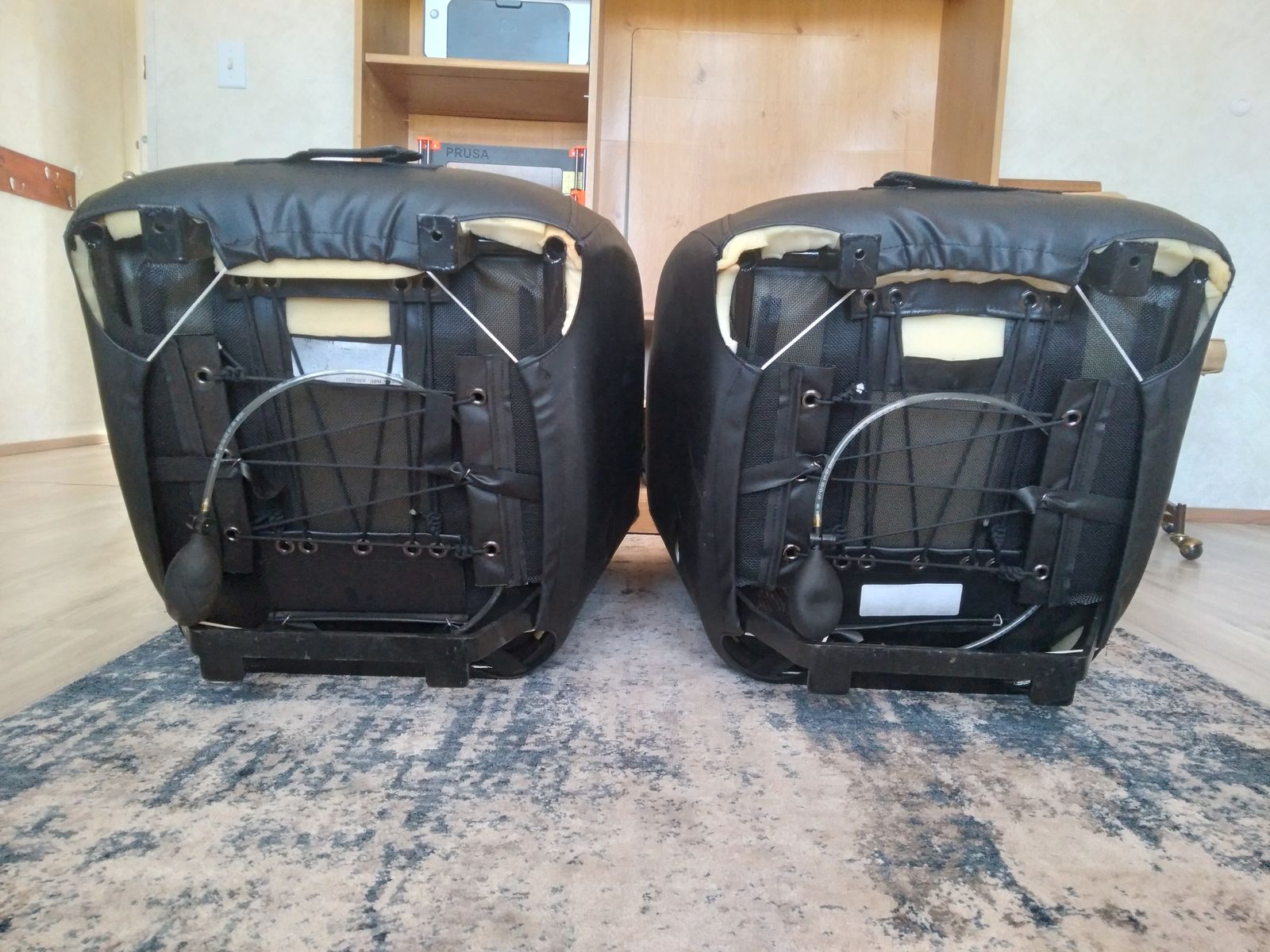 Deleted PRP headrest logo and seat piping was optioned and materials selected as follows: back is Daytona Black vinyl, center section Tuxedo grey tweed, and arms Malibu Sand tweed. Adjustable air lumbar support option was selected on both seats as well.