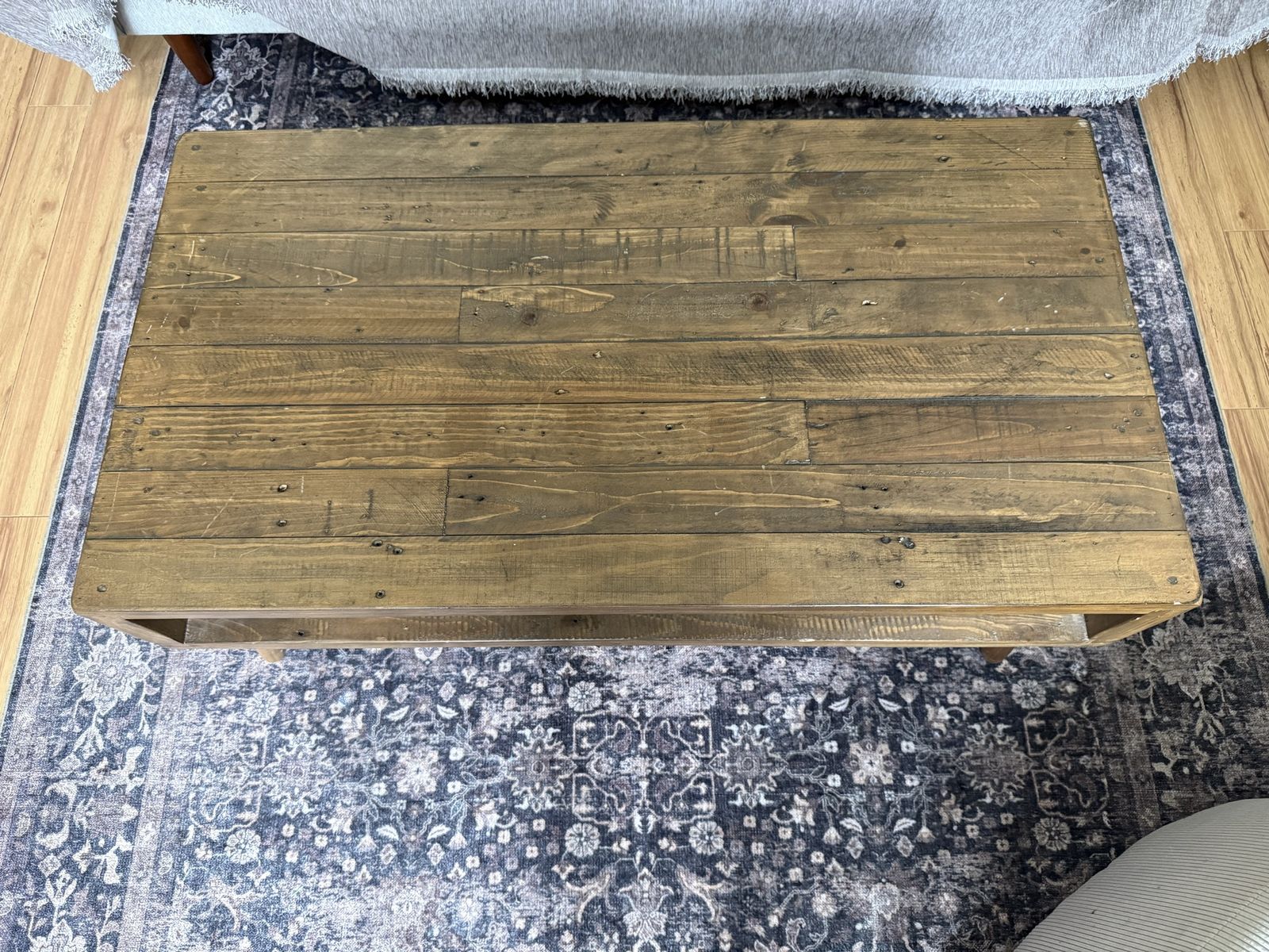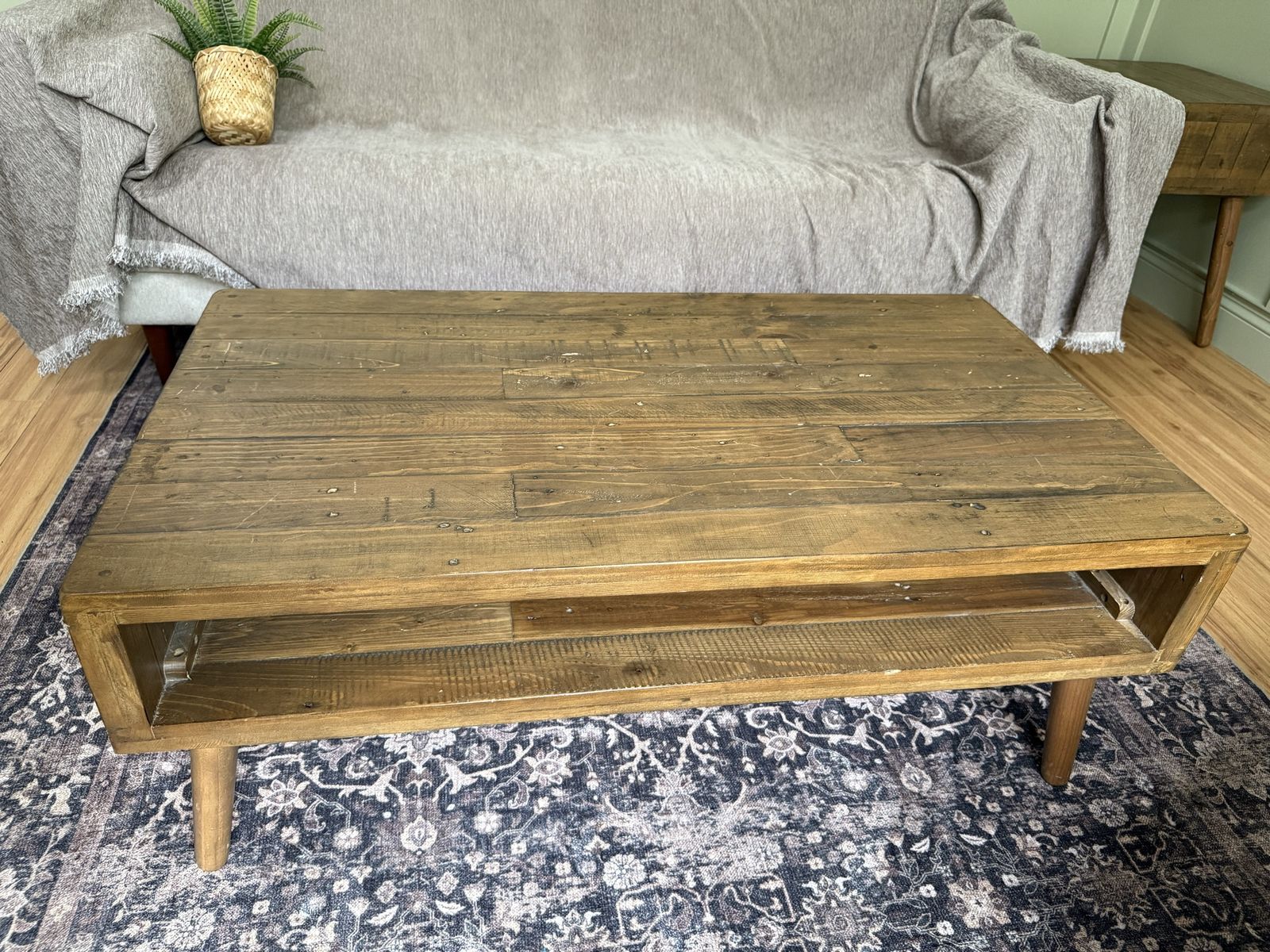 ZelleBrown wide rectangle coffee table for sale. Dimensions are 44"W x 24"D x 17"H Has a rustic/farmhouse feel, sits in my entryway completely unused.