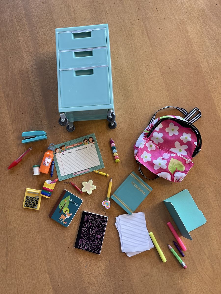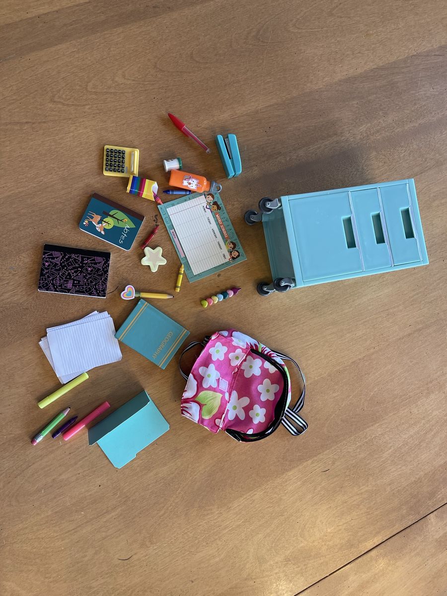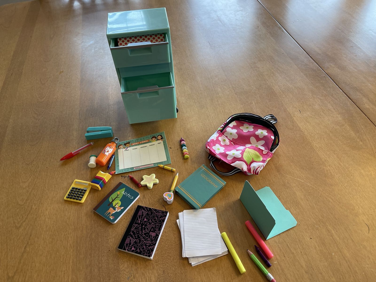 CashAppClassroom school filing cabinet with working drawers and school supplies, includes backpack, art box with supplies and a school lunch