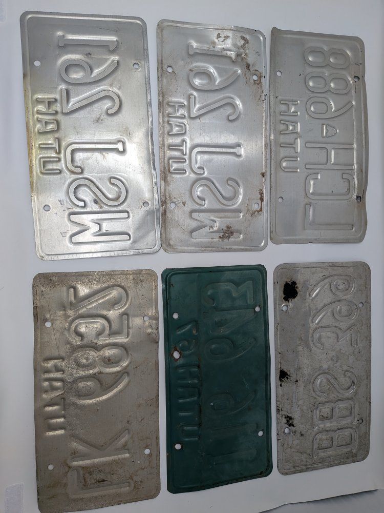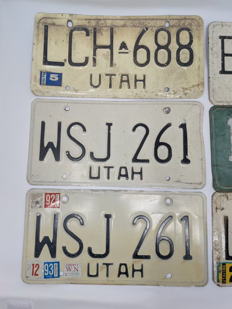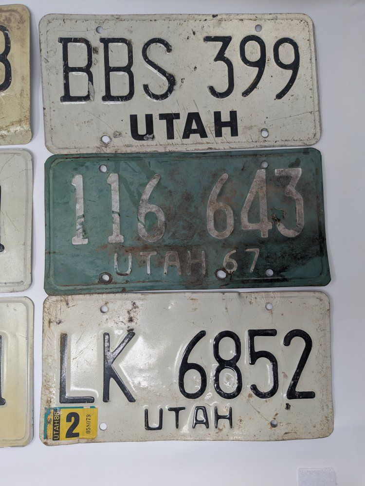 Selling this lot of 6 vintage Utah license plates. Great for garage decor, man cave decor, wall art, collections, or display. Includes a mix of older Utah plates with different years and registration stickers still attached on some of them. They show honest age and wear from use and storage, including scratches, dirt, discoloration, bends, and surface wear, which gives them a cool original patina. A nice mixed lot for anyone who collects old license plates or wants some authentic Utah pieces for display.