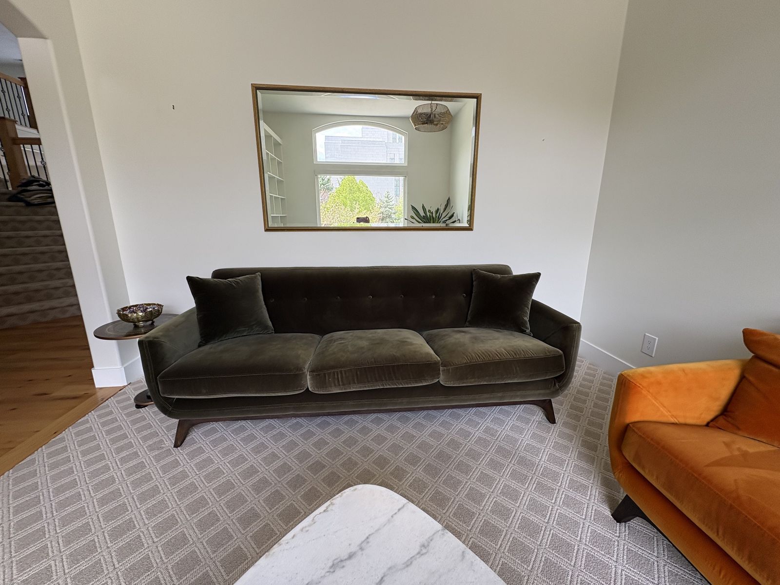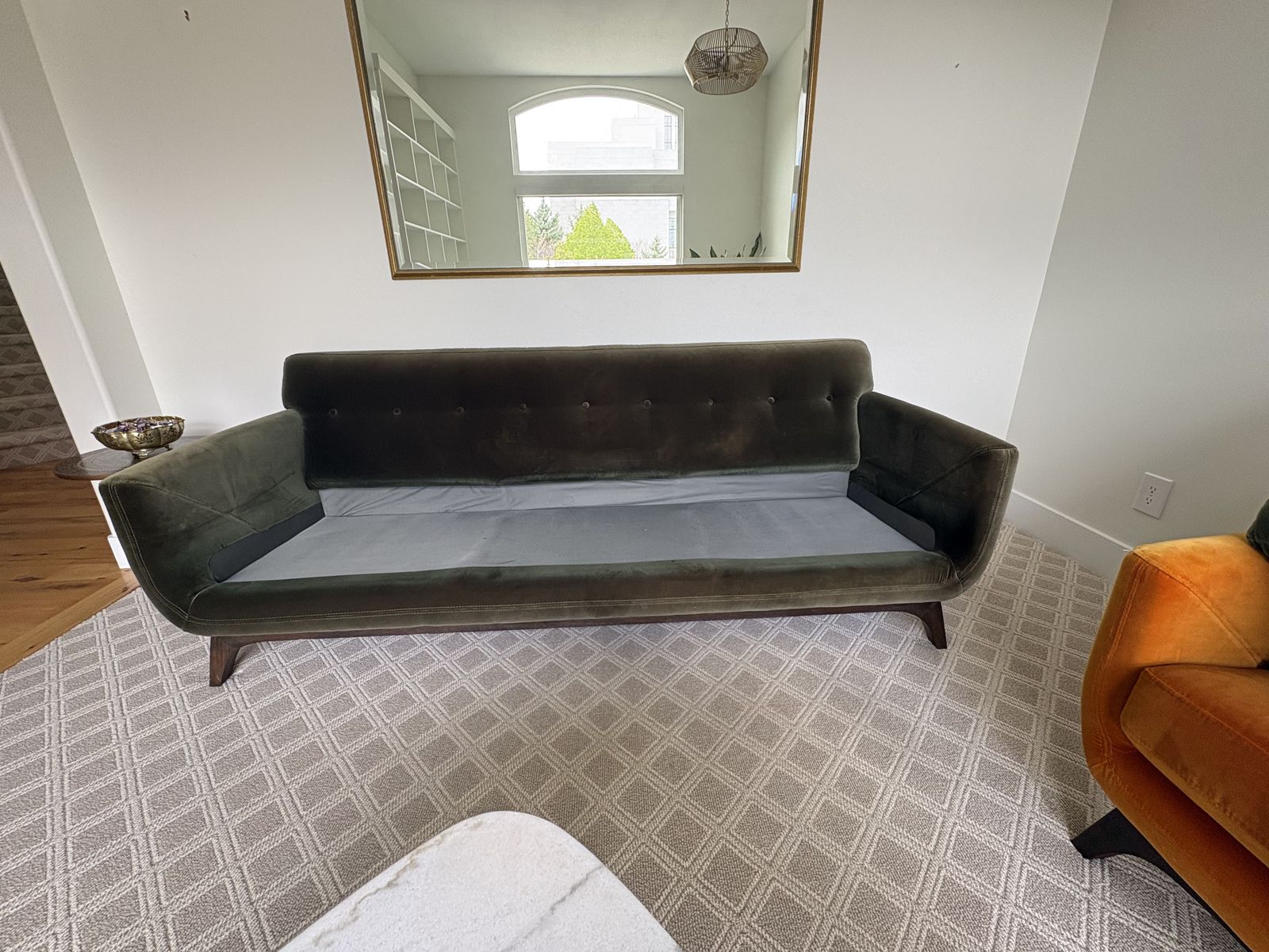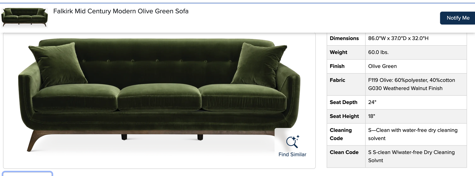 VenmoFalkirk Mid Century Modern Olive Green Sofa. Measures 86" x 37" deep x 32" tall back. 18" floor to seat. 60%polyester, 40%cotton. Weathered Walnut Finish. $1500 cash/venmo in Draper