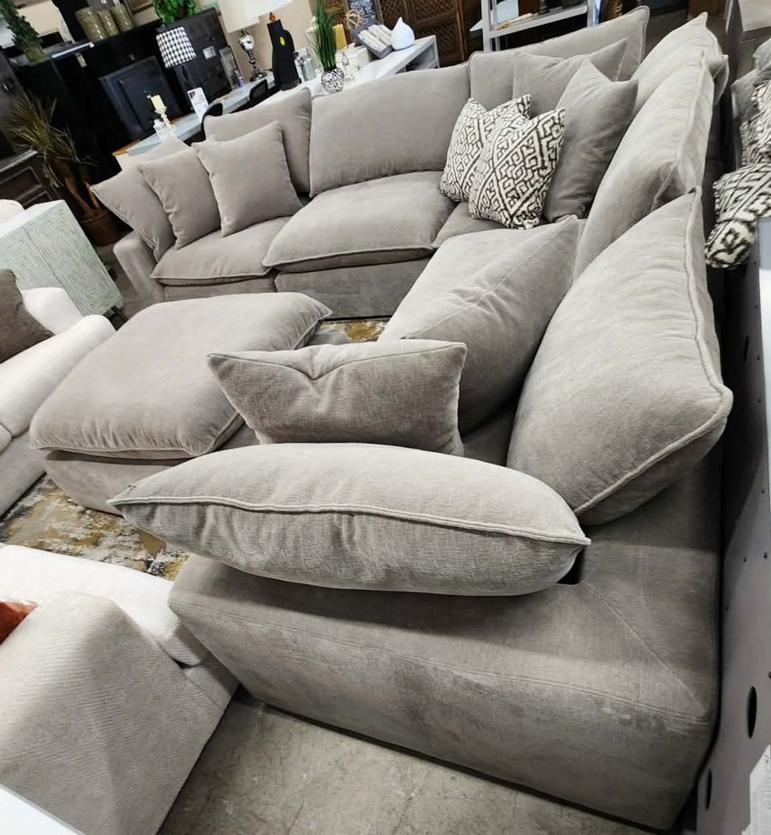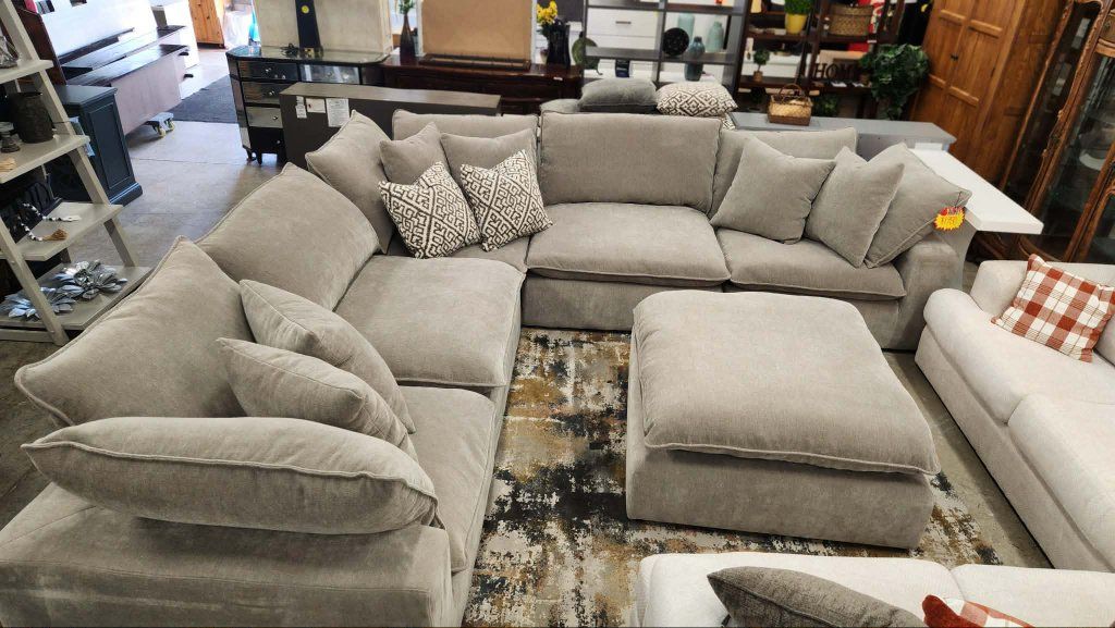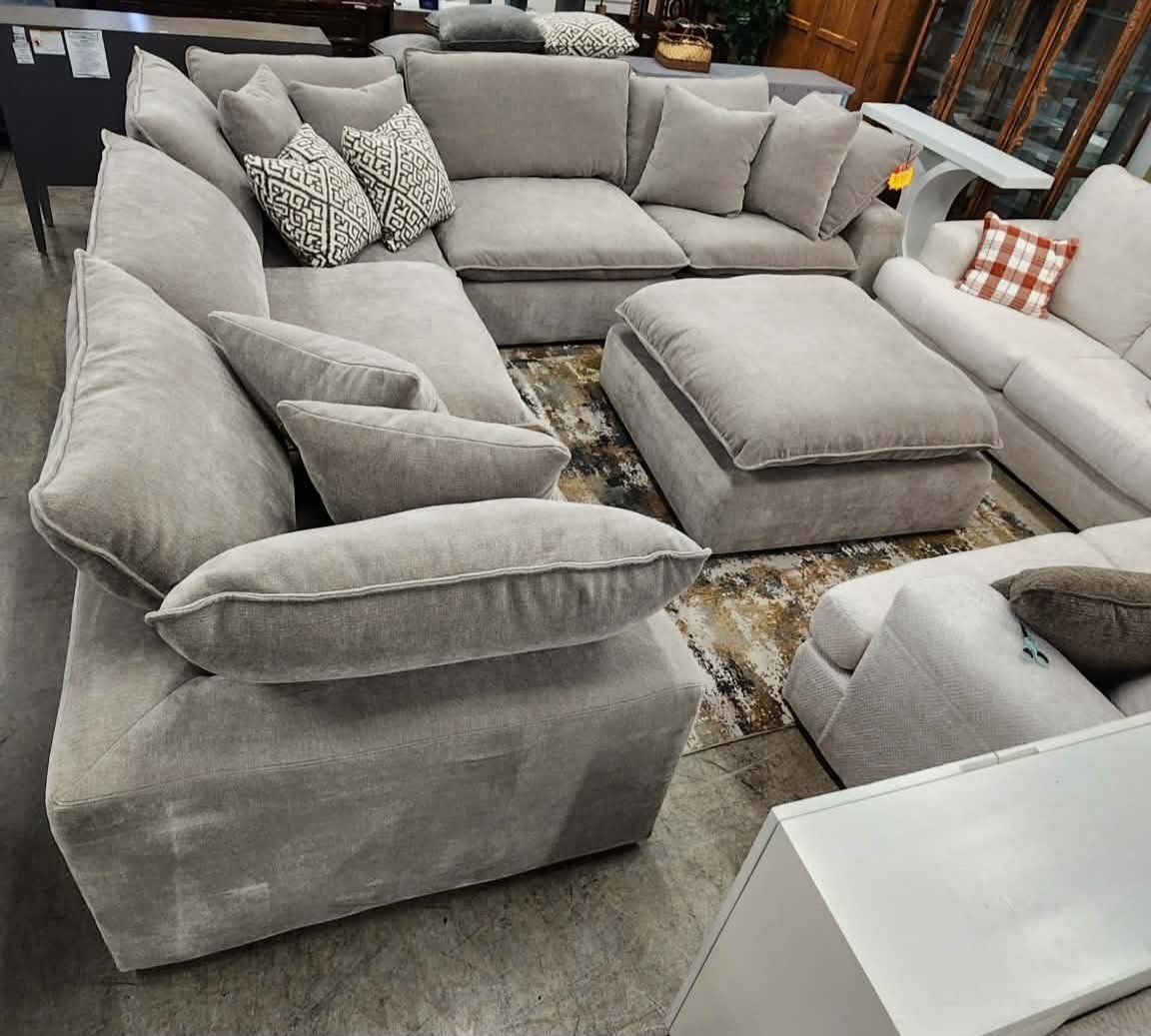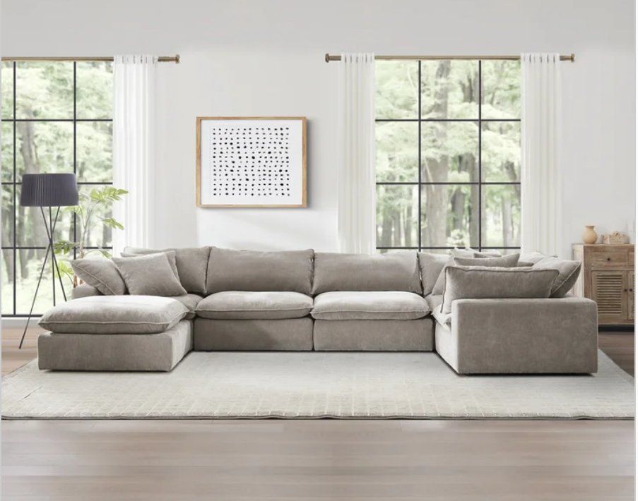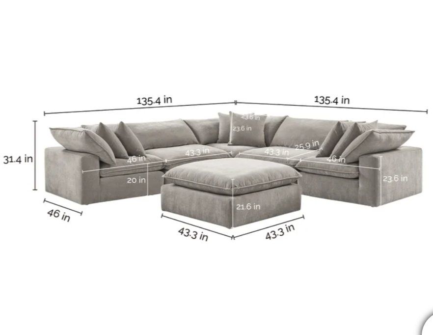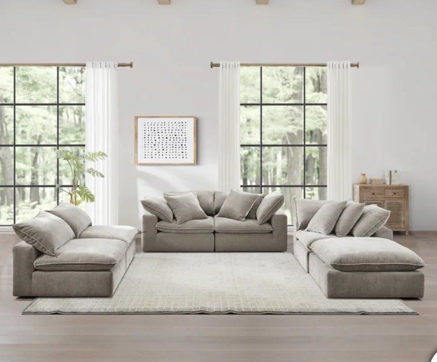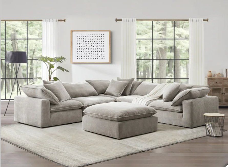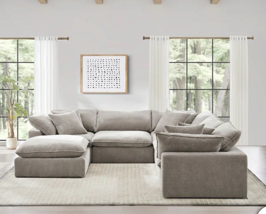 ️Sereen 6-piece Fabric Modular Cloud Sectional FEATURES: ️ Three corners seats, two armless seats, and Ottoman. Loose Reversible Feather Blend Cushions. Configurable Modular Design, can be arranged multiple ways to fit your space! DURABLE ELEGANCE High-grade polyester fabric ensures long-lasting use while maintaining a sophisticated appearance. Deep, plush cushions filled with a mix of feather & foam and enhanced with loose, adjustable RDS (Responsible Down Standard) Certified feather blend cushions, combine for personalized comfort and durability. Includes 6 Matching Pillows ️ Retails $2599, our price $1780!