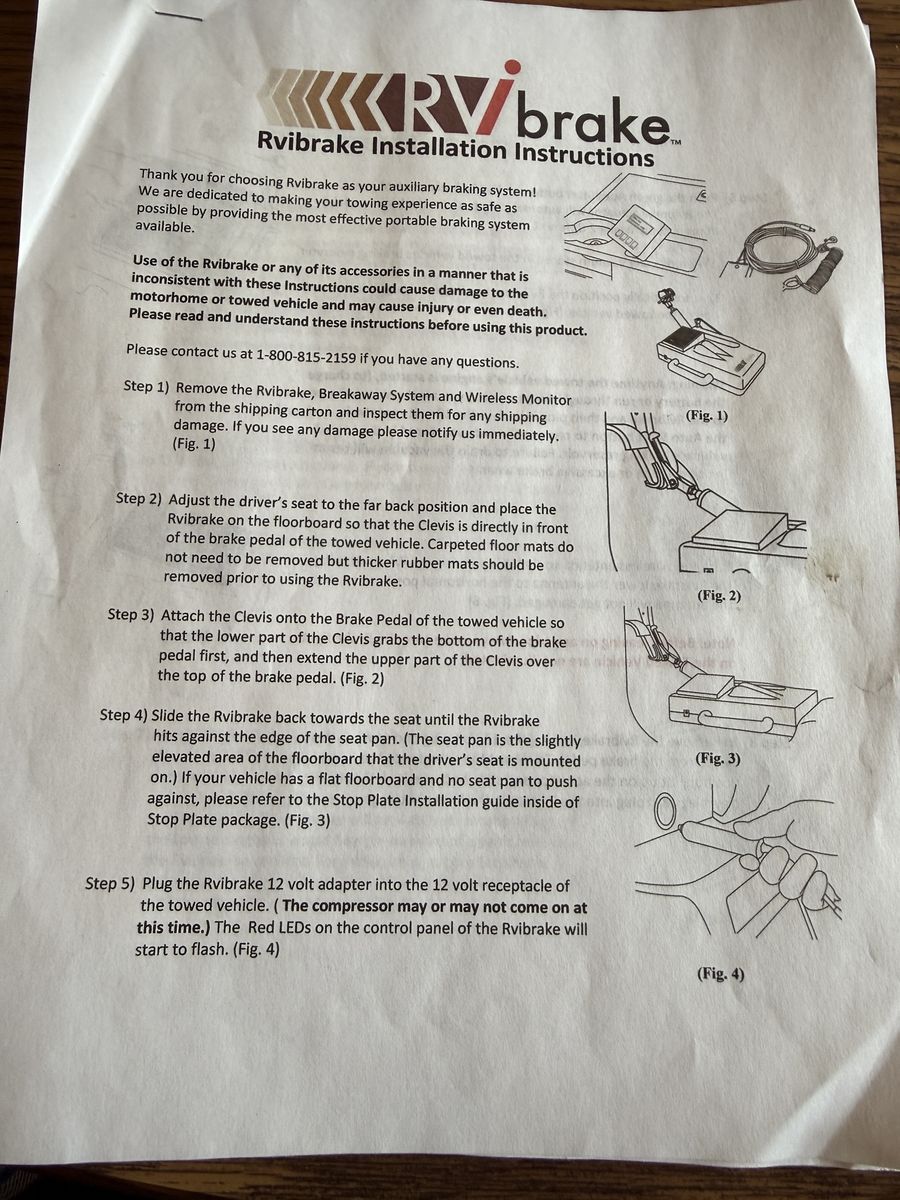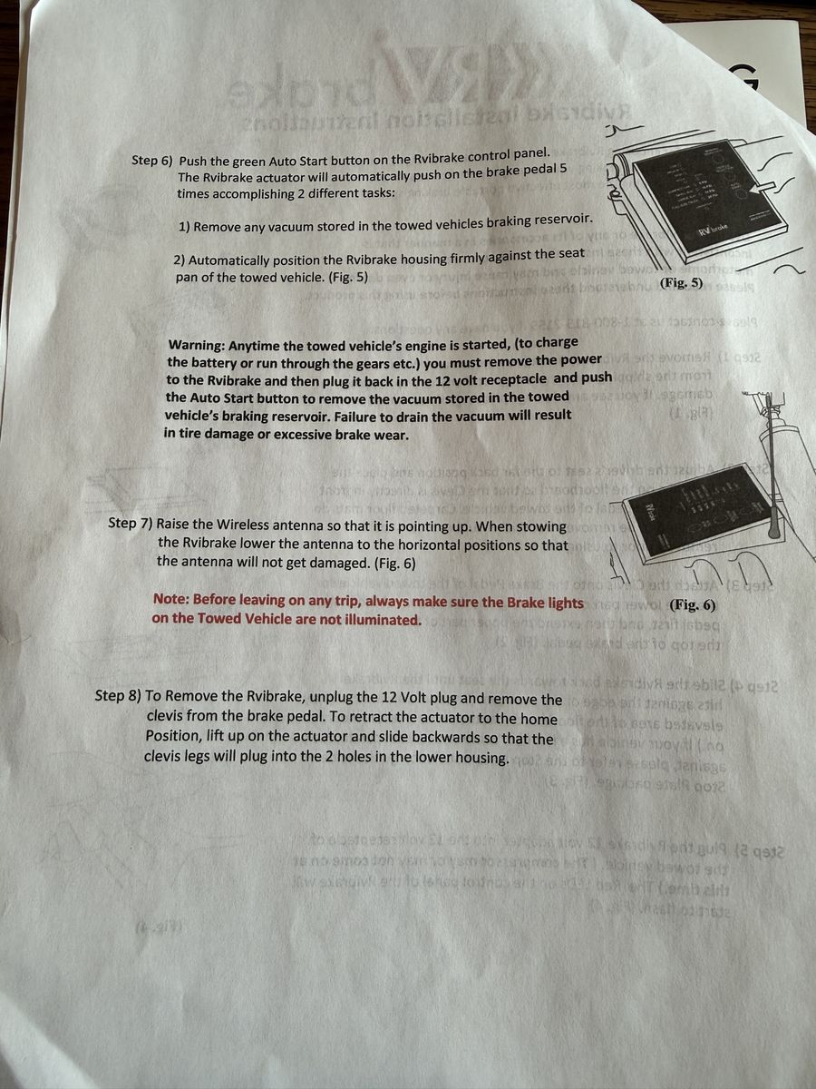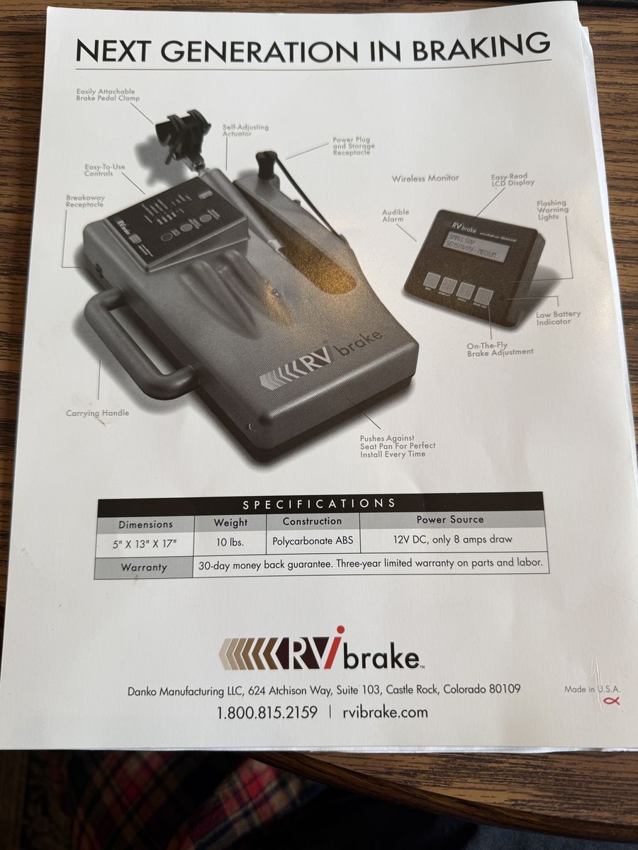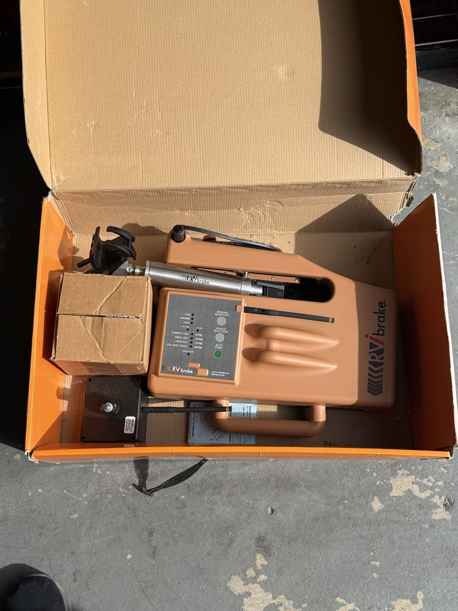 Brake system for a vehicle in tow. Useful for towing a vehicle behind an RV.