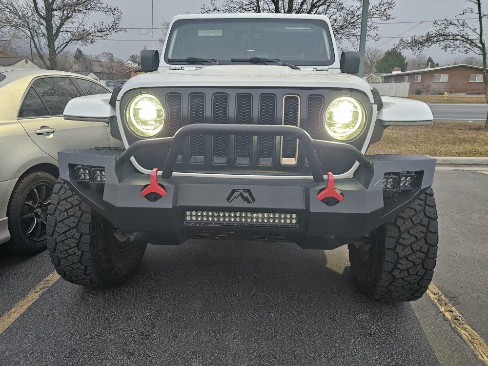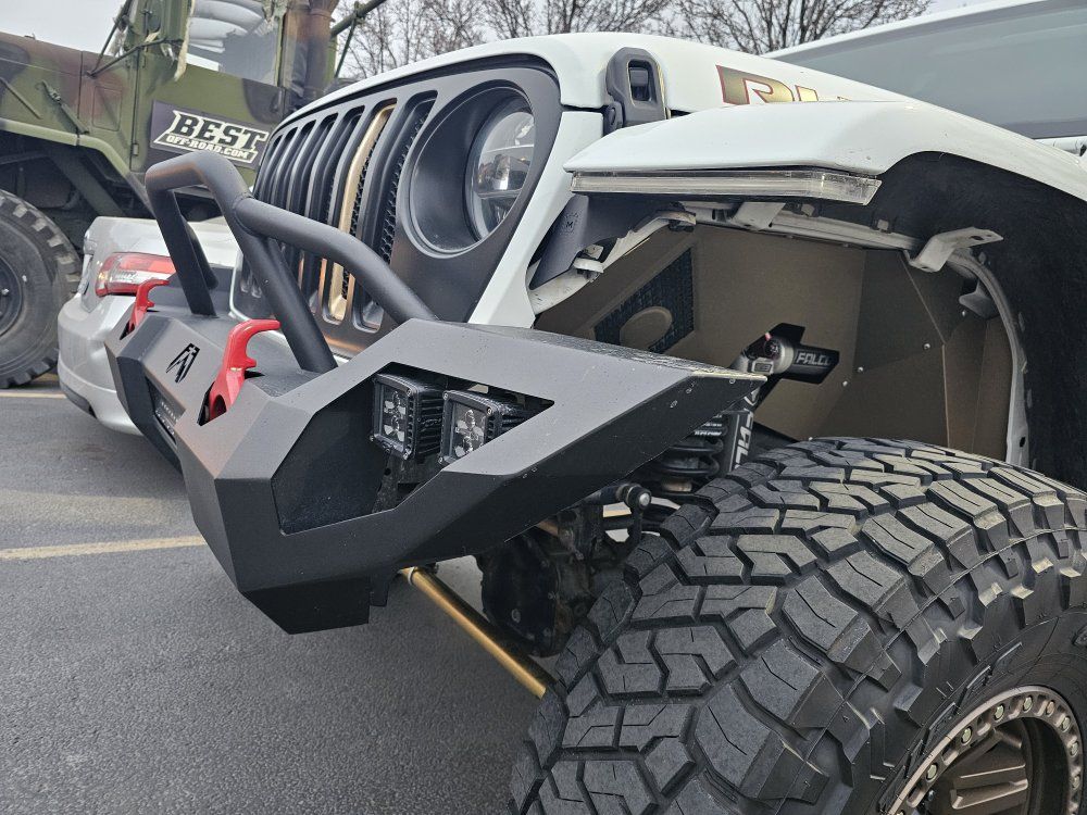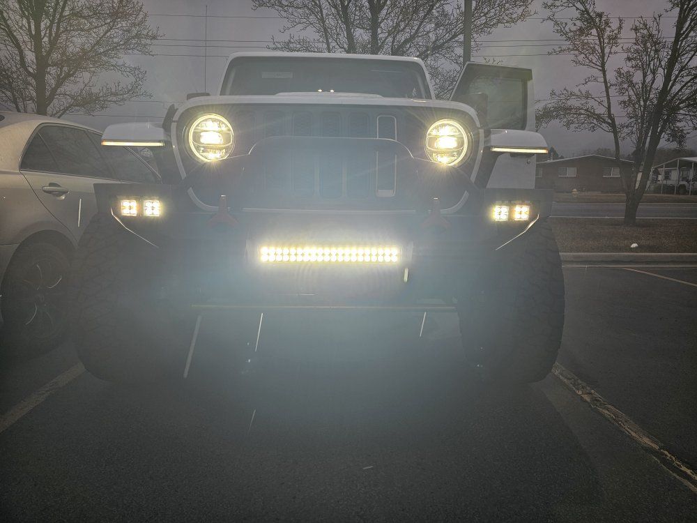 ZelleFab Fours Vengeance front bumper for 2018-2025 Jeep Wrangler JL 20" KC Hilites Light Bar 2 sets of Rough Country 2" Daytime Running Lights, 1 set is white and the other set is amber