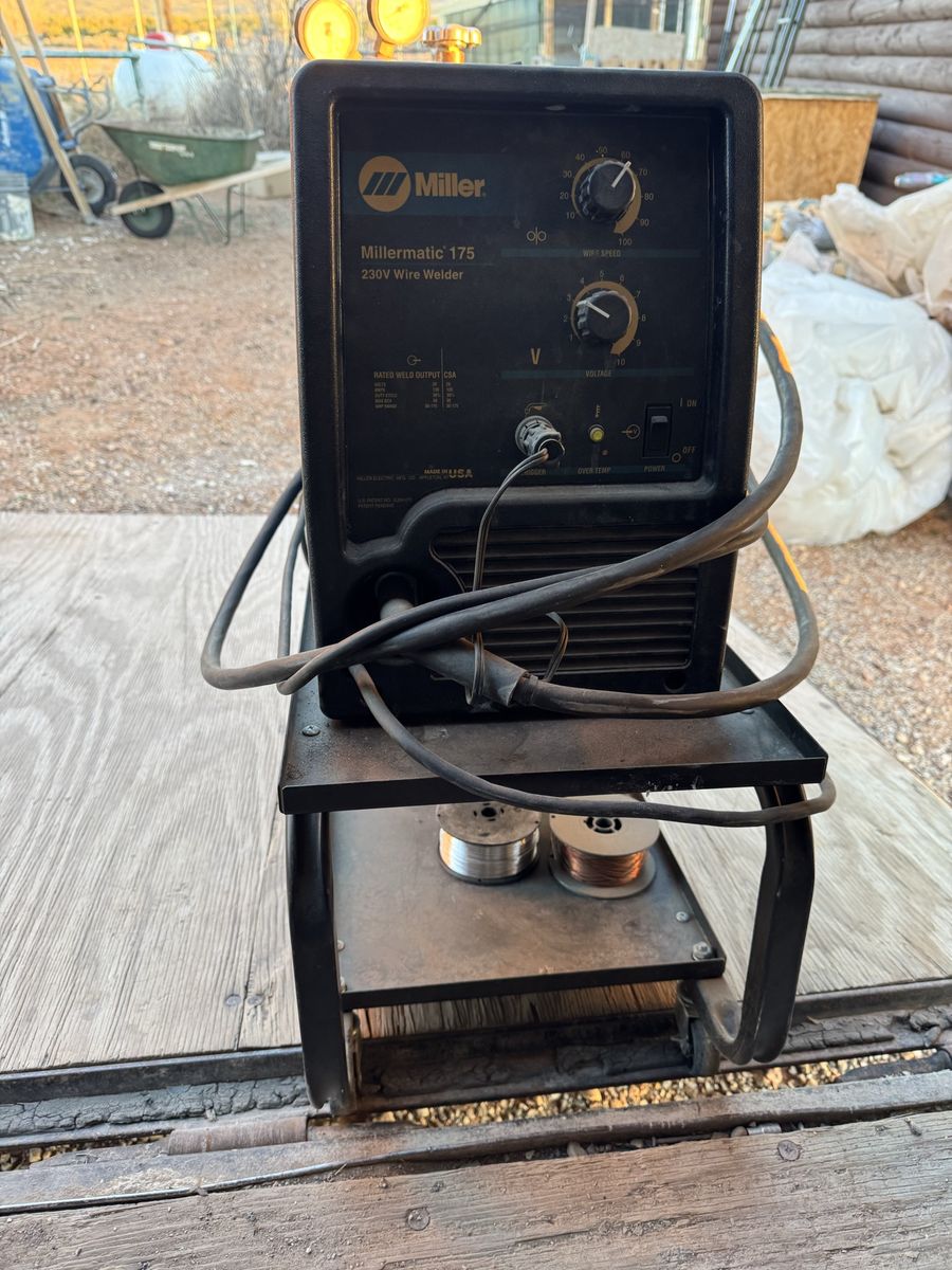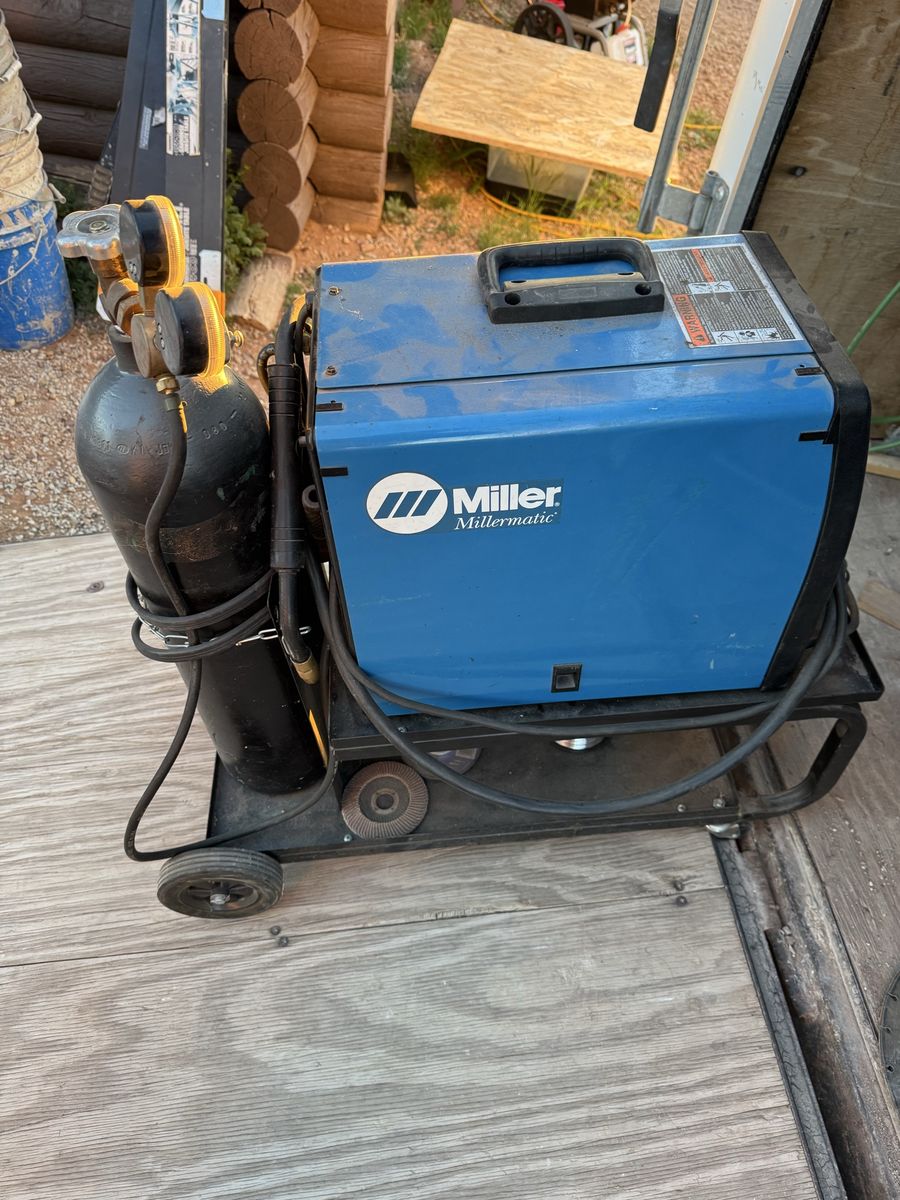 Miller mig with cart, bottle, regulator, and couple spools of wire