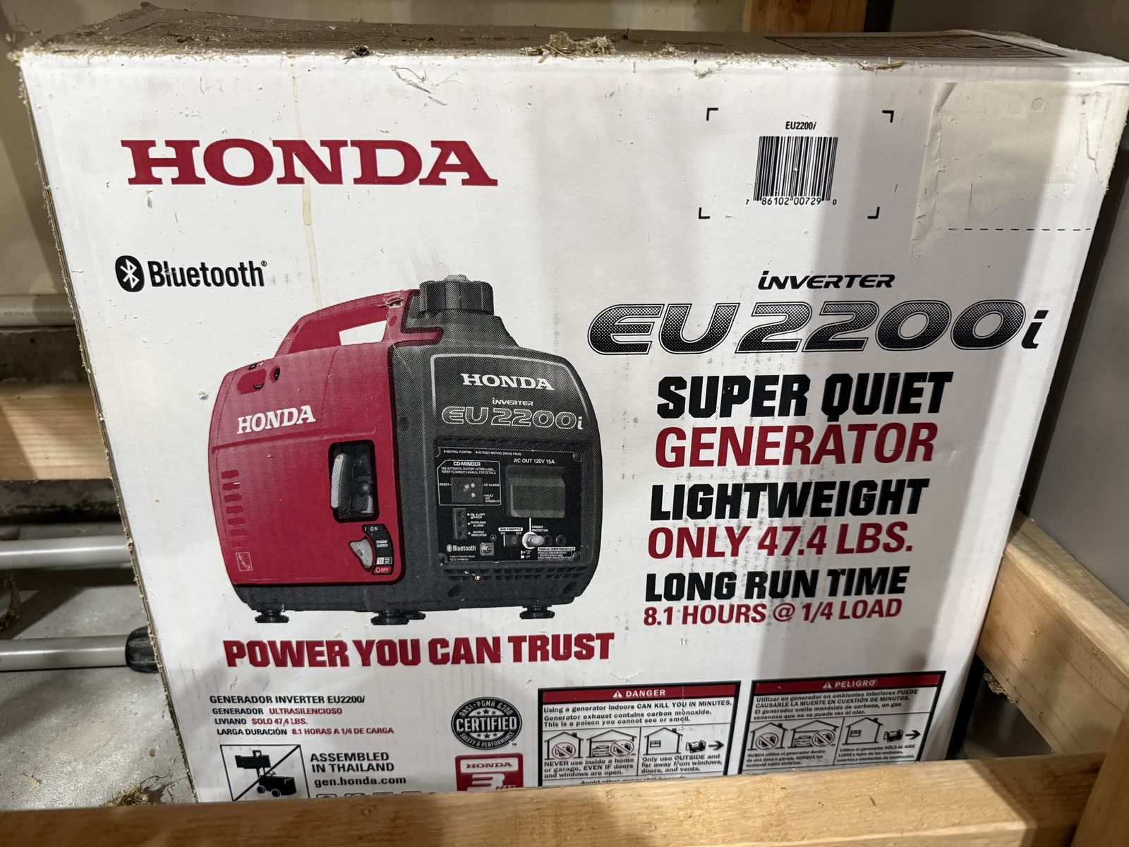 VenmoHonda EU2200i, 2200-watt (max) portable inverter generator designed for quiet, reliable power (1,800W continuous) during camping, RVing, or home outages. It weighs under 50 lbs, features a Honda GXR120cc engine, Bluetooth app connectivity, and Kohler-style CO2 safety sensors. It runs 3.2 to 8.1 hours on less than a gallon of gas. This generator was used once for approximately 1 hour during a power outage.