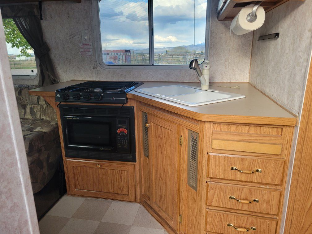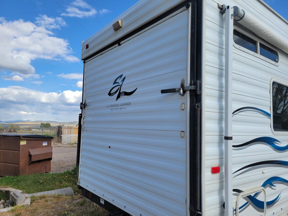 2005 23ft Super Lite Toyhauler by Weekend Warrior. A trailer with the benefits of a toyhauler and the convience of a travel trailer. Sleeps 6. 100 gallon water tank. 40 gallon black and grey tanks. 4000 Onan Ultra Quiet generator, down bed, 3500 lb electric jack, pass through storage, lithium batteries, LED lights, awning, and fuel station. All appliances in good working order. Outside shower and wash station. Screen room for rear door. Skirting avalable for cold weather. Well maintained, stored inside. Clear title in hand. $7,500. Brent 208 241 3646