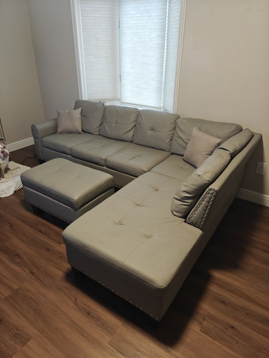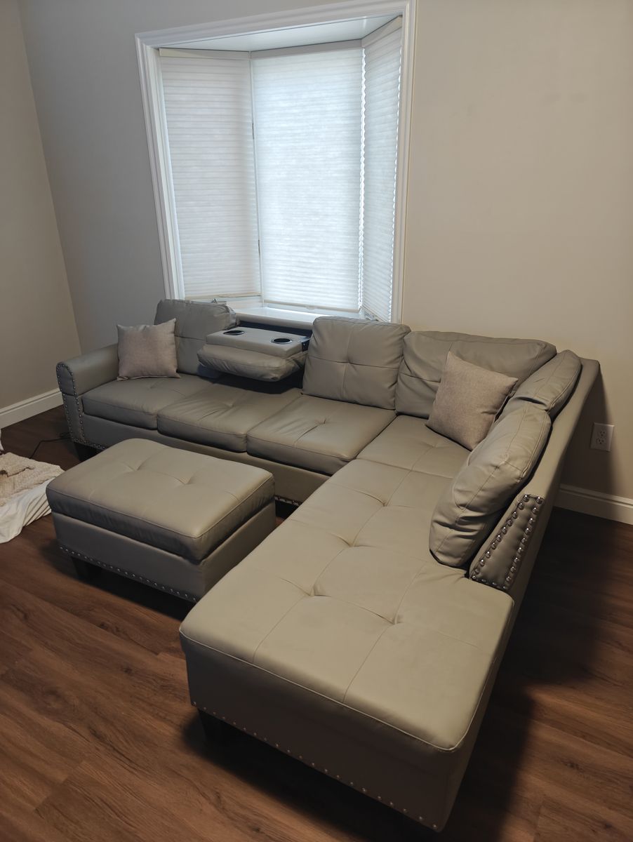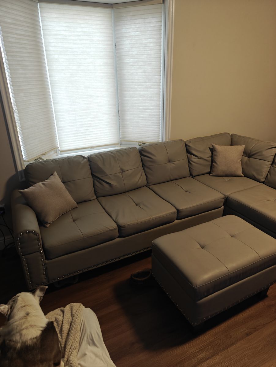PayPalBeautiful grey faux leather couch with built in cup holder and ottoman with built in storage (dog not included) LOL.