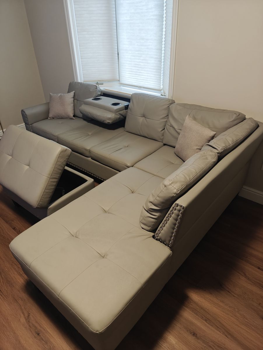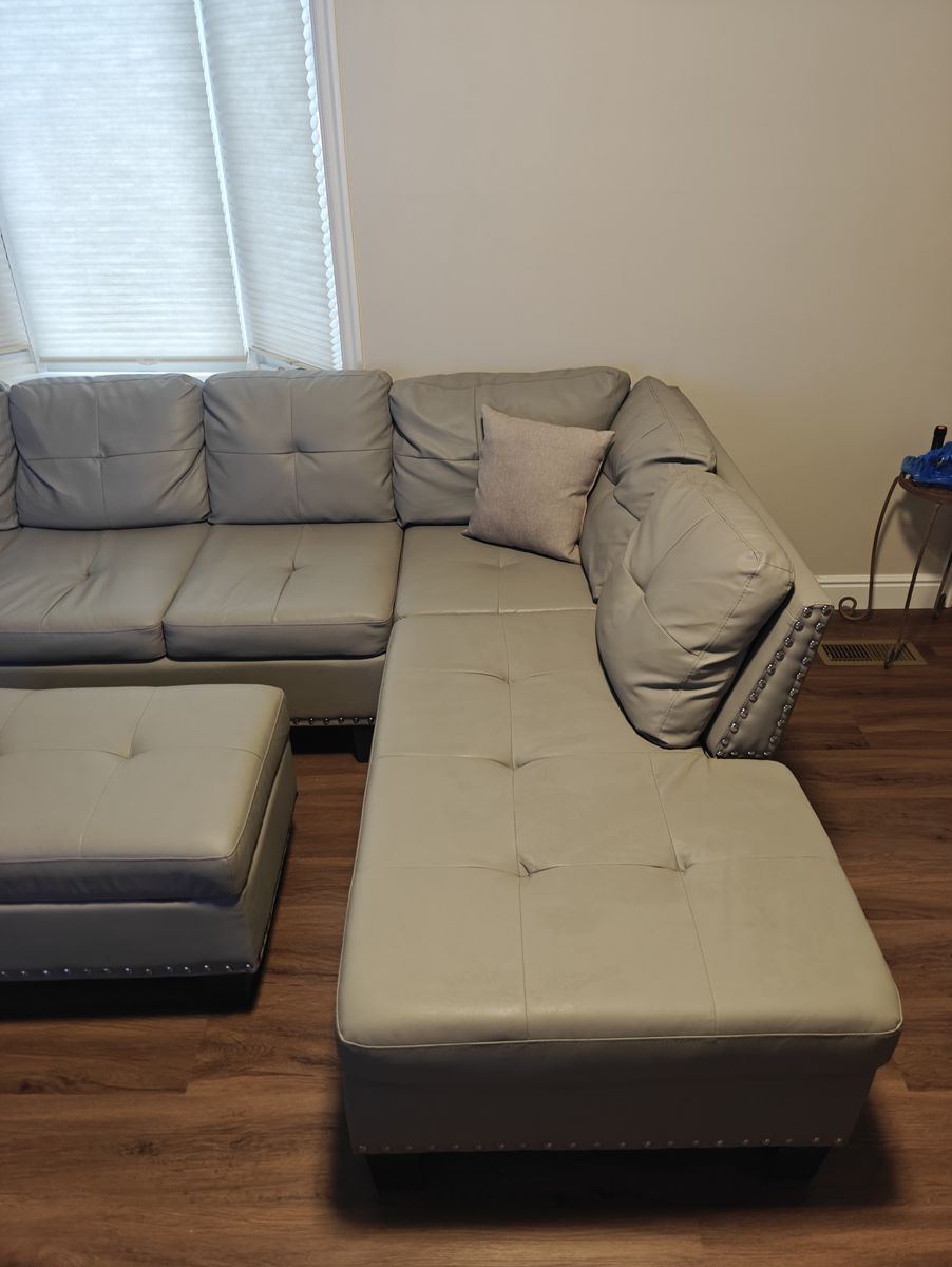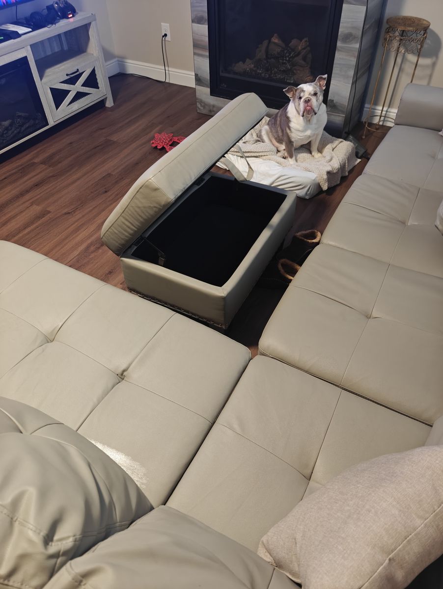 PayPalBeautiful grey faux leather couch with built in cup holder and ottoman with built in storage (dog not included) LOL.
