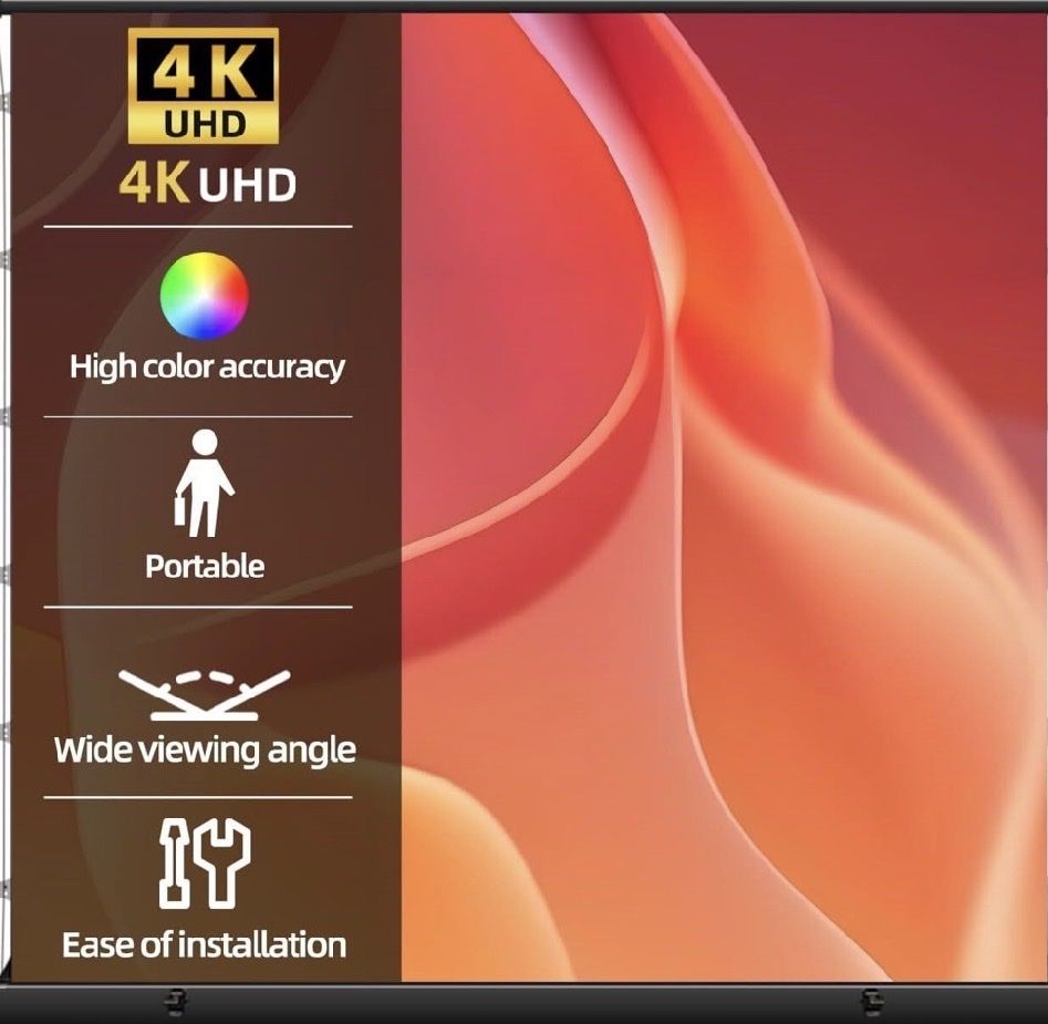 Key Features: • Massive 100-inch diagonal screen (16:9 aspect ratio) • Tab-tension design for a perfectly flat, wrinkle-free picture • Portable & super easy to set up anywhere • Great for home theaters, outdoor movie nights, business presentations, classrooms, or backyard gatherings • Adjustable height for perfect viewing