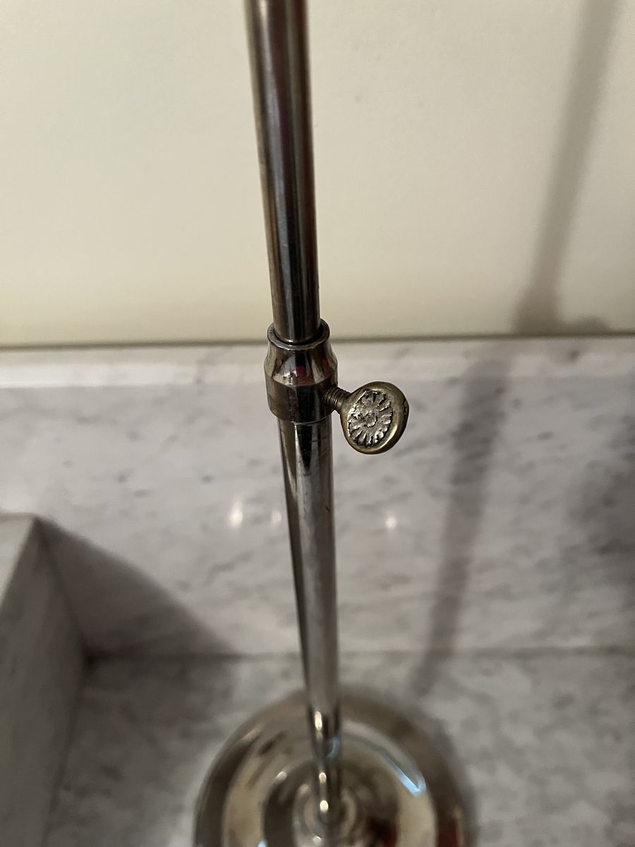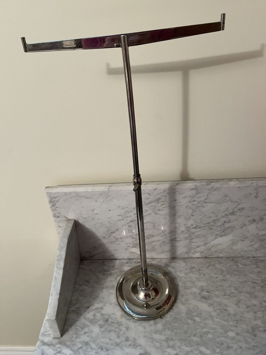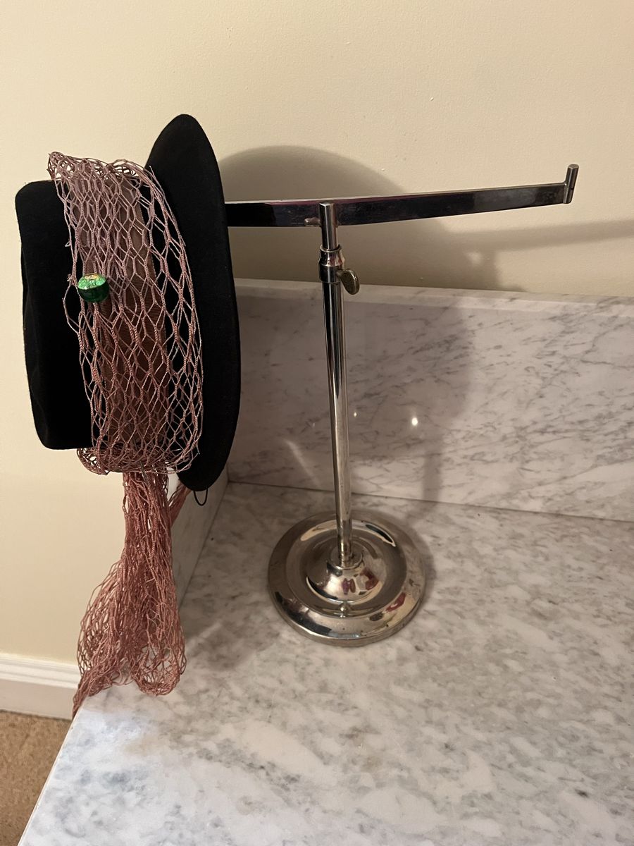 VenmoThis would have been used in a general store type setting. Because it holds two hats for display. Which is unusual, most stands only hold one hat. This is free standing and is made of a heavy type metal. Which is great, so it won't tip over. What is also great about this is that it is adjustable, it will go up and down. So you pick the height you want. This is done by a twist knob as shown in the pictures. It can go from 13 1/4 inches to 22 inches tall. It is marked on the bottom Curtis & Leger Fixture Co. Chicago. The heavy base measures 5 1/2 inches across. This is a pretty silver color. It could also hold necklaces or bracelets. Hat in the pictures is not included. Price is firm.