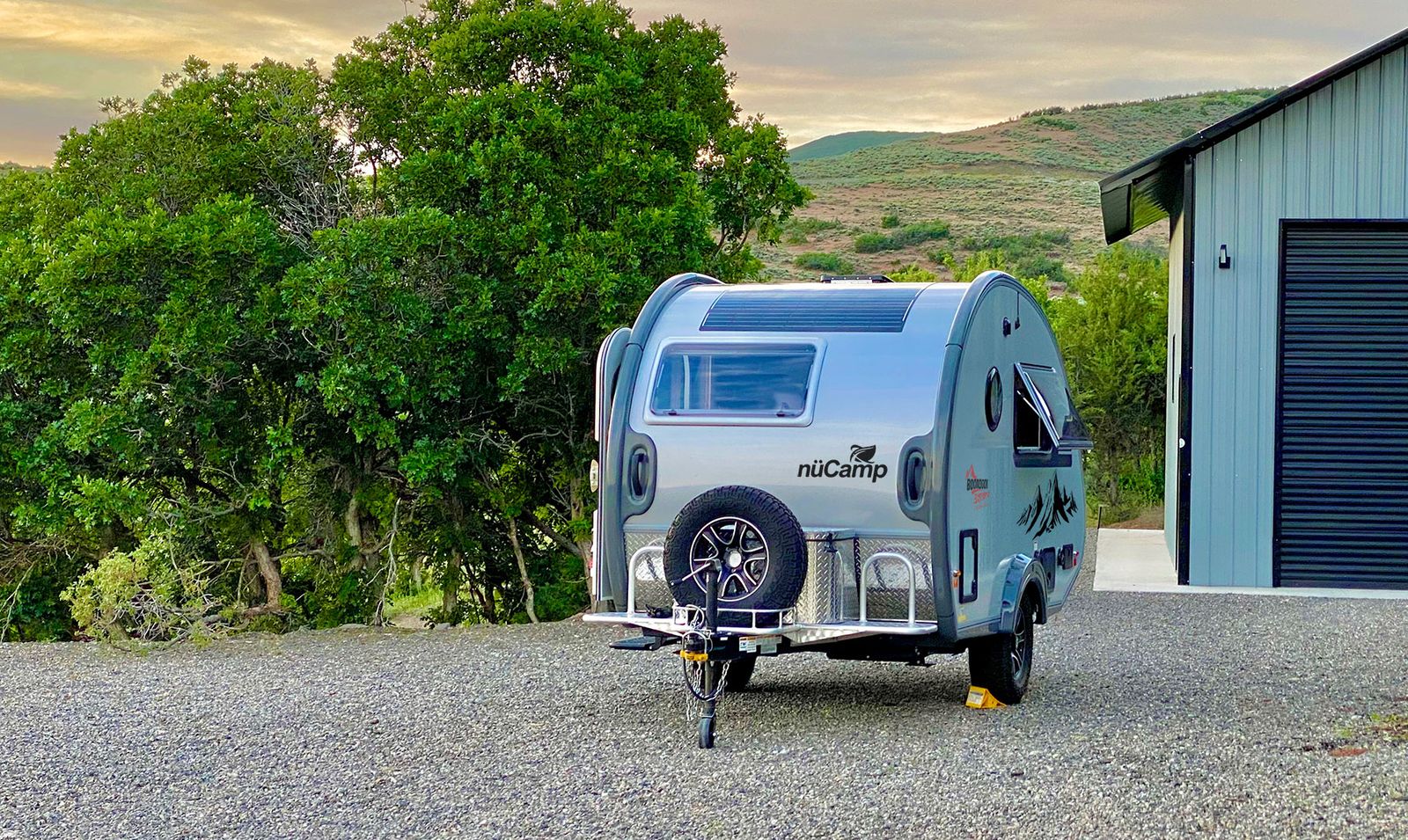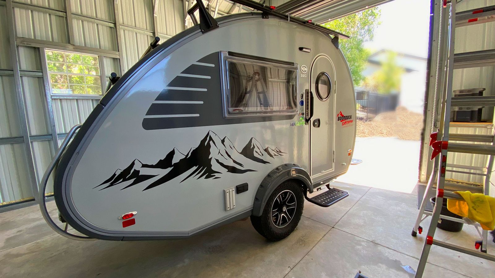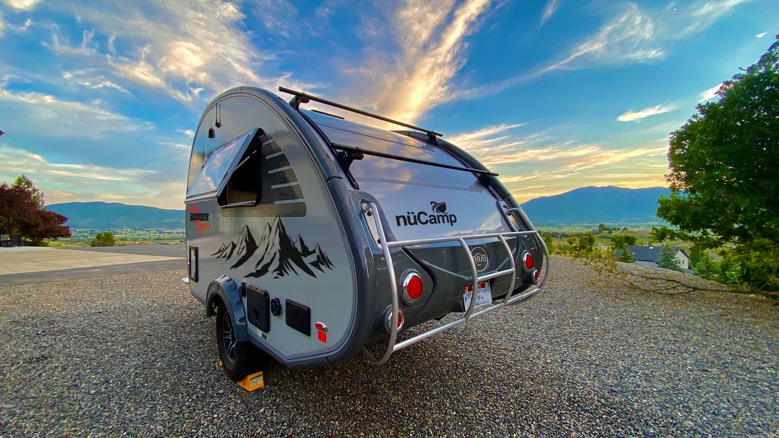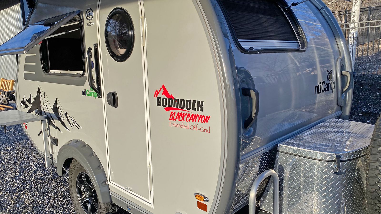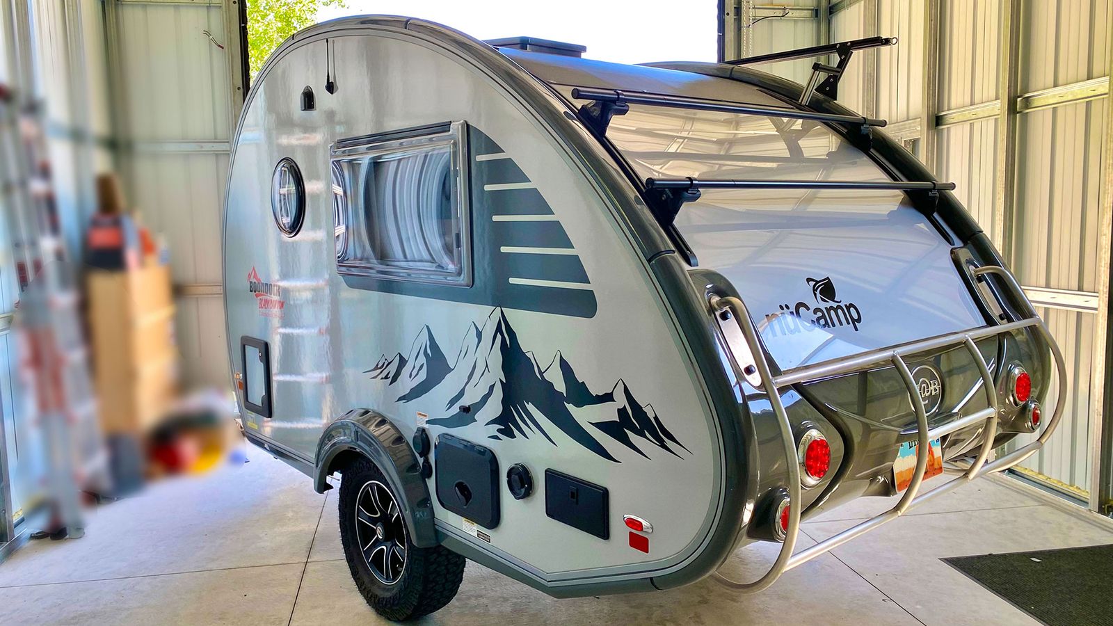11)Graphics upgrade intended for a product photoshoot. Modern mountain with gray accent on window (not an option from Nucamp), and “extended off-grid” badging to represent the multi-day off-grid capability of this small trailer.