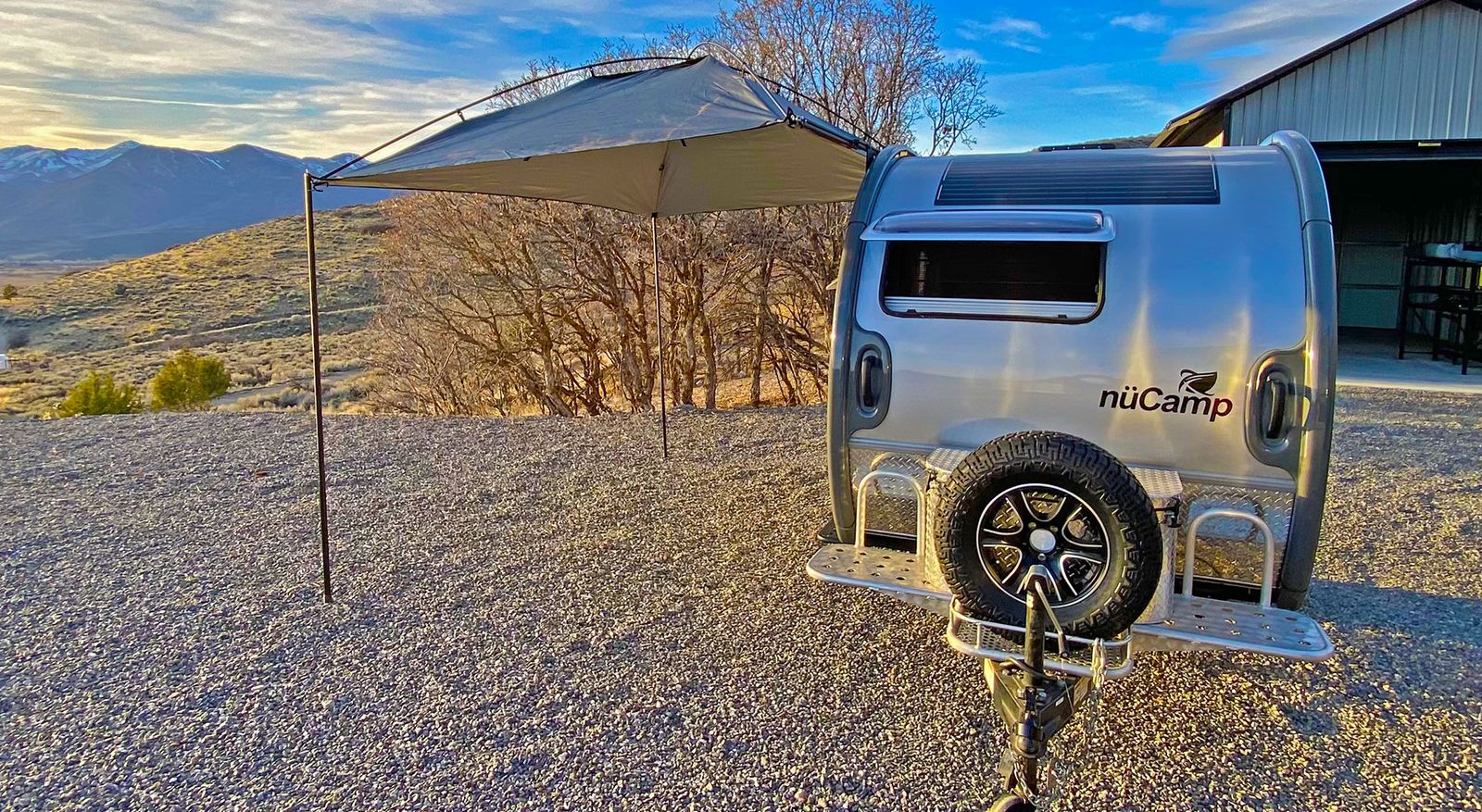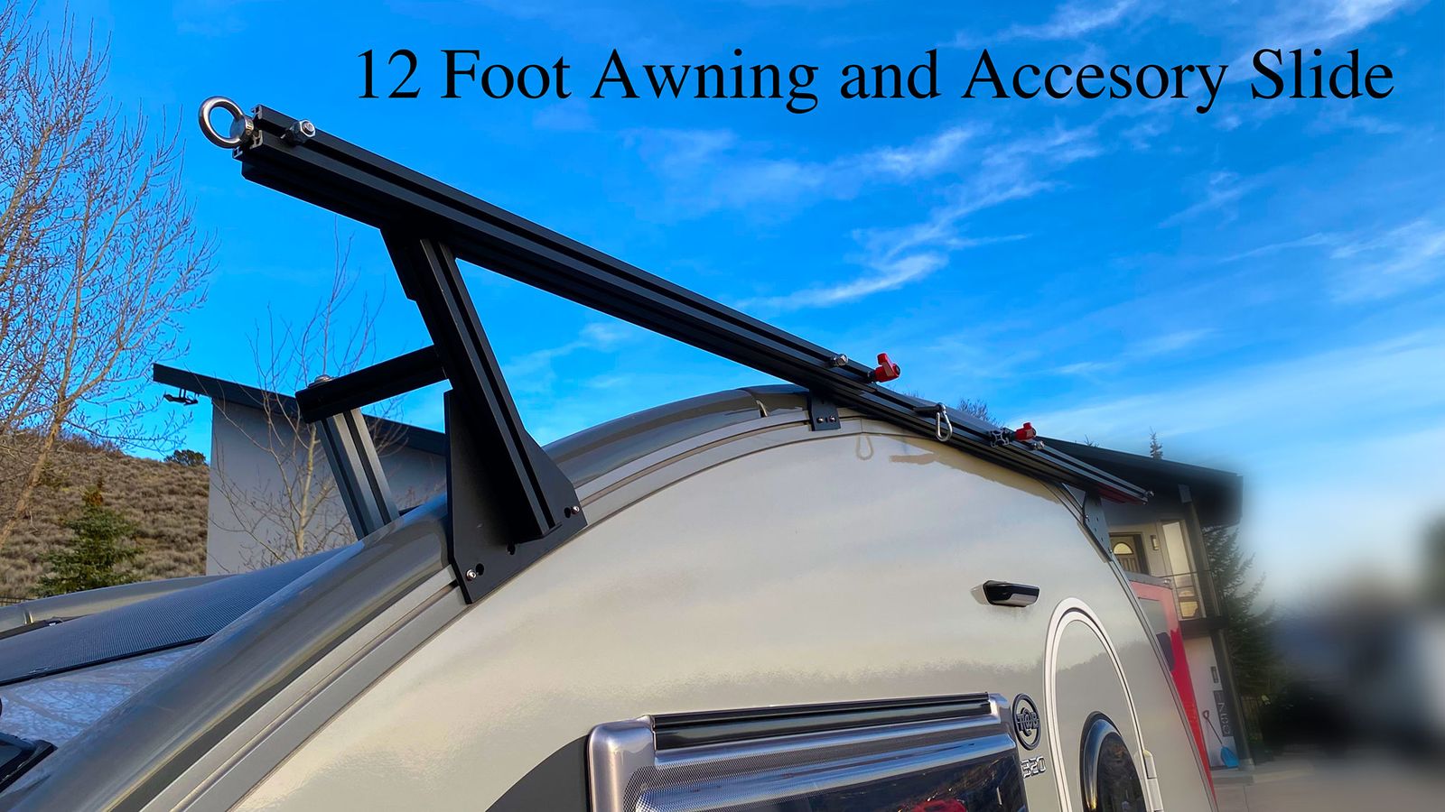 12 foot X 9 foot Moonshade (included) with a sliding awning rack (included) that contracts or expands allowing the awning to flip 9 foot to the trailer or 12 foot to the trailer. The awning systems NuCamp offers are hard to use and block the view on the sides. This is lightweight and large. I developed this for a client potentially looking start up products related to RV/overland solutions.