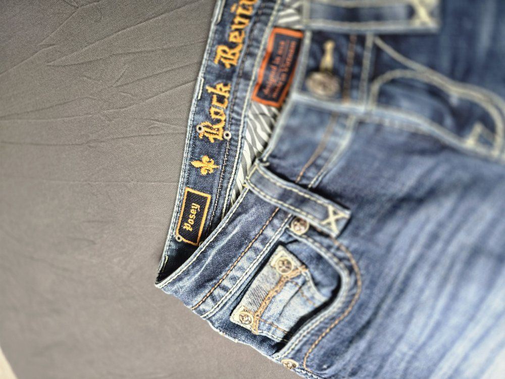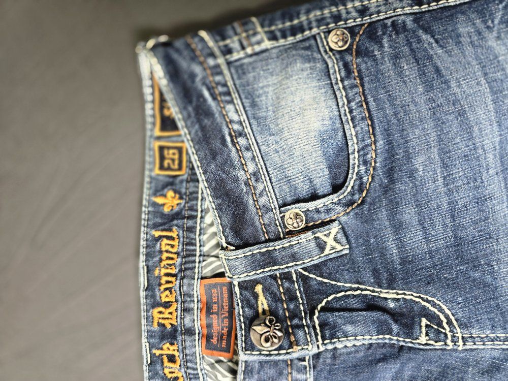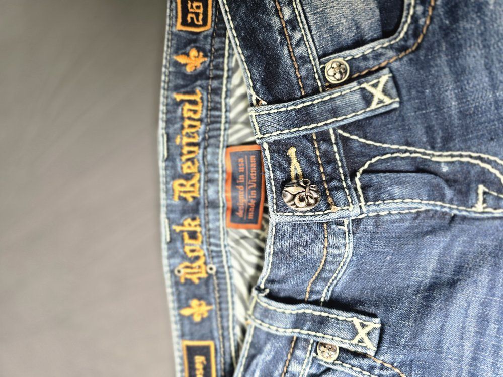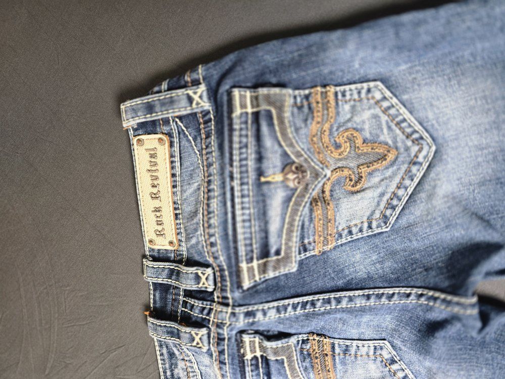 ZelleBrand: Rock Revival Model: Posey Skinny Size: 26 Condition: Pre-owned; excellent condition. (Check photos for hem and hardware details). Style & Design: Elevate your denim game with these authentic Rock Revival "Posey" Skinny Jeans. Known for their high-quality construction and standout aesthetic, these jeans feature: Signature Thick Stitching: Bold white contrast stitching throughout. Embellished Pockets: Beautifully detailed fleur-de-lis embroidery and hardware on the rear flap pockets. Flattering Fit: A sleek skinny silhouette that pairs perfectly with boots or heels. Premium Hardware: Branded copper-tone rivets and buttons.