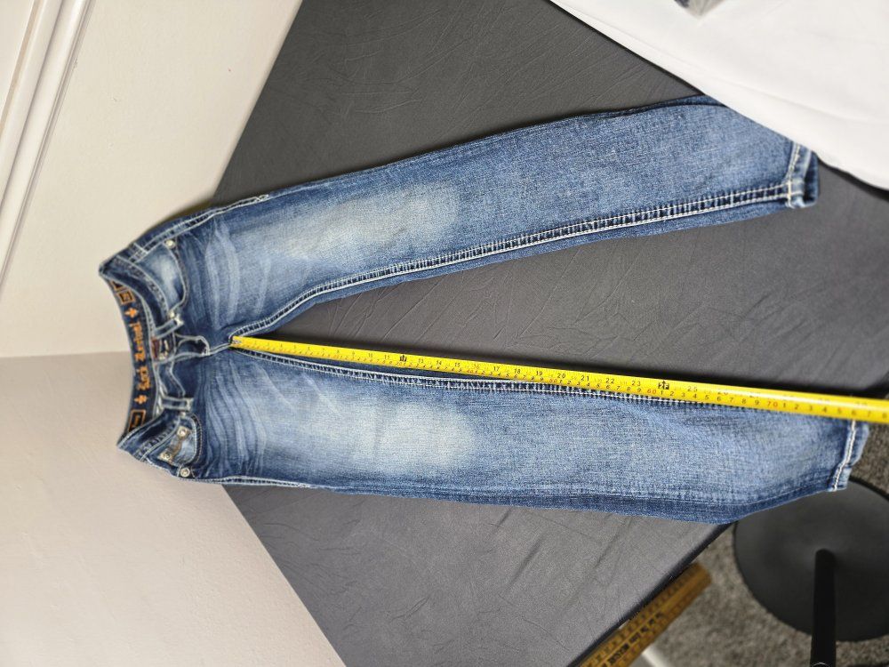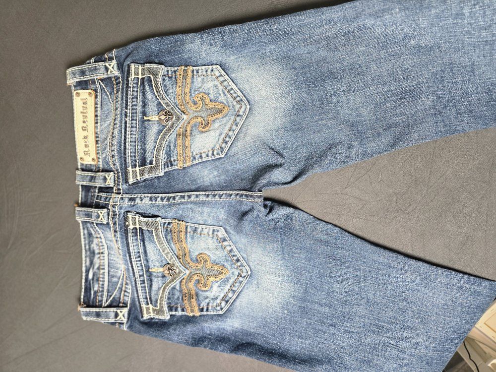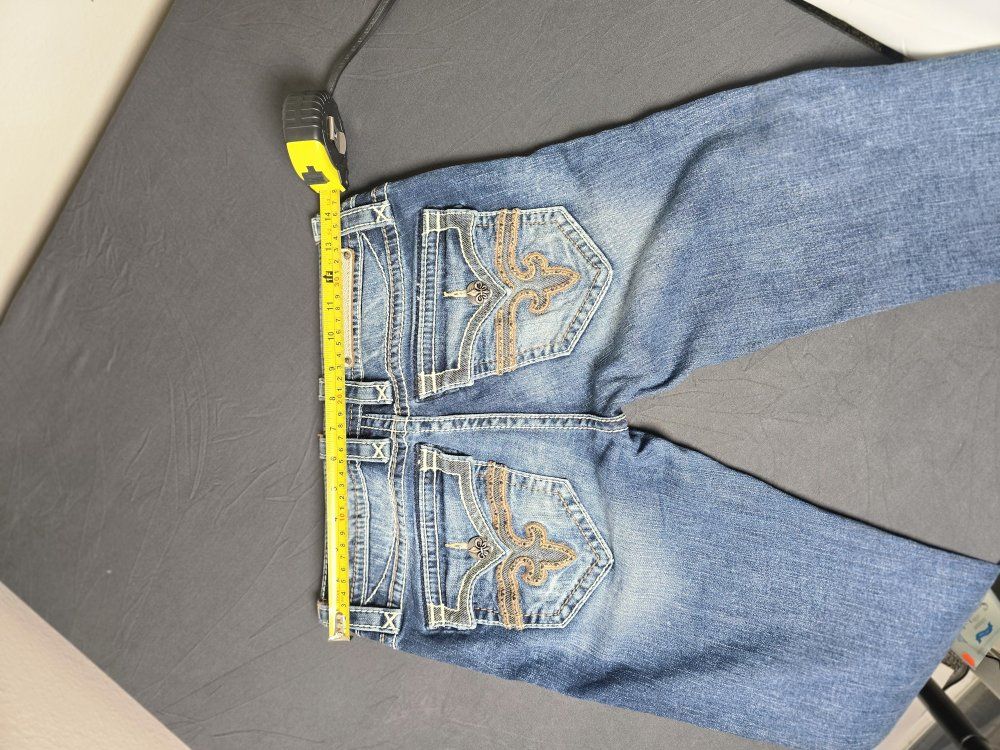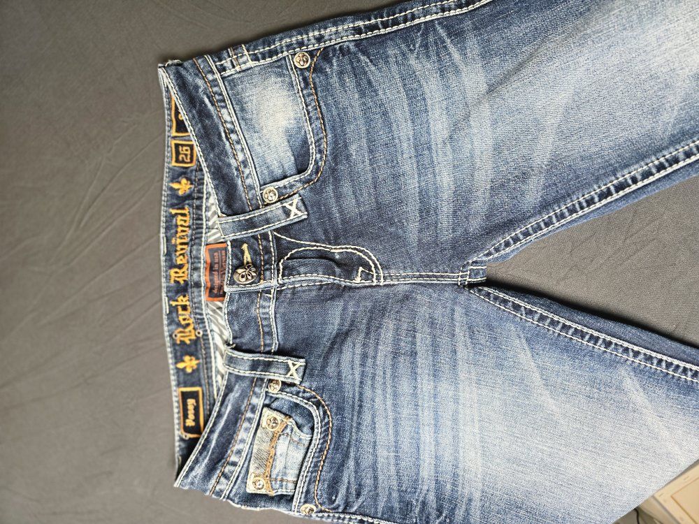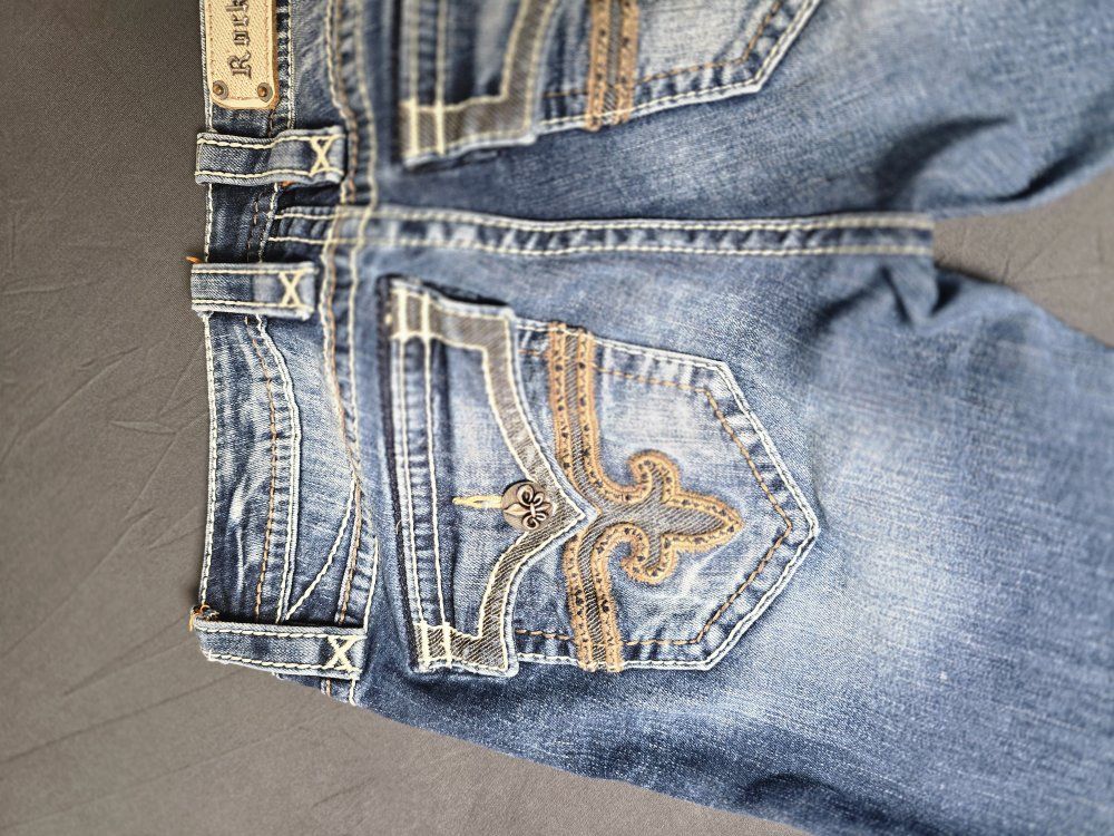 ZelleBrand: Rock Revival Model: Posey Skinny Size: 26 Condition: Pre-owned; excellent condition. (Check photos for hem and hardware details). Style & Design: Elevate your denim game with these authentic Rock Revival "Posey" Skinny Jeans. Known for their high-quality construction and standout aesthetic, these jeans feature: Signature Thick Stitching: Bold white contrast stitching throughout. Embellished Pockets: Beautifully detailed fleur-de-lis embroidery and hardware on the rear flap pockets. Flattering Fit: A sleek skinny silhouette that pairs perfectly with boots or heels. Premium Hardware: Branded copper-tone rivets and buttons.