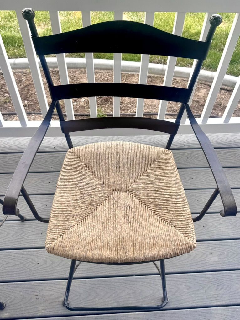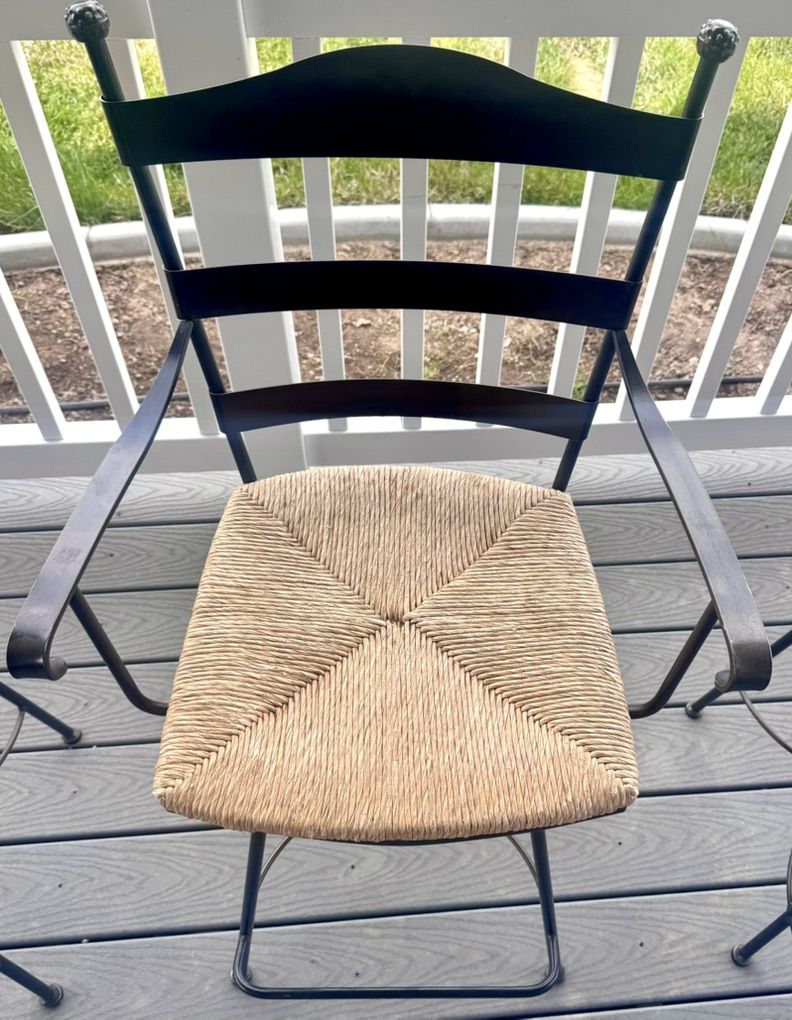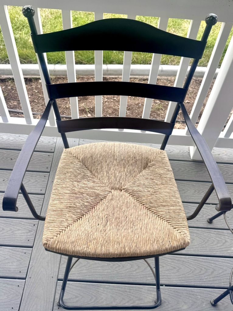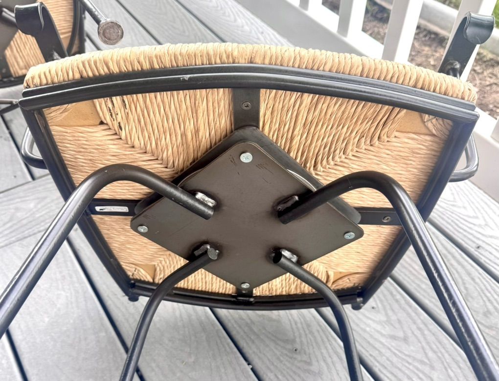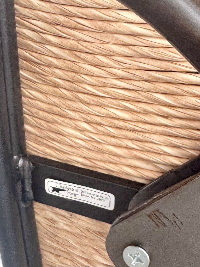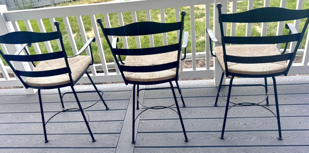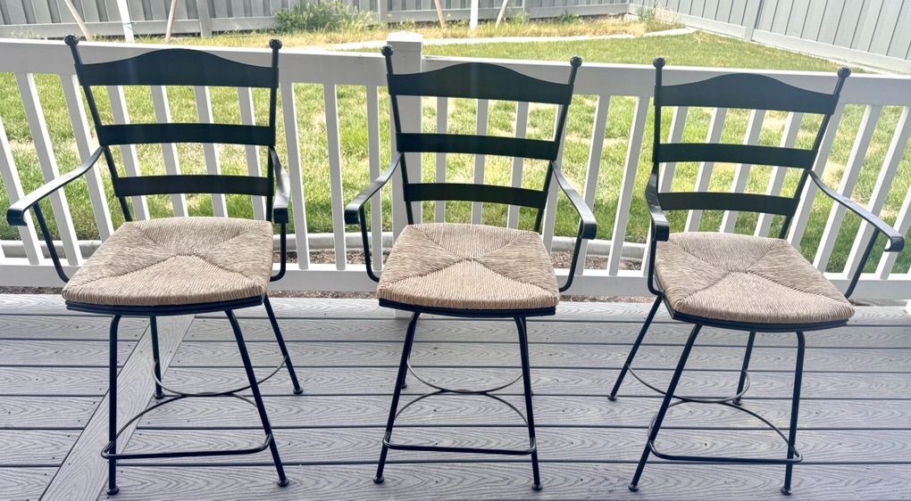 ApplePaySet of 3 Charleston Forge bar stools — beautifully made with hand-wrought metal frames, woven seats, and smooth swivel bases.