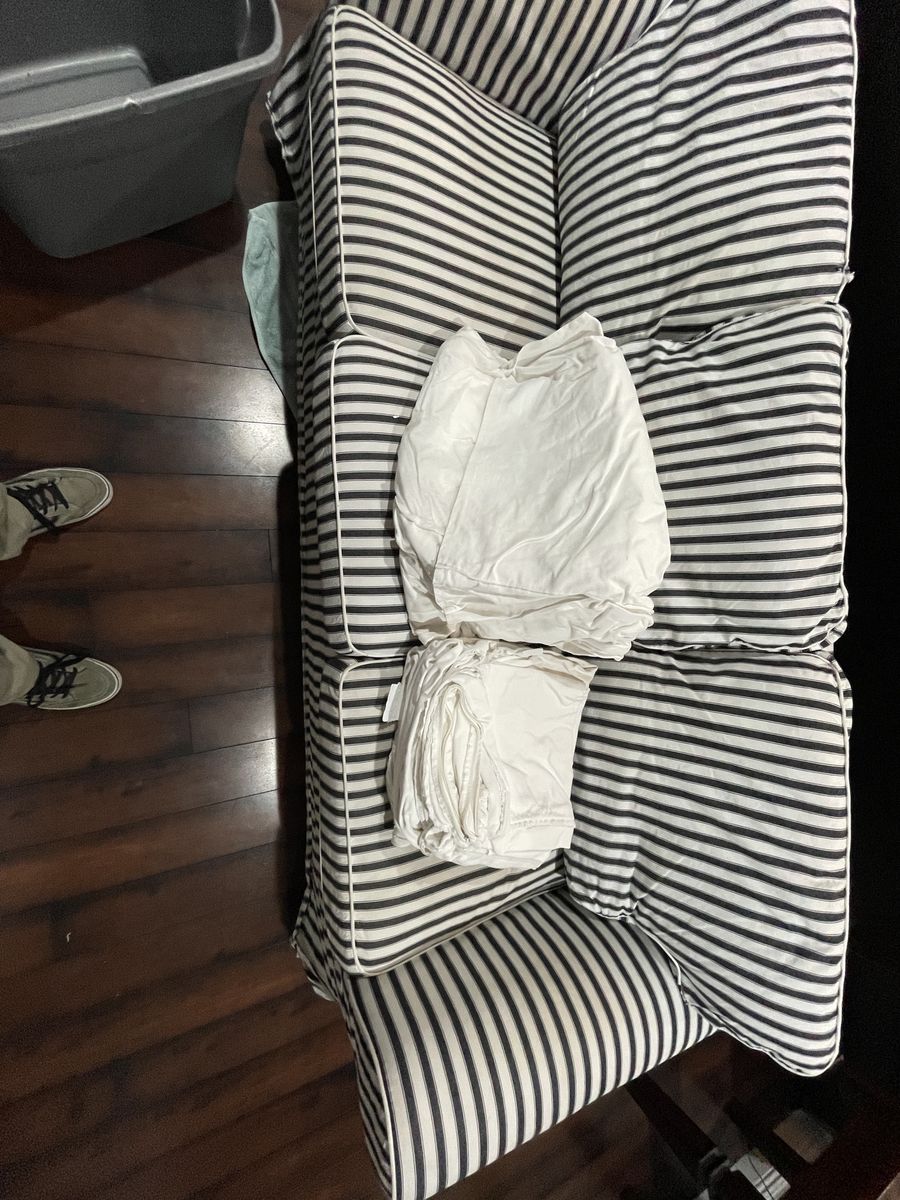 VenmoIt is a sofa. It has two removable and washable covers. Black stripes. And plain white. The stripes has two small holes. It is old but still sturdy.