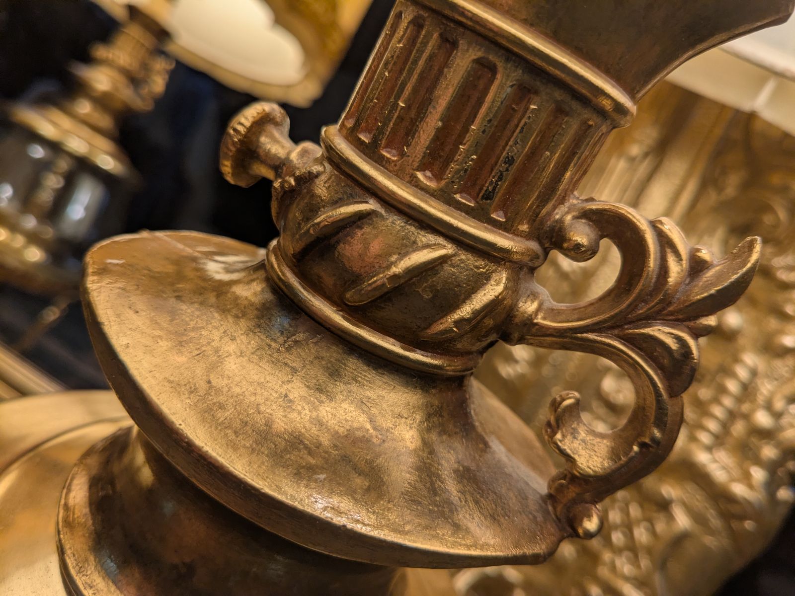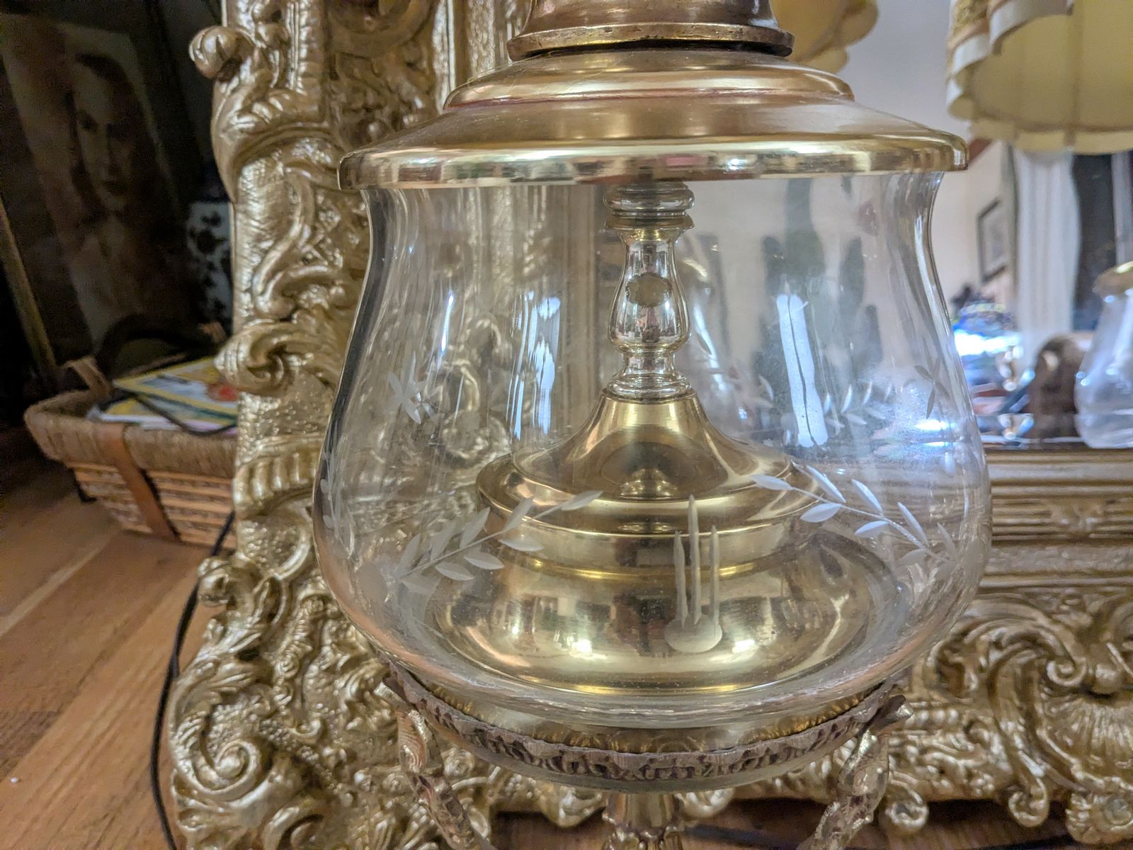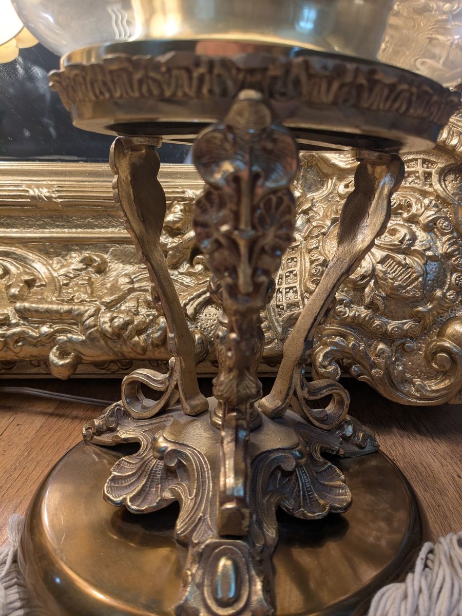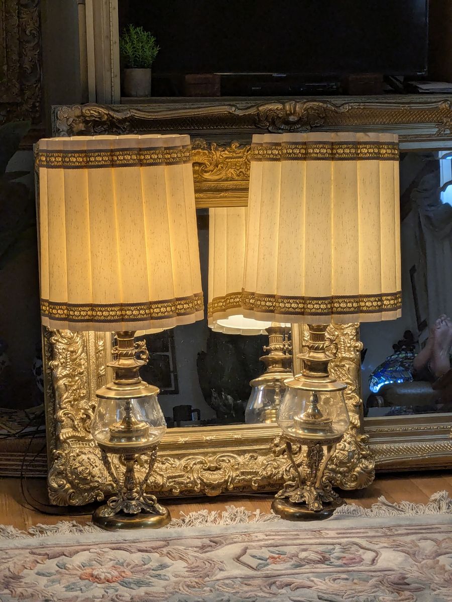 38" Gracious Hollywood Regency Brass and Glass Table lamps with Exquisite Antique Shades