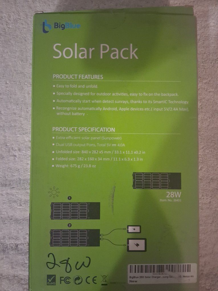 VenmoThe image shows the packaging for a BigBlue 28W Solar Pack, a portable solar charger designed for outdoor activities like camping and hiking.Key Features & SpecsPower Output: Provides up to 28 watts of solar power via high-efficiency monocrystalline solar cells.Charging Ports: Typically features up to 3 USB ports (USB-A or a mix of USB-A and USB-C depending on the specific model) with an output of 5V/2.4A per port.Design: Foldable and lightweight (approx. 1.5 lbs), making it easy to fit into a backpack.Durability: Features IP44 or IPX4 water resistance, protecting the panels from light rain or mist (though the USB ports should be kept dry).Smart Technology: Includes a "Smart IC" chip that automatically recognizes your device to deliver optimal charging speeds and safety features like overcurrent protection.How to UseUnfold: Open the panels fully and place them in direct sunlight. For best results, angle them at roughly 45° towards the sun.Connect: Plug your device (phone, tablet, or power bank) into one of the USB ports located inside the pocket.Monitor: Many models include a digital ammeter to show the current charging output in real-time.Note: This charger does not store energy internally; it only charges devices while in the sun.