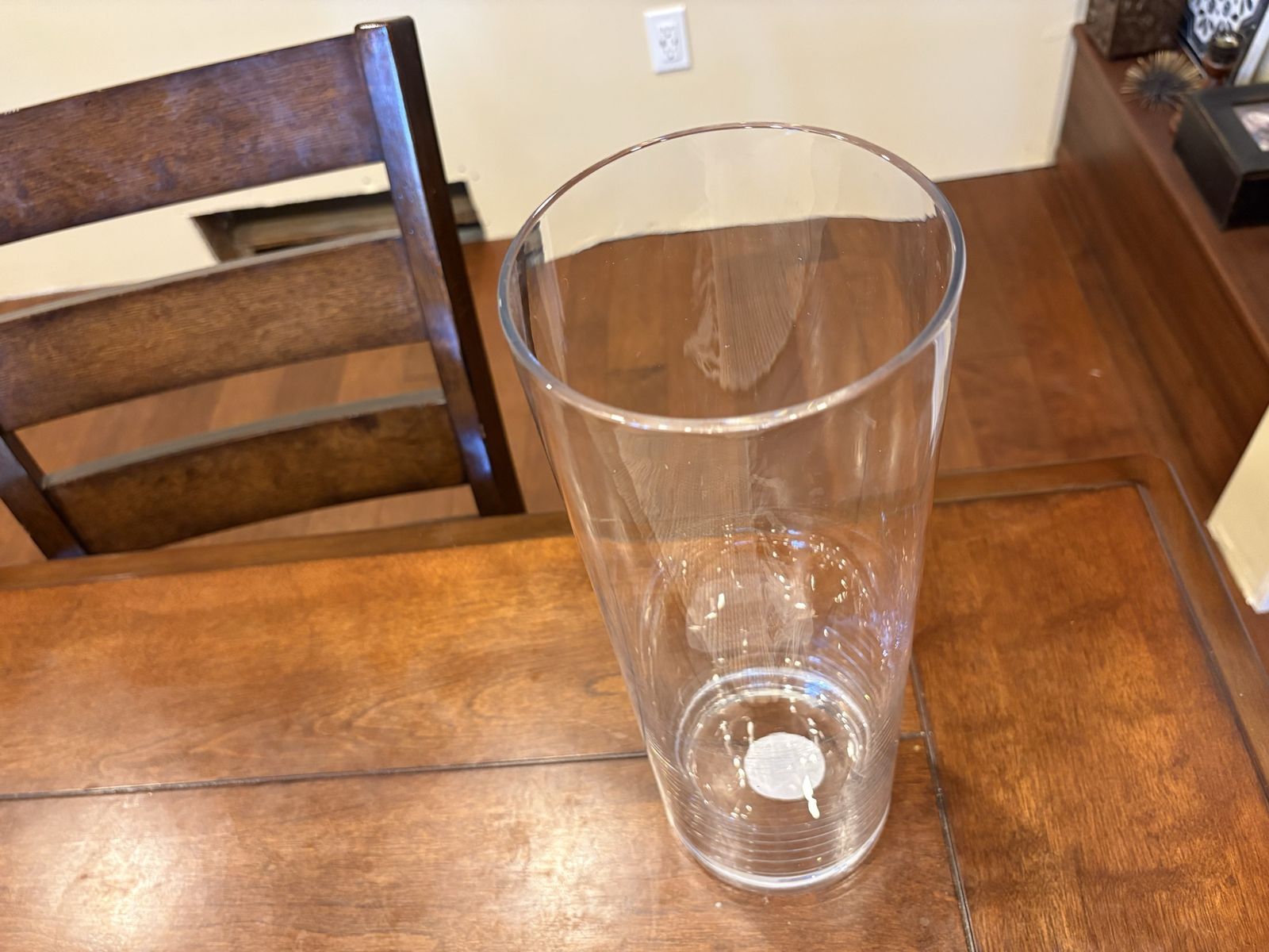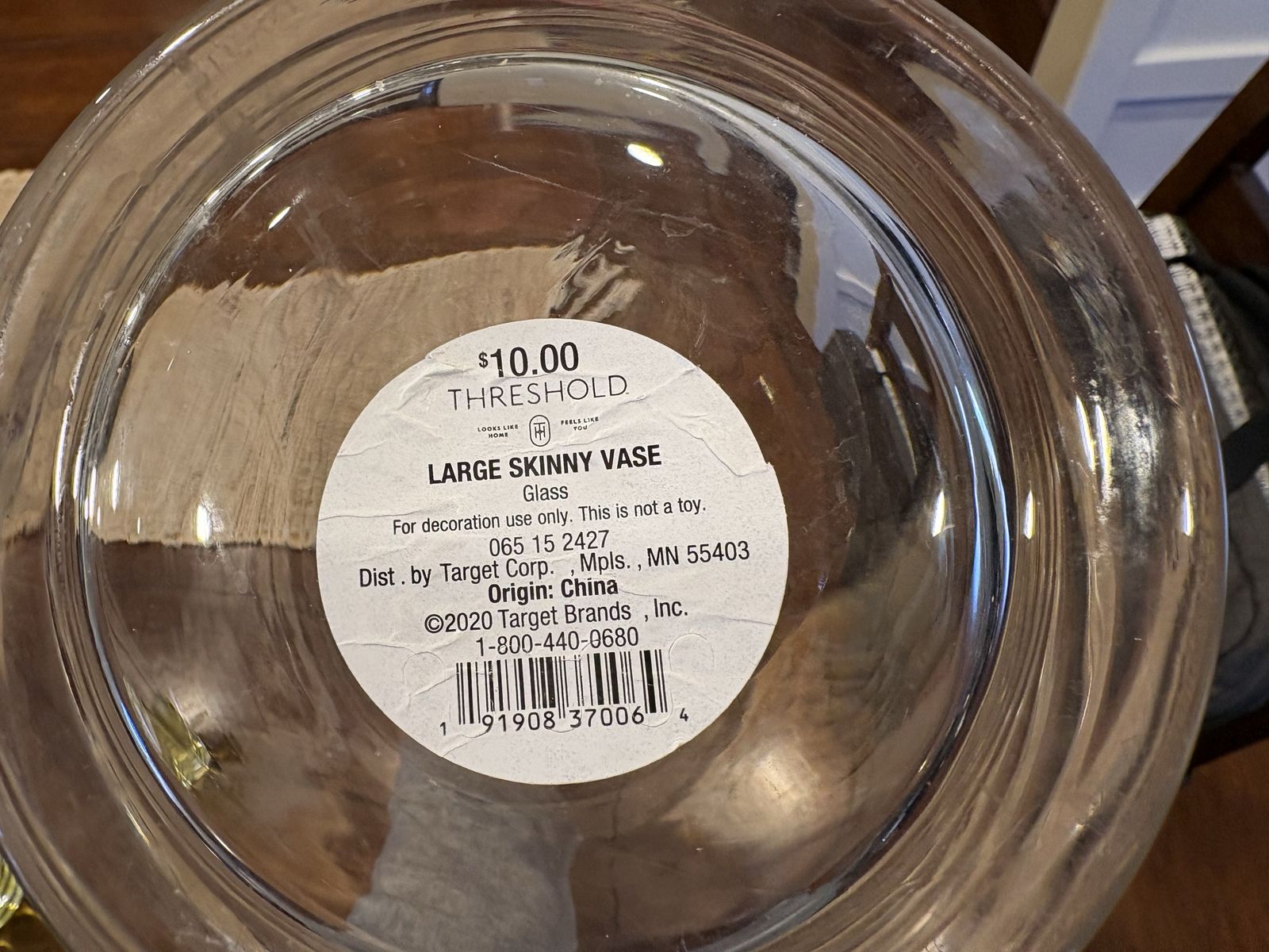 I have a tall clear glass cylinder vase. It is 14 inches tall and 4 3/4 inches wide. The sticker on the bottom shows it is a Threshold vase that was purchased at Target for $10. It’s in good condition but has a hard water line about halfway up. See my other ads for jewelry, artwork, home decor and more.