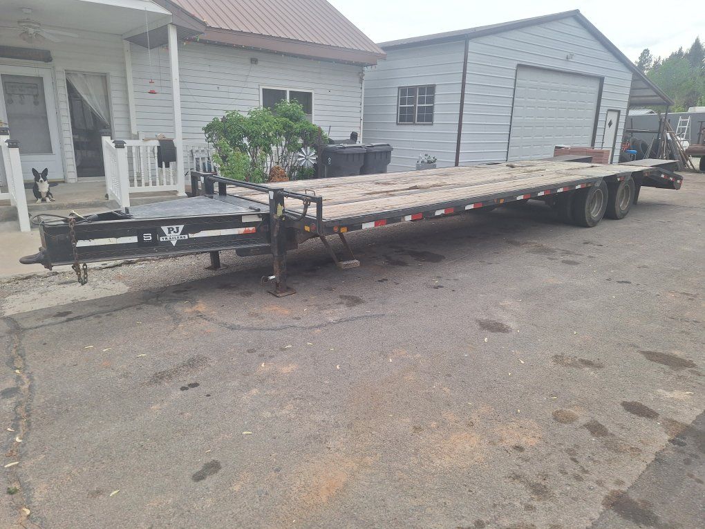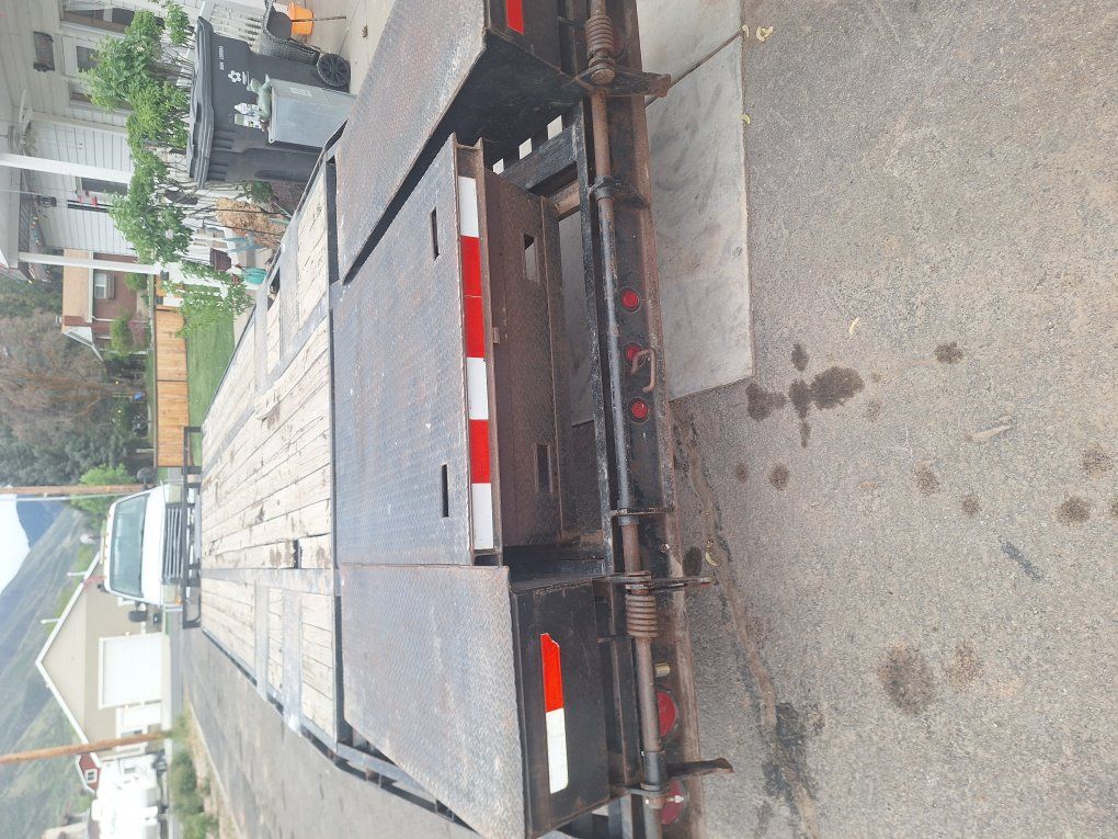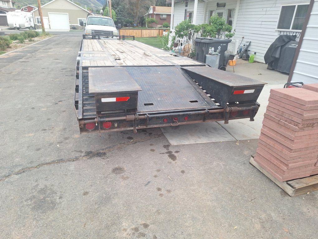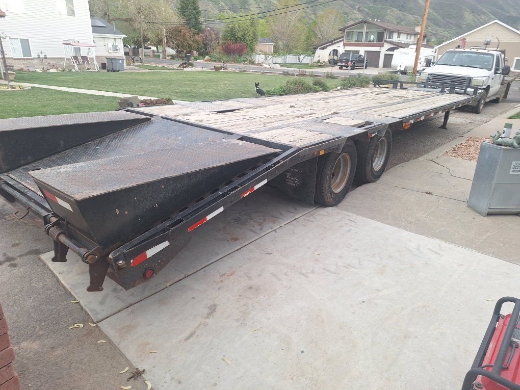 28 ft deck with 6 ft dove tail! Dual tandem! Center of dove tail lifts to make 34 ft of deck! really good trailer and heavy duty! 8 new tires!