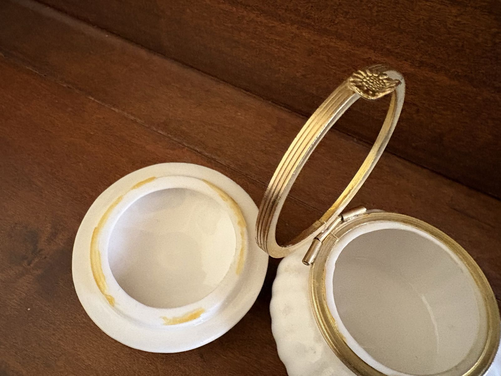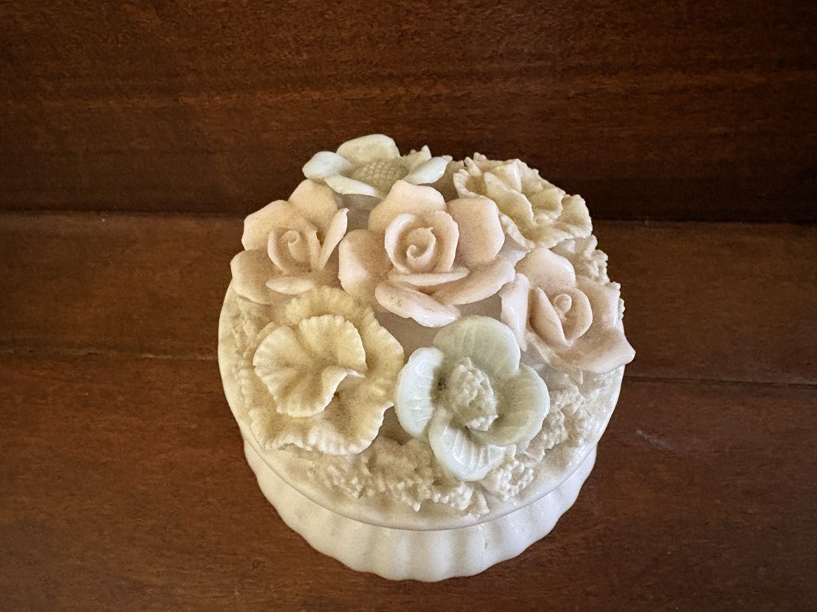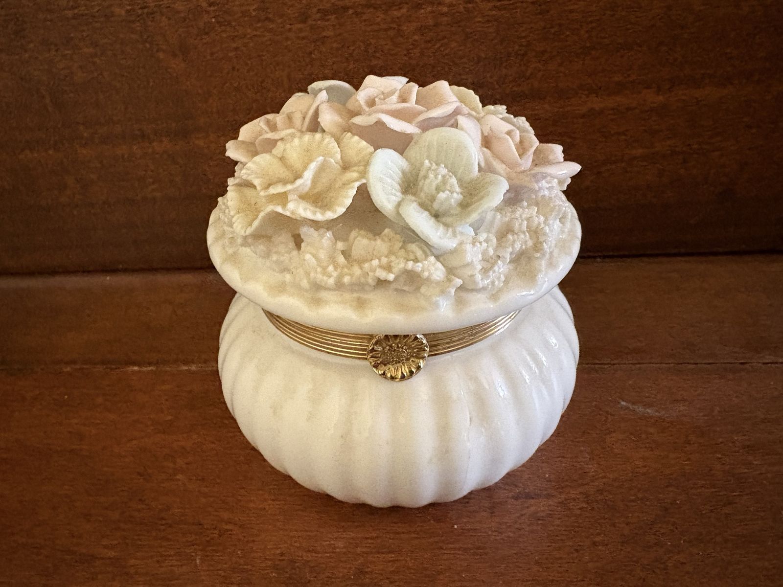 I have a vintage trinket box or jar. I don’t know if it’s ceramic, porcelain or glass. The lid is covered with flowers. There is a sticker on the bottom that says Japan. The lid has come out of the metal ring that is attached to the hinge and needs to be glued. There is also one petal broken on one of the flowers on the lid (see the last 2 pictures). It is just over 3 inches tall and 3 inches wide. See my other ads for jewelry, artwork, home decor and more.