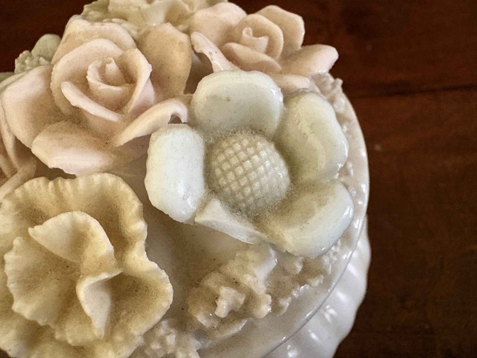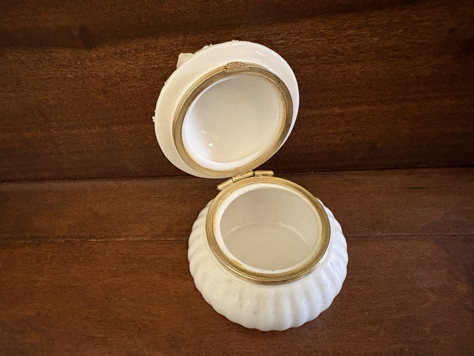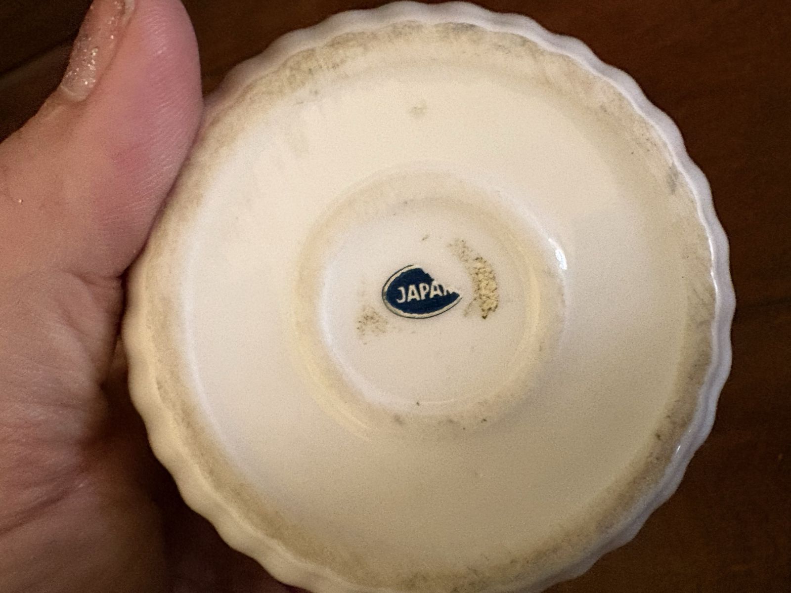 I have a vintage trinket box or jar. I don’t know if it’s ceramic, porcelain or glass. The lid is covered with flowers. There is a sticker on the bottom that says Japan. The lid has come out of the metal ring that is attached to the hinge and needs to be glued. There is also one petal broken on one of the flowers on the lid (see the last 2 pictures). It is just over 3 inches tall and 3 inches wide. See my other ads for jewelry, artwork, home decor and more.