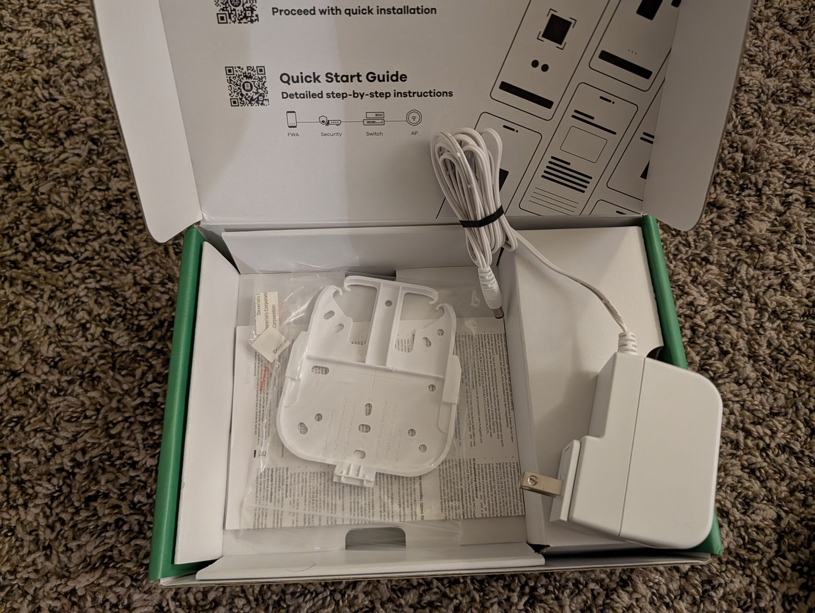 Inlcudes a power adapter (not needed if using PoE), and the original mounting hardware and box.